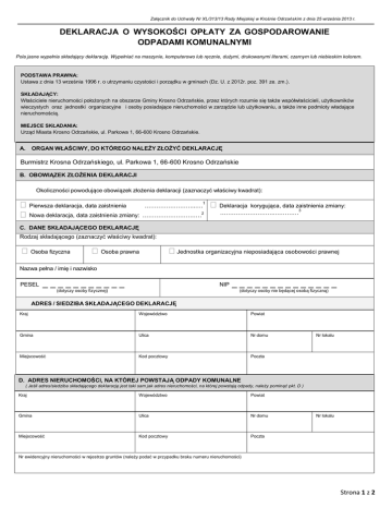 Załącznik do Uchwały Nr XL/313/13 Rady Miejskiej w Krośnie Odrzańskim z dnia 25 września 2013 r. DEKLARACJA O WYSOKOŚCI OPŁATY ZA GOSPODAROWANIE ODPADAMI KOMUNALNYMI Pola jasne wypełnia składający deklarację. Wypełniać na maszynie, komputerowo lub ręcznie, dużymi, drukowanymi literami, czarnym lub niebieskim kolorem. PODSTAWA PRAWNA: Ustawa z dnia 13 września 1996 r. o utrzymaniu czystości i porządku w gminach (Dz. U. z 2012r. poz. 391 ze. zm.). SKŁADAJĄCY: Właściciele nieruchomości położonych na obszarze Gminy Krosno Odrzańskie, przez których rozumie się także współwłaścicieli, użytkowników wieczystych oraz jednostki organizacyjne i osoby posiadające nieruchomości w zarządzie lub użytkowaniu, a także inne podmioty władające nieruchomością. MIEJSCE SKŁADANIA: Urząd Miasta Krosno Odrzańskie, ul. Parkowa 1, 66-600 Krosno Odrzańskie. A. ORGAN WŁAŚCIWY, DO KTÓREGO NALEŻY ZŁOŻYĆ DEKLARACJĘ Burmistrz Krosna Odrzańskiego, ul. Parkowa 1, 66-600 Krosno Odrzańskie B. OBOWIĄZEK ZŁOŻENIA DEKLARACJI Okoliczności powodujące obowiązek złożenia deklaracji (zaznaczyć właściwy kwadrat): ……………………..…. Pierwsza deklaracja, data zaistnienia 1 2 Nowa deklaracja, data zaistnienia zmiany: ………………………… Deklaracja korygująca, data zaistnienia zmiany: 3 ……………………….………… C. DANE SKŁADAJĄCEGO DEKLARACJĘ Rodzaj składającego (zaznaczyć właściwy kwadrat): Osoba fizyczna Osoba prawna Jednostka organizacyjna nieposiadająca osobowości prawnej Nazwa pełna / imię i nazwisko PESEL ___________ NIP ______________ (dotyczy osoby nie będącej osobą fizyczną) (dotyczy osoby fizycznej) ADRES / SIEDZIBA SKŁADAJĄCEGO DEKLARACJĘ Kraj Województwo Powiat Gmina Ulica Nr domu Miejscowość Kod pocztowy Poczta Nr lokalu D. ADRES NIERUCHOMOŚCI, NA KTÓREJ POWSTAJĄ ODPADY KOMUNALNE ( Jeśli adres/siedziba składającego deklarację jest taki sam jak adres nieruchomości, na której powstają odpady, należy pominąć pkt. D ) Kraj Województwo Powiat Gmina Ulica Nr domu Miejscowość Kod pocztowy Poczta Nr lokalu Nr ewidencyjny nieruchomości w rejestrze gruntów (należy podać w przypadku braku numeru nieruchomości) Strona 1 z 2 E. OPŁATA ZA GOSPODAROWANIE ODPADAMI KOMUNALNYMI Oświadczam, że na terenie nieruchomości , na której powstają odpady komunalne, SELEKTYWNY odpady gromadzone będą w sposób ( zaznaczyć właściwy kwadrat): NIESELEKTYWNY Liczba mieszkańców zamieszkujących nieruchomość , na której powstają odpady komunalne: Wysokość miesięcznej opłaty za gospodarowanie odpadami komunalnymi wynosi (iloczyn liczby mieszkańców i stawki opłaty): ………………………..…… …………………………….. (należy podać kwotę w zł) CZY NIERUCHOMOŚĆ WYPOSAŻONA JEST W KOMPOSTOWNIK 3 TAK (podać pojemność kompostownika: …………………… m ) NIE F. OŚWIADCZENIE I PODPIS SKŁADAJĄCEGO DEKLARACJĘ/OSOBY REPREZENTUJĄCEJ SKŁADAJĄCEGO DEKLARACJĘ …………………………………..…………. (data) …………………………..……………………………. (podpis osoby składającej) G. ADNOTACJE ORGANU ………………………………………. (data) ………………………………………. (podpis osoby przyjmującej) Pouczenie: Niniejsza deklaracja stanowi podstawę do wystawienia tytułu wykonawczego zgodnie z przepisami ustawy z dnia 17 czerwca 1966r. o postępowaniu egzekucyjnym w administracji (Dz. U. z 2012 r. poz. 1015 ze. zm.) Objaśnienia: 1 Właściciel nieruchomości jest obowiązany złożyć do Urzędu Miasta w Krośnie Odrzańskim deklarację o wysokości opłaty za gospodarowanie odpadami komunalnymi po raz pierwszy do 31 października 2013 r. Ponadto właściciel nieruchomości zobowiązany jest złożyć deklarację w terminie 14 dni od dnia zamieszkania na danej nieruchomości pierwszego mieszkańca lub powstania na danej nieruchomości odpadów komunalnych. 2 W przypadku zmiany danych będących podstawą ustalenia wysokości należnej opłaty za gospodarowanie odpadami komunalnymi (np. zmiana ilości osób zamieszkałych, przystąpienie bądź odstąpienie od zbierania odpadów w sposób selektywny) lub określonej w deklaracji ilości odpadów komunalnych powstających na danej nieruchomości właściciel nieruchomości jest obowiązany złożyć nową deklarację w terminie 14 dni od dnia nastąpienia zmiany. Opłatę za gospodarowanie odpadami komunalnymi w zmienionej wysokości uiszcza się za miesiąc, w którym nastąpiła zmiana. 3 W przypadku zmiany danych nie będących podstawą ustalenia należnej opłaty za gospodarowanie odpadami komunalnymi, (np. zmiana adresu zamieszkania, nazwiska) właściciel nieruchomości składa w ciągu 14 dni deklarację korygującą (art. 81 § 2 ustawy z dnia 29 sierpnia 1997 r. Ordynacja podatkowa). Skorygowanie deklaracji j następuje po złożeniu korygującej deklaracji wraz z dołączonym pisemnym uzasadnieniem przyczyn korekty. Strona 2 z 2