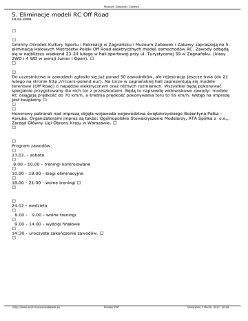 Muzeum Zabawek i Zabawy 5. Eliminacje modeli RC Off Road 18.02.2008. Gminny Ośrodek Kultury Sportu i Rekreacji w Zagnańsku i Muzeum Zabawek i Zabawy zapraszają na 5. eliminację Halowych Mistrzostw Polski Off Road elektrycznych modeli samochodów RC. Zawody odbędą się w najbliższy weekend 23-24 lutego w hali sportowej przy ul. Turystycznej 59 w Zagnańsku. (klasy 2WD i 4 WD w wersji Junior i Open). Do uczestnictwa w zawodach zgłosiło się już ponad 50 zawodników, ale rejestracja jeszcze trwa (do 21 lutego na stronie http://rccars-poland.eu/). Na torze w zagnańskiej hali zaprezentują się modele terenowe (Off Road) o napędzie elektrycznym oraz różnych rozmiarach. Wszystkie będą pokonywać specjalnie przygotowany dla nich tor z przeszkodami. Będą to naprawdę widowiskowe zawody: modele RC osiągają prędkość do 70 km/h, a średnia prędkość pokonywania toru to 55 km/h. Wstęp na imprezę jest bezpłatny Honorowy patronat nad imprezą objęła wojewoda województwa świętokrzyskiego Bożentyna Pałka Koruba. Organizatorami imprez są także: Ogólnopolskie Stowarzyszenie Modelarzy, ATA Spółka z o.o., Zarząd Główny Ligi Obrony Kraju w Warszawie. Program zawodów: 23.02. - sobota 9.00 - 10.00 - treningi kontrolowane 10.00 - 18.00 - biegi eliminacyjne 18.00 - 21.00 - wolne treningi 24.02 - niedziela 8.00 - 9.00 - wolne treningi 9.00 - 14.00 - wyścigi finałowe 14:30 - uroczyste zakończenie zawodów. http://www.arch.muzeumzabawek.eu Kreator PDF Utworzono 7 March, 2017, 20:48