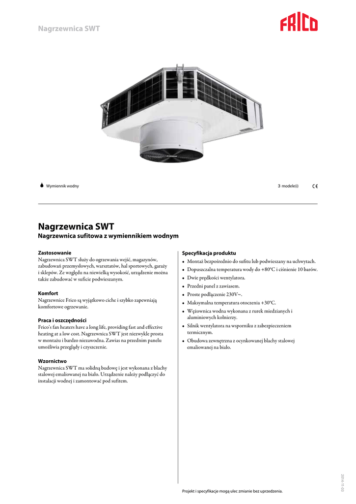Nagrzewnica SWT 2 3 modele(i) Wymiennik wodny Nagrzewnica SWT Nagrzewnica sufitowa z wymiennikiem wodnym Zastosowanie Nagrzewnica SWT służy do ogrzewania wejść, magazynów, zabudowań przemysłowych, warsztatów, hal sportowych, garaży i sklepów. Ze względu na niewielką wysokość, urządzenie można także zabudować w suficie podwieszanym. Specyfikacja produktu • Montaż bezpośrednio do sufitu lub podwieszany na uchwytach. • Dopuszczalna temperatura wody do +80°C i ciśnienie 10 barów. • Dwie prędkości wentylatora. • Przedni panel z zawiasem. Komfort Nagrzewnice Frico są wyjątkowo ciche i szybko zapewniają komfortowe ogrzewanie. Praca i oszczędności Frico's fan heaters have a long life, providing fast and effective heating at a low cost. Nagrzewnica SWT jest niezwykle prosta w montażu i bardzo niezawodna. Zawias na przednim panelu umożliwia przeglądy i czyszczenie. • Proste podłączenie 230V~. • Maksymalna temperatura otoczenia +30°C. • Wężownica wodna wykonana z rurek miedzianych i aluminiowych kołnierzy. • Silnik wentylatora na wsporniku z zabezpieczeniem termicznym. • Obudowa zewnętrzna z ocynkowanej blachy stalowej emaliowanej na biało. Wzornictwo Nagrzewnica SWT ma solidną budowę i jest wykonana z blachy stalowej emaliowanej na biało. Urządzenie należy podłączyć do instalacji wodnej i zamontować pod sufitem. 2014-11-03 Projekt i specyfikacje mogą ulec zmianie bez uprzedzenia. Nagrzewnica SWT Dane techniczne | Typ 2 Nagrzewnica SWT z wymiennikiem wodnym ∆t*1,3 Air throw*4 with extension collar [°C] Zasięg strumienia powietrza*4 [m] 33/29 2,2/4 4/7 44/57 25/22 2,7/4,5 5/8 48/60 34/30 4,5/7,5 7/12 Moc grzewcza* Wydajność powietrza Wydajność powietrza Poziom głośności*2 [kW] [m3/h] [m3/s] [dB(A)] SWT02 7,8/11 700/1100 0,19/0,31 37/53 SWT12 14/18 1300/2000 0,36/0,56 SWT22 29/40 2500/3900 0,69/1,08 Typ Pojemność wymiennika*5 Napięcie [l] [V] Natężenie [A] DxWxS [mm] Waga [kg] 1 [m] SWT02 1,2 230V~ 0,4 705x535x330 19 SWT12 1,7 230V~ 0,6 825x675x355 26 SWT22 3,9 230V~ 1,0 1135x735x415 41 *1) Przy temperaturze wody 80/60ºC, temperatura powietrza +15ºC. *2) Warunki: Odległość do urządzenia 5 m. *3) ∆t = wzrost temperatury strumienia powietrza przy maks. mocy grzewczej i min./ maks. prędkości przepływu. *4) Dane dotyczące zasięgu strugi powietrza zostały wyznaczone przy zastosowaniu poziomej kierownicy powietrza i przy temperaturze powietrza wylotowego +40ºC oraz temperaturze w pomieszczeniu +18ºC. Zasięg strugi jest definiowany jako odległość mierzona w osi wyrzutu aparatu grzewczego gdzie prędkość powietrza spada do wartości 0,2m/s *5) Pojemność wymiennika Stopień ochrony: IPX4. Certyfikat CE. Nagrzewnica SWT Wymiary C Ø12 (4x) F D [mm] B E [mm] SWT02 535 640 280 670 705 SWT12 675 760 420 790 825 SWT22 735 1070 480 1100 1135 Type F [mm] G [mm] H [mm] K [mm] ØL [mm] A ØM [mm] SWT02 125 195 330 135 305 22 SWT12 115 195 355 160 355 22 SWT22 110 300 415 115 430 28 H C [mm] G B [mm] ØM K A [mm] 30 Type D E Ø5,5(16x) ØL Montaż i podłączenie Montaż Nagrzewnicę SWT mocuje się bezpośrednio do sufitu lub podwiesza na uchwytach. Nagrzewnicę przykręca się do sufitu za pomocą uchwytów. Minimalne wymiary do montażu na stałe zawiera schemat 1. Connection of heating coil Dopływ wody, z zaworem lub bez, podłącza się do najniższego, natomiast odpływ do najwyższego króćca nagrzewnicy. Podłączenia do urządzeń SWT02 i SWT12 mają średnicę 22 mm,, gwint zewnętrzny, a w modelu SWT22 – 28 mm i także gwint zewnętrzny. Zawór odpowietrzający należy podłączyć w wysoko położonym punkcie poza urządzeniem lub na rurze wylotowej w instalacji. Zawory odpowietrzający i spustowy nie są dostarczane z urządzeniem. Instalacje narażone na mróz należy wyposażyć w zewnętrzną automatyczną ochronę przed mrozem, aby zagwarantować, że wężownica wodna nie pęknie w wyniku zamarznięcia. Przyłącze Nagrzewnice SWT są przeznaczone do montażu stacjonarnego i podłączane przez wybijane otwory z tyłu urządzenia. Min 600mm Min 600mm Min 800mm Rys. 1: Minimalna odległość przy montażu stacjonarnym. Nagrzewnica SWT Opcje sterowania Tylko sterowanie przez termostat Termostat włącza/wyłącza wentylator, a także reguluje dopływ ciepła. Wentylator jest ustawiony do pracy z wysoką prędkością. Kompletny zestaw sterowania stanowią: Tylko 5-stopniowa regulacja przepływu powietrza 5-stopniowa ręczna regulacja przepływu powietrza. Brak regulacji ogrzewania, maksymalny przepływ wody przez wężownicę grzejną. Kompletny zestaw sterowania stanowią: • KRT1900 lub TKS16, termostat pokojowy • TVVS20/25, zawór 2-drogowy lub TRVS20/25 zawór 3-drogowy + SD20, siłownik • RE1,5, regulator 5-stopniowy, maks. 1,5 A, lub RE3, regulator 5-stopniowy, maks. 3 A, lub RE7, regulator 5-stopniowy, maks. 7 A Tylko 2-stopniowa regulacja przepływu powietrza 2-stopniowa ręczna regulacja przepływu powietrza. Brak regulacji ogrzewania, maksymalny przepływ wody przez wężownicę grzejną. Kompletny zestaw sterowania stanowią: Termostat i 5-stopniowa regulacja Termostat włącza/wyłącza wentylator, a także reguluje dopływ ciepła. 5-stopniowa ręczna regulacja przepływu powietrza. Kompletny zestaw sterowania stanowią: • CB20, panel sterowania • RE1,5, regulator 5-stopniowy, maks. 1,5 A, lub RE3, regulator 5-stopniowy, maks. 3 A, lub RE7, regulator 5-stopniowy, maks. 7 A Termostat i 2-stopniowa regulacja Termostat włącza/wyłącza wentylator, a także reguluje dopływ ciepła. 2-stopniowa ręczna regulacja przepływu powietrza. Kompletny zestaw sterowania stanowią: • CB20, panel sterowania • KRT1900 lub TKS16, termostat pokojowy • TVVS20/25, zawór 2-drogowy lub TRVS20/25 zawór 3-drogowy + SD20, siłownik • KRT1900 lub TKS16, termostat pokojowy • TVVS20/25, zawór + SD20, siłownik Dodatkowe informacje i opcje zawiera sekcja „Sterowanie”. Sterowanie 15