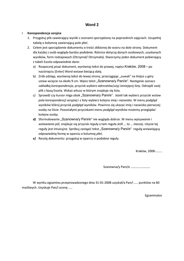 Word 2 I Korespondencja seryjna 1. Przygotuj plik zawierający wyniki z ocenami sporządzony na poprzednich zajęciach. Uzupełnij tabelę o kolumnę zawierającą pole płeć. 2. Celem jest sporządzenie dokumentu o treści zbliżonej do wzoru na dole strony. Dokument dla każdej z osób wygląda bardzo podobnie. Różnice dotyczą danych osobowych, uzyskanych wyników, form rodzajowych (Otrzymał/ Otrzymała). Stworzymy jeden dokument pobierający z tabeli Excela odpowiednie dane: a) Rozpocznij pisać dokument, wyrównaj tekst do prawej, napisz Kraków, 2008 – po naciśnięciu [Enter] Word wstawi bieżącą datę. b) Zrób odstęp, wyrównaj tekst do lewej strony, przeciągając „suwak” na linijce u góry ustaw wcięcie na około 9 cm. Wpisz tekst „Szanowna/y Pani/e”. Następnie zaznacz zakładkę korespondencja, przycisk wybierz adresatów/użyj istniejącej listy. Odnajdź swój plik z bazą Excela. Wskaż arkusz w którym znajduje się lista. c) Sprawdź czy kursor miga obok „Szanowna/y Pani/e”. Jeżeli tak wybierz przycisk wstaw pola korespondencji seryjnej i z listy wybierz kolejno imię i nazwisko. W menu podgląd wyników kliknij przycisk podgląd wyników. Powinno się ukazać imię i nazwisko pierwszej osoby na liście. Pozostałymi przyciskami menu podgląd wyników możemy przeglądać kolejne osoby. d) Sformułowanie „Szanowna/y Pani/e” nie wygląda dobrze. W menu wpisywanie i wstawianie pól, znajduje się przycisk reguły a tam reguła Jeśli … to … inaczej. Użycie tej reguły jest intuicyjne. Spróbuj zastąpić tekst „Szanowna/y Pani/e” regułą wstawiającą odpowiednią formę w oparciu o kolumnę płeć. e) Resztę dokumentu przygotuj w oparciu o podobne reguły. Kraków, 2008-…….. Szanowna/y Pani/e ……………………. W wyniku egzaminu przeprowadzonego dnia 31-01-2008 uzyskał/a Pan/i ….. punktów na 60 możliwych. Uzyskuje Pan/i ocenę ….. Egzaminator II Grafika w programie Word Narysuj rysunek podobny do wzoru. Wskazówki: 1. Wybierz wstawianie, kształty. 2. Zbuduj rysunek w oparciu o równoległoboki. Po wstawieniu rysunku pojawia się szereg punktów charakterystycznych. W szczególności: a) zielona kropka służy do obracania rysunku, b) żółty romb do zmiany kształtu, c) inne punkty do zmiany rozmiaru, d) w menu rozmieszczenie znajdują się opcje obrotu. e) Opcje przerzuć na wierzch/ pod spód pozwalają ustalić np. czy prawa ścianka ma przysłaniać częściowo półki. 3. Po narysowaniu np. lewych drzwi skopiuj je a następnie przerzuć w pionie. 4. Dla wygody można włączyć linie siatki. 5. Aby opisać strzałki długościami wstawiamy pole tekstowe na strzałce. 80cm 92cm 152cm 35cm