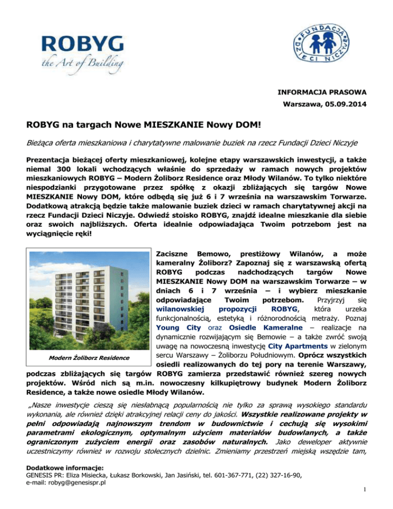 INFORMACJA PRASOWA Warszawa, 05.09.2014 ROBYG na targach Nowe MIESZKANIE Nowy DOM! Bieżąca oferta mieszkaniowa i charytatywne malowanie buziek na rzecz Fundacji Dzieci Niczyje Prezentacja bieżącej oferty mieszkaniowej, kolejne etapy warszawskich inwestycji, a także niemal 300 lokali wchodzących właśnie do sprzedaży w ramach nowych projektów mieszkaniowych ROBYG – Modern Żoliborz Residence oraz Młody Wilanów. To tylko niektóre niespodzianki przygotowane przez spółkę z okazji zbliżających się targów Nowe MIESZKANIE Nowy DOM, które odbędą się już 6 i 7 września na warszawskim Torwarze. Dodatkową atrakcją będzie także malowanie buziek dzieci w ramach charytatywnej akcji na rzecz Fundacji Dzieci Niczyje. Odwiedź stoisko ROBYG, znajdź idealne mieszkanie dla siebie oraz swoich najbliższych. Oferta idealnie odpowiadająca Twoim potrzebom jest na wyciągnięcie ręki! Zaciszne Bemowo, prestiżowy Wilanów, a może kameralny Żoliborz? Zapoznaj się z warszawską ofertą ROBYG podczas nadchodzących targów Nowe MIESZKANIE Nowy DOM na warszawskim Torwarze – w dniach 6 i 7 września – i wybierz mieszkanie odpowiadające Twoim potrzebom. Przyjrzyj się wilanowskiej propozycji ROBYG, która urzeka funkcjonalnością, estetyką i różnorodnością metraży. Poznaj Young City oraz Osiedle Kameralne – realizacje na dynamicznie rozwijającym się Bemowie – a także zwróć swoją uwagę na nowoczesną inwestycję City Apartments w zielonym sercu Warszawy – Żoliborzu Południowym. Oprócz wszystkich Modern Żoliborz Residence osiedli realizowanych do tej pory na terenie Warszawy, podczas zbliżających się targów ROBYG zamierza przedstawić również szereg nowych projektów. Wśród nich są m.in. nowoczesny kilkupiętrowy budynek Modern Żoliborz Residence, a także nowe osiedle Młody Wilanów. „Nasze inwestycje cieszą się niesłabnącą popularnością nie tylko za sprawą wysokiego standardu wykonania, ale również dzięki atrakcyjnej relacji ceny do jakości. Wszystkie realizowane projekty w pełni odpowiadają najnowszym trendom w budownictwie i cechują się wysokimi parametrami ekologicznym, optymalnym użyciem materiałów budowlanych, a także ograniczonym zużyciem energii oraz zasobów naturalnych. Jako deweloper aktywnie uczestniczymy również w rozwoju stołecznych dzielnic. Zmieniamy przestrzeń miejską wszędzie tam, Dodatkowe informacje: GENESIS PR: Eliza Misiecka, Łukasz Borkowski, Jan Jasiński, tel. 601-367-771, (22) 327-16-90, e-mail: [email protected] 1 gdzie realizowane są nasze projekty. Planując nasze przedsięwzięcia, zawsze stawiamy sobie za cel uczynienie z nich atrakcji architektonicznych nie tylko dla mieszkańców, ale i dla miasta. Zależy nam również, aby były konkurencyjne cenowo i tym samym dostępne zarówno dla singli, jak i rodzin. Podczas nadchodzących targów szczególnej uwadze polecamy kilka nowych projektów, które właśnie wprowadzamy do sprzedaży. Są wśród nich inwestycje Modern Żoliborz Residence – około 150 mieszkań – i osiedle Młody Wilanów, gdzie w pierwszym etapie planujemy oddać około 112 lokali. Realizując kolejne projekty, tworzymy nie tylko mieszkania, ale także miejsca, w których nasi klienci będą czuli się komfortowo i bezpiecznie. Dbamy o rozwój infrastruktury w obrębie osiedli, a także tworzymy przestrzeń, która sprzyja integracji mieszkańców. Serdecznie zapraszamy do odwiedzenia naszego stoiska i wierzymy, że nasi goście również aktywnie włączą się do wspólnego pomagania innym w związku z przygotowaną wspólnie przez ROBYG i Fundację Dzieci Niczyje akcją charytatywną” – mówi Oscar Kazanelson, Przewodniczący Rady Nadzorczej ROBYG SA Oprócz prezentacji bieżącej oferty mieszkaniowej, ROBYG postanowił wykorzystać zbliżające się wydarzenie i zaangażować uczestniczących w nim gości do wspólnej akcji, której celem jest pomoc potrzebującym dzieciom. Dzięki współpracy z Fundacją Dzieci Niczyje powstał pomysł zabawy, w której bezpłatny udział wziąć mogą najmłodsi. W ramach projektu przewidziano malowanie buziek maluchom, które odwiedzą stoisko ROBYG. Za każdą z nich ROBYG podaruje 100 złotych na rzecz Fundacji. Więcej informacji www.robyg.pl Dodatkowe informacje: GENESIS PR: Eliza Misiecka, Łukasz Borkowski, Jan Jasiński, tel. 601-367-771, (22) 327-16-90, e-mail: [email protected] 2