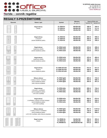 10 OFFICE meble biurowe tel. 22 280 90 10 kom. 885 80 10 10 www.10office.pl florida – cennik regałów REGAŁY 5-PRZEŚWITOWE Rysunek Cena w PLN netto wieniec 18 wieniec 25 Nazwa i opis Symbol Wymiary dł. x gł. x h Regał aktowy otwarty FL-R58-5o FL-R56-5o FL-R54-5o 80x38x182 60x38x182 40x38x182 308 zł 279 zł 250 zł 344 zł 311 zł 279 zł Regał aktowy z drzwiami zamek dodatkowo płatny FL-R58-5d FL-R56-5d FL-R54-5d 80x38x182 60x38x182 40x38x182 493 zł 405 zł 319 zł 550 zł 453 zł 356 zł Regał aktowy częściowo otwarty zamek dodatkowo płatny FL-R58-3o2d FL-R56-3o2d FL-R54-3o2d 80x38x182 60x38x182 40x38x182 410 zł 344 zł 278 zł 458 zł 384 zł 310 zł Regał aktowy częściowo otwarty zamek dodatkowo płatny FL-R58-2o3d FL-R56-2o3d FL-R54-2o3d 80x38x182 60x38x182 40x38x182 433 zł 362 zł 290 zł 484 zł 404 zł 324 zł Regał aktowy dzielony zamki dodatkowo płatne FL-R58-2d1o2d FL-R56-2d1o2d FL-R54-2d1o2d 80x38x182 60x38x182 40x38x182 512 zł 420 zł 328 zł 571 zł 469 zł 366 zł Witryna aktowa z szybą w ramce i drzwiami zamki dodatkowo płatne szkło mleczne (dopłata) FL-R58-3g2d FL-R56-3g2d FL-R54-3g2d 80x38x182 60x38x182 40x38x182 665 zł 534 zł 404 zł 743 zł 596 zł 451 zł Regał aktowy z drzwiami i szufladami zamki dodatkowo płatne w 40 i 60 2 szuflady FL-R58-4d4s FL-R56-4d2s FL-R54-4d2s 80x38x182 60x38x182 40x38x182 666 zł 560 zł 457 zł 744 zł 625 zł 510 zł Regał aktowy z szufladami, wysoka na teczki wiszące zamki dodatkowo płatne w 40 i 60 2 szuflady FL-R58-4o3s FL-R56-4o2s FL-R54-4o2s 80x38x182 60x38x182 40x38x182 604 zł 489 zł 376 zł 674 zł 546 zł 420 zł Witryna aktowa z szybą w ramce i szufladami zamki dodatkowo płatne w 40 i 60 2 szuflady, szkło mleczne (dopłata) FL-R58-4g4s FL-R56-4g2s FL-R54-4g2s 80x38x182 60x38x182 40x38x182 961 zł 752 zł 543 zł 1 073 zł 839 zł 606 zł Regał narożny otwarty FL-RN56-5o FL-RN54-5o FL-RN588-5o 54x38x182 38x38x182 80/38x80/38x182 352 zł 298 zł 615 zł 393 zł 333 zł 686 zł REGAŁY 4-PRZEŚWITOWE Rysunek Cena w PLN netto wieniec 18 wieniec 25 Nazwa i opis Symbol Wymiary dł. x gł. x h Regał aktowy otwarty FL-R48-4o FL-R46-4o FL-R44-4o 80x38x146 60x38x146 40x38x146 259 zł 224 zł 189 zł 289 zł 250 zł 211 zł Regał aktowy z drzwiami zamek dodatkowo płatny FL-R48-4d FL-R46-4d FL-R44-4d 80x38x146 60x38x146 40x38x146 419 zł 344 zł 269 zł 468 zł 384 zł 300 zł Regał aktowy częściowo otwarty zamek dodatkowo płatny FL-R48-2o2d FL-R46-2o2d FL-R44-2o2d 80x38x146 60x38x146 40x38x146 358 zł 299 zł 241 zł 400 zł 334 zł 269 zł Regał aktowy częściowo otwarty zamek dodatkowo płatny FL-R48-1o3d FL-R46-1o3d FL-R44-1o3d 80x38x146 60x38x146 40x38x146 383 zł 317 zł 251 zł 428 zł 354 zł 280 zł Witryna aktowa z szybą w ramce i szufladami zamki dodatkowo płatne w 40 i 60 2 szuflady, szkło mleczne (dopłata) FL-R48-3g4s FL-R46-3g2s FL-R44-3g2s 80x38x146 60x38x146 40x38x146 838 zł 652 zł 466 zł 935 zł 728 zł 520 zł Witryna aktowa z szybą w ramce i drzwiami zamek dodatkowo płatny szkło mleczne (dopłata) FL-R48-2g2d FL-R46-2g2d FL-R44-2g2d 80x38x146 60x38x146 40x38x146 493 zł 459 zł 375 zł 549 zł 502 zł 414 zł Regał aktowy z drzwiami przesuwnymi zamek dodatkowo płatny prowadnice brązowe FL-RR410-4d 100x38x146 542 zł 605 zł Regał narożny otwarty FL-RN46-4o FL-RN44-4o FL-RN488-4o 54x38x146 38x38x146 80/38x80/38x146 293 zł 250 zł 513 zł 328 zł 279 zł 573 zł Nazwa i opis Symbol Wymiary dł. x gł. x h Regał aktowy otwarty FL-R38-3o FL-R36-3o FL-R34-3o 80x38x110 60x38x110 40x38x110 206 zł 179 zł 152 zł 230 zł 200 zł 170 zł Regał aktowy z drzwiami zamek dodatkowo płatny FL-R38-3d FL-R36-3d FL-R34-3d 80x38x110 60x38x110 40x38x110 333 zł 274 zł 216 zł 371 zł 306 zł 241 zł Regał aktowy częściowo otwarty zamek dodatkowo płatny FL-R38-1o2d FL-R36-1o2d FL-R34-1o2d 80x38x110 60x38x110 40x38x110 308 zł 255 zł 204 zł 344 zł 285 zł 228 zł REGAŁY 3-PRZEŚWITOWE Rysunek Cena w PLN netto wieniec 18 wieniec 25 REGAŁY 3-PRZEŚWITOWE Rysunek Cena w PLN netto wieniec 18 wieniec 25 Nazwa i opis Symbol Wymiary dł. x gł. x h Regał aktowy z drzwiami i szufladami zamki dodatkowo płatne w 40 i 60 2 szuflady FL-R38-2d4s FL-R36-2d2s FL-R34-2d2s 80x38x110 60x38x110 40x38x110 635 zł 494 zł 354 zł 709 zł 551 zł 395 zł Regał aktowy z drzwiami przesuwnymi zamek dodatkowo płatny prowadnice brązowe FL-RR310-3dr 100x38x110 459 zł 513 zł Regał narożny otwarty FL-RN36-3o FL-RN34-3o FL-RN388-3o 54x38x110 38x38x110 80/38x80/38x110 235 zł 202 zł 411 zł 263 zł 225 zł 460 zł Nazwa i opis Symbol Wymiary dł. x gł. x h Regał aktowy otwarty FL-R28-2o FL-R26-2o FL-R24-2o 80x38x75 60x38x75 40x38x75 156 zł 134 zł 113 zł 174 zł 150 zł 126 zł Regał aktowy z drzwiami zamek dodatkowo płatny FL-R28-2d FL-R26-2d FL-R24-2d 80x38x75 60x38x75 40x38x75 259 zł 212 zł 165 zł 289 zł 236 zł 184 zł Regał aktowy z szufladami, wysoka na teczki wiszące zamki dodatkowo płatne w 40 i 60 2 szuflady FL-R28-1o3s FL-R26-1o2s FL-R24-1o2s 80x38x75 60x38x75 40x38x75 451 zł 347 zł 263 zł 504 zł 388 zł 294 zł Regał aktowy z szufladami, wysokie na teczki wiszące zamki dodatkowo płatne w 40 i 60 1 wysoka szuflada FL-R28-4s2w FL-R26-2s1w FL-R24-2s1w 80x38x75 60x38x75 40x38x75 728 zł 681 zł 384 zł 835 zł 785 zł 429 zł Regał aktowy z drzwiami przesuwnymi zamek dodatkowo płatny prowadnice brązowe FL-RR210-2dr 100x38x75 376 zł 420 zł Regał narożny otwarty FL-RN26-2o FL-RN24-2o FL-RN288-2o 54x38x75 38x38x75 80/38x80/38x75 178 zł 155 zł 310 zł 199 zł 173 zł 346 zł REGAŁY 2-PRZEŚWITOWE Rysunek Cena w PLN netto wieniec 18 wieniec 25 SZAFY UBRANIOWE Rysunek Cena w PLN netto wieniec 18 wieniec 25 Nazwa i opis Symbol Wymiary dł. x gł. x h Szafa ubraniowa z półką na górze zamek dodatkowo płatny FL-S586-5d FL-S546-5d FL-S546-5d 80x56x182 60x56x182 40x56x182 519 zł 403 zł 358 zł 579 zł 450 zł 400 zł Szafa ubraniowa z szufladami i półk