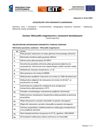 Załącznik nr 10 do SIWZ SZCZEGÓŁOWY OPIS PRZEDMIOTU ZAMÓWIENIA Dostawa, wraz z montażem i uruchomieniem, następującej aparatury naukowo – badawczej, fabrycznie nowej i kompletnej: Zestaw: Mieszadło magnetyczne z zestawem bezolejowym (nazwa aparatu) OBLIGATORYJNE (WYMAGANE) PARAMETRY/ FUNKCJE/ WARUNKI Minimalne parametry użytkowe – Mieszadło magnetyczne Lp. Cecha 1. Płyta grzejna wykonana ze stopu glinowo-krzemowego (silumin) 2. Minimalna średnica płyty grzejnej 140mm 3. Zakres pracy płyty grzejnej 20-300°C 4. Ceramiczna powłoka ochronna płyty grzewczej odporna na zarysowania, chemicznie oraz zapewniająca szybki transfer ciepła 5. Dokładność nastawy temperatury +/-1K 6. Moc grzewcza nie mniej niż 800W 7. Maksymalna prędkość mieszania nie mniej niż 1400 obrotów/min 8. Maksymalna objętość do mieszania nie mniej niż 20 dm3, w przeliczeniu na wodę 9. Automatyczny wyłącznik urządzenia przy przegrzaniu temperatury płyty grzejnej o 25°C 10. Pokrętło umożliwiające nastawienie prędkości obrotowej 11. Elektroniczne nastawianie temperatury płyty grzejnej za pomocą przycisków 12. Włącznik grzania z przodu mieszadła na panelu sterującym 13. Włącznik mieszania z przodu mieszadła na panelu sterującym 14. Cyfrowy wyświetlacz ciekłokrystaliczny wskazujący temperaturę oraz prędkość obrotów 15. Klasa bezpieczeństwa nie gorzej niż IP 32, zgodnie z DIN 60529 16. W komplecie silikonowa osłona ochronna na mieszadło Strona 1 z 3 Minimalne parametry użytkowe – Termometr kontaktowy Lp. Cecha 1. Zakres pracy termometru -50-300°C 2. Rozdzielczość nie gorsza niż +/-1K 3. Dokładność pomiaru temperatury +/-1K 4. Dokładność kontrolera nie gorsza niż +/-0.5°C 5. Element termoczuły Pt1000 6. Czujnik ze stali nierdzewnej 7. Wyświetlacz ciekłokrystaliczny 8. Cykl pomiarowy min. 1.5 sekundy 9. Klasa bezpieczeństwa nie gorsza niż IP 40 10. W zestawie pręt podtrzymujący, umożliwiający zamocowanie do mieszadła, oraz uchwyt czujnika temperatury Minimalne parametry użytkowe – Zestaw nakładek grzejnych Lp. Cecha 1. Zestaw nakładek grzejnych umożliwiających ogrzewanie kolb okrągłodennych bez zastosowania oleju silikonowego 2. Nakładka wielodołkowa z wkładkami redukcyjnymi do kolb o pojemności 25cm3, 50cm3 i 100cm3 3. Wykonane z aluminium, pokrytym PTFE 4. Nakładki powinny posiadać zdejmowane uchwyty do bezpiecznego przenoszenia nakładek 5. Możliwość pomiaru temperatury bloku za pomocą zewnętrznego czujnika temperatury mieszadła 6. Zakres pracy do maksymalnie 260°C Inne 1. Oprogramowanie: nie 2. Instruktaż: nie Strona 2 z 3 Warunki dostawy i gwarancji 1. Gwarancja: min. 36 miesięcy 2. Czas dostawy: maks. 50 dni 3. Czas testowania: 14 dni 4. Czas reakcji na zgłoszenie serwisowe: maks. 48 godzin 5. Maksymalny czas naprawy: 14 dni Kryteria oceny: CENA: waga 100% Strona 3 z 3