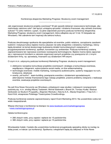 Pobrano z PlatformaKultury.pl 17.10.2013 Konferencja ekspercka Marketing Progress: Skuteczny event management ____________________________ Jak organizować skuteczne projekty eventowe? W jaki sposób dobierać nowoczesne technologie, aby realizowały założone cele? Jak łączyć umiejętną sprzedaż i działania finansowe, aby odnieść eventowy sukces? To tylko niektóre z pytań, na jakie odpowiedź poznamy podczas konferencji eksperckiej Marketing Progress: skuteczny event management, która odbędzie się od 14 do 15 listopada we Wrocławiu. Nie zabraknie tam inspiracji dla sektora kultury. Podczas dwudniowego spotkania dla specjalistów od eventów, public relations, zarządzania zasobami ludzkimi i instytucji kultury będzie można usłyszeć nie tylko ekspertów z dziedziny marketingu, którzy będą doradzać na temat skutecznego budowania działań komunikacyjnych związanych z przygotowywaniem konferencji, spotkań, koncertów czy ambientów. Podczas konferencji zostaną zaprezentowane też najnowsze eventowe rozwiązania technologiczne. Będzie można także zapoznać się z najnowszymi trendami w zakresie organizacji samych projektów czy powiązania ich z innymi działaniami firmy, np. sprzedażą, finansami czy działaniami HR-owymi. O czym m.in. usłyszymy podczas konferencji Marketing Progress: skuteczny event management: efektywne narzędzia komunikacji projektów eventowych: strategia a komunikacja eventowa, współpraca z blogerami, wykorzystanie social media, on-line wideomarketing technologie eventowe: mobile marketing, rozwiązania audiowizualne, systemy reagujące na ruch, kinetyczne, dotykowe eventy „od kuchni”: team-building, powiązanie eventów z działaniami sprzedażowymi, alternatywne metody finansowania tego rodzaju projektów, prawne problemy związane z realizacja eventów, ewaluacja projektów eventowych, Na sali Kina Nowe Horyzonty we Wrocławiu unikatowymi case studies i ciekawymi rozwiązaniami podzielą się, m.in. strateg Maciej Tesławski, Michał Sadowski z Brand 24, Tomasz Kudła i Bartosz Idzikowski ze Studium Przypadku, Zbigniew Wantuła z Aduma S.A., Maciej Kropiński z Trias S.A. i Karol Król, wiceprezes Polskiego Towarzystwa Crowdfundingu. Podczas konferencji zostanie zaprezentowany raport Event Marketing 2013. Na uczestników czeka też wiele niespodzianek. Więcej informacji o konferencji na bieżąco na www.facebook.com/marketingprogress i www.marketingprogress.pl Opłata konferencyjna: 280 złotych netto, przy zapisie i wpłacie do 15 października 380 złotych netto, przy zapisie i wpłacie po 15 października Wrocławskie hotele i hostele dla uczestników konferencji przygotowały specjalną ofertę na nocleg na dobę przed, w trakcie i po konferencji. Spotkania z ekspertami będą się odbywać w Kinie Nowe strona 1 / 2 Pobrano z PlatformaKultury.pl Horyzonty we Wrocławiu (Wrocław, ul. Kazimierza Wielkiego). Zapraszamy: Wrocław, Nowe Horyzonty, 14-15 listopada 2013. Organizator: Mind Progress Group Partnerzy strategiczni: Event Zdrój Endorfina Events strona 2 / 2