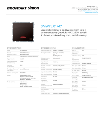 Kontakt-Simon S.A. 43-500 Czechowice-Dziedzice, ul. Bestwińska 21 tel.: 32 32 46 300, faks: 32 32 46 331 e-mail: [email protected] www.kontakt-simon.pl BMW7L.01/47 Łącznik krzyżowy z podświetleniem kolor: pomarańczowy (moduł) 10AX 250V, zaciski śrubowe, czekoladowy mat, metalizowany DANE PODSTAWOWE DANE SZCZEGÓŁOWE DANE LOGISTYCZNE Seria Simon Basic Nadruk/Piktogram symbol „krzyżowy” łącznik krzyżowy z podświetleniem Rodzaj materiału Kolor czekoladowy mat, metalizowany tworzywo sztuczne, PC, bezhalogenowe Ilość w opakowaniu zbiorczym 10 Nazwa produktu/Rodzaj Jednostka miary szt. Typ produktu moduł 5902787838737 Prąd znamionowy świetlówkowy 10 AX EAN opakowanie jednostkowe Typ opak. jedn. folia zgrzewana Napięcie znamionowe 250 V Wys. opak. jedn. 16 cm Rodzaj podłączenia / Typ zacisku zaciski śrubowe Szer. opak. jedn. 11 cm Dł. opak. jedn. 4.5 cm Stopień ochrony IP IP20/IP44 Waga jedn. 0.0766 kg Uwagi Do uzyskania klasy bryzgoszczelności IP44 zastosować ramkę BMR1B/..; BMR2B/...; BMR3B/.. EAN13 opak. 5902787838737 Typ opak. zbiorczego pudełko zamykane Wys. opak. zbiorczego 10 cm Szer. opak. zbiorczego 19 cm Dł. opak. zbiorczego 23 cm Podświetlenie wbudowane, orientujące, lampka tląca, kolor: pomarańczowy Zabezpieczenie powierzchni lakierowanie Wykończenie powierzchni matowy Sposób montażu [ETIM] montaż podtynkowy Sposób mocowania pazurki / wkręty Wysokość produktu 75 mm Szerokość produktu 75 mm Głębokość produktu 41 mm Głębokość wbudowania 24 mm Metoda klawisz kołyskowy eksploatacji/Sposób działania Ilość klawiszy / dźwigni 1 Układ połączeń Łącznik krzyżowy (bistabilny)