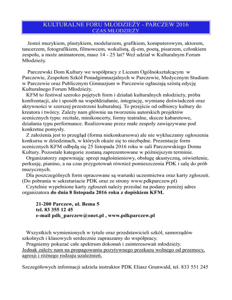 KULTURALNE FORU MŁODZIEŻY - PARCZEW 2016 CZAS MŁODZIEŻY Jesteś muzykiem, plastykiem, modelarzem, grafikiem, komputerowym, aktorem, tancerzem, fotografikiem, filmowcem, wokalistą, dj-em, poetą, pisarzem, członkiem zespołu, a może animatorem, masz 14 - 25 lat? Weź udział w Kulturalnym Forum Młodzieży. Parczewski Dom Kultury we współpracy z Liceum Ogólnokształcącym w Parczewie, Zespołem Szkół Ponadgimnazjalnych w Parczewie, Medycznym Studium w Parczewie oraz Publicznym Gimnazjum w Parczewie ogłaszają szóstą edycję Kulturalnego Forum Młodzieży. KFM to festiwal szeroko pojętych form i działań kulturalnych młodzieży, próba konfrontacji, ale i sposób na współdziałanie, integrację, wymianę doświadczeń oraz aktywności w szerszej przestrzeni kulturalnej. To przejście od odbiorcy kultury do kreatora i twórcy. Zależy nam głównie na tworzeniu autorskich projektów scenicznych typu: recitale, minikoncerty, formy teatralne, skecze kabaretowe, działania typu performance. Realizowane przez małe zespoły zawiązywane pod konkretne pomysły. Z założenia jest to przegląd (forma niekonkursowa) ale nie wykluczamy ogłoszenia konkursu w dziedzinach, w których okaże się to niezbędne. Prezentacje form scenicznych KFM odbędą się 25 listopada 2016 roku w sali Parczewskiego Domu Kultury. Pozostałe kategorie zostaną zaprezentowane w późniejszym terminie. Organizatorzy zapewniają: sprzęt nagłośnieniowy, obsługę akustyczną, oświetlenie, perkusję, pianino, a na czas przygotowań również pomieszczenia PDK i salę do prób muzycznych. Dla poszczególnych form opracowane są warunki uczestnictwa oraz karty zgłoszeń. (Do pobrania w sekretariacie PDK oraz ze strony www.pdkparczew.pl) Czytelnie wypełnione karty zgłoszeń należy przesłać na podany poniżej adres organizatora do dnia 8 listopada 2016 roku z dopiskiem KFM. 21-200 Parczew, ul. Bema 5 tel. 83 355 12 45 e-mail [email protected] , www.pdkparczew.pl Wszystkich wymienionych w tytule oraz przedstawicieli szkół, samorządów szkolnych i klasowych serdecznie zapraszamy do współpracy. Pragniemy pokazać całe spektrum dokonań i zainteresowań młodzieży. Jednak zależy nam na propagowaniu pozytywnego przekazu wolnego od przemocy, agresji i różnego rodzaju uzależnień. Szczegółowych informacji udziela instruktor PDK Eliasz Grunwald, tel. 833 551 245 Proponowane kategorie i warunki uczestnictwa: 1. Scena muzyczna Muzyka na żywo – perkusiści zobowiązani są do posiadania własnego zestawu talerzy. Muzyka klasyczna i filmowa – instrumenty elektroakustyczne. Recitale - możliwy półplayback. Taniec - czas prezentacji 10 min. Scena muzyczna występy: - indywidualne – czas prezentacji 10 - 15 min. - zespołowe – czas prezentacji 15 - 25 min. Turniej dj-ów – sety po 3 min. 2. Formy plastyczne – wystawa tematyka dowolna, technika dowolna, prace podpisane, nieoprawione. 3. Film-projekcja tytuł, nazwisko autora filmu, czas 5 - 10 min., na płycie lub nośniku zewnętrznym, tematyka dowolna. 4. Fotografia – wystawa tematyka dowolna, każdy autor powinien nadesłać zestaw sześciu zdjęć w formacie 18x24cm lub 21x29,7cm, będących wspólną opowieścią, na odwrocie każdej pracy należy podać: imię i nazwisko, adres, tytuł zestawu wraz z oznaczeniem kolejności w zestawie, Do zdjęć należy dołączyć czytelnie wypełnioną i podpisaną kartę zgłoszenia. Po zakończeniu festiwalu nadesłane prace zostaną zwrócone autorom. Postanowienia końcowe: I. Wszelkie kwestie nie ujęte w regulaminie rozstrzyga organizator. II. Festiwal może być odwołany w dowolnym momencie z przyczyn niezależnych od organizatora.
