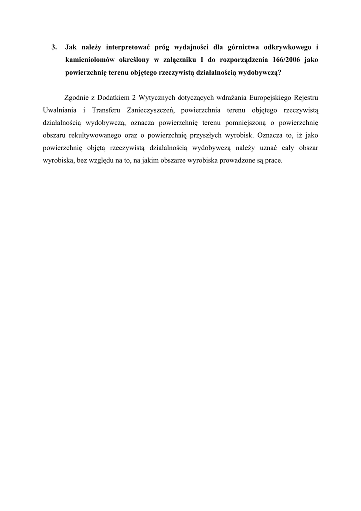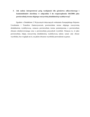 3. Jak należy interpretować próg wydajności dla górnictwa odkrywkowego i kamieniołomów określony w załączniku I do rozporządzenia 166/2006 jako powierzchnię terenu objętego rzeczywistą działalnością wydobywczą? Zgodnie z Dodatkiem 2 Wytycznych dotyczących wdrażania Europejskiego Rejestru Uwalniania i Transferu Zanieczyszczeń, powierzchnia terenu objętego rzeczywistą działalnością wydobywczą, oznacza powierzchnię terenu pomniejszoną o powierzchnię obszaru rekultywowanego oraz o powierzchnię przyszłych wyrobisk. Oznacza to, iż jako powierzchnię objętą rzeczywistą działalnością wydobywczą należy uznać cały obszar wyrobiska, bez względu na to, na jakim obszarze wyrobiska prowadzone są prace.
