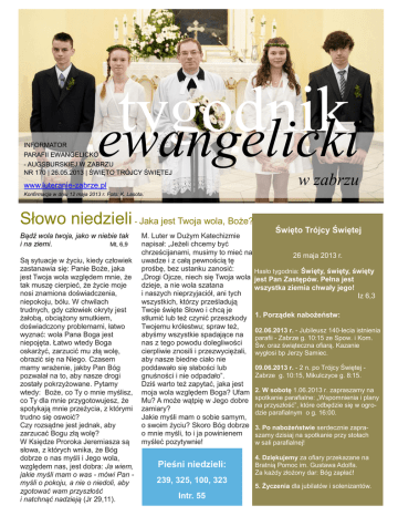 INFORMATOR tygodnik ewangelicki PARAFII EWANGELICKO - AUGSBURSKIEJ W ZABRZU NR 170 | 26.05.2013 | ŚWIĘTO TRÓJCY ŚWIĘTEJ w zabrzu www.luteranie-zabrze.pl Konfirmacja w dniu 12 maja 2013 r. Foto: K. Lasota. Słowo niedzieli - Jaka jest Twoja wola, Boże? Bądź wola twoja, jako w niebie tak i na ziemi. Mt, 6,9 Są sytuacje w życiu, kiedy człowiek zastanawia się: Panie Boże, jaka jest Twoja wola względem mnie, że tak muszę cierpieć, że życie moje nosi znamiona doświadczenia, niepokoju, bólu. W chwilach trudnych, gdy człowiek okryty jest żałobą, obciążony smutkiem, doświadczony problemami, łatwo wyznać: wola Pana Boga jest niepojęta. Łatwo wtedy Boga oskarżyć, zarzucić mu złą wolę, . obrazić Św. się na Niego. Czasem mamy wrażenie, jakby Pan Bóg pozwalał na to, aby nasze drogi zostały pokrzyżowane. Pytamy wtedy: Boże, co Ty o mnie myślisz, co Ty dla mnie przygotowujesz, że spotykają mnie przeżycia, z którymi trudno się oswoić? Czy rozsądne jest jednak, aby zarzucać Bogu złą wolę? W Księdze Proroka Jeremiasza są słowa, z których wnika, że Bóg dobrze o nas myśli i Jego wola, względem nas, jest dobra: Ja wiem, jakie myśli mam o was - mówi Pan myśli o pokoju, a nie o niedoli, aby zgotować wam przyszłość i natchnąć nadzieją (Jr 29,11). Święto Trójcy Świętej M. Luter w Dużym Katechizmie napisał: „Jeżeli chcemy być chrześcijanami, musimy to mieć na 26 maja 2013 r. uwadze i z całą pewnością tę prośbę, bez ustanku zanosić: Hasło tygodnia: Święty, święty, święty „Drogi Ojcze, niech się Twoja wola jest Pan Zastępów. Pełna jest dzieje, a nie wola szatana wszystka ziemia chwały jego! i naszych nieprzyjaciół, ani tych Iz 6,3 wszystkich, którzy prześladują Twoje święte Słowo i chcą je stłumić lub też czynić przeszkody 1. Porządek nabożeństw: Twojemu królestwu; spraw też, 02.06.2013 r. - Jubileusz 140-lecia istnienia abyśmy wszystkie spadające na parafii - Zabrze g. 10:15 ze Spow. i Kom. nas z tego powodu dolegliwości Św. oraz świąteczna ofiarą. Kazanie cierpliwie znosili i przezwyciężali, wygłosi bp Jerzy Samiec. aby nasze biedne ciało nie 09.06.2013 r. - 2 n. po Trójcy Świętej poddawało się słabości lub Zabrze g. 10:15, Mikulczyce g. 8:15. gnuśności i nie odpadało”. Dziś warto też zapytać, jaka jest moja wola względem Boga? Ufam 2. W sobotę 1.06.2013 r. zapraszamy na Mu? A może wątpię w Jego dobre spotkanie parafialne: „Wspomnienia i plany na przyszłość”, które odbędzie się w ogrozamiary? dzie parafialnym o g. 16:00. Jakie myśli mam o sobie samym, o swoim życiu? Skoro Bóg dobrze 3. Po nabożeństwie serdecznie zaprao mnie myśli, to i ja powinienem szamy dzisiaj na spotkanie przy stołach myśleć pozytywnie! w sali parafialnej! Pieśni niedzieli: 239, 325, 100, 323 Intr. 55 4. Dziękujemy za ofiary przekazane na Bratnią Pomoc im. Gustawa Adolfa. Za każdy złożony dar: Bóg zapłać! 5. Życzenia dla jubilatów i solenizantów. Noc Muzeów Konfirmacja 2013 Program tegorocznej Nocy Muzeów, której współorganizatorem była, po raz pierwszy, nasza parafia, przedstawiał się bardzo bogato i dynamicznie. Różne były też miejsca realizacji poszczególnych punktów programu; od „Caffe Silesia” - placówki Muzeum Miejskiego w Zabrzu, przez kościół „Pokoju”, aż po plener w ogrodzie parafialnym. Były wystawy, zwiedzenie z przewodnikami, projekcje filmów i muzyka na żywo. Bardzo dużym zainteresowaniem cieszyło się zwiedzanie zakamarków kościoła „Pokoju”, m.in.: wieży kościelnej z najstarszym zegarem w Zabrzu, oraz organów, o których opowiadał zabrzański organmistrz Damian Kaczmarczyk. Dziękujemy wszystkim zaangażowanym w przygotowanie i przeprowadzenie tegorocznej, zabrzańskiej Nocy Muzeów. W niedzielę Exaudi 12 maja 2013 r. odbyła się w naszej parafii konfirmacja kolejnego rocznika naszej młodzieży. W tym roku, po zdaniu egzaminu poprzedzającego to ważne wydarzenie, do konfirmacji przystąpili: Marta Soltke, Wiktoria Wierzyńska, Jakub Kasprzycki i Mateusz Kuznowski. Życzymy tegorocznym konfirmantom Bożego błogosławieństwa i wytrwałości w złożonym ślubowaniu. Kilka dni po uroczystości konfirmacyjnej w piątek 17 maja br., konfirmanci uczestniczyli w spotkaniu młodzieżowym przygotowanym właśnie z myślą o nich. To pierwsze spotkanie miało na celu integrację konfirmantów z grupą młodzieżową oraz zachęcenie ich do aktywności na polu pracy młodzieżowej w parafii i w diecezji.