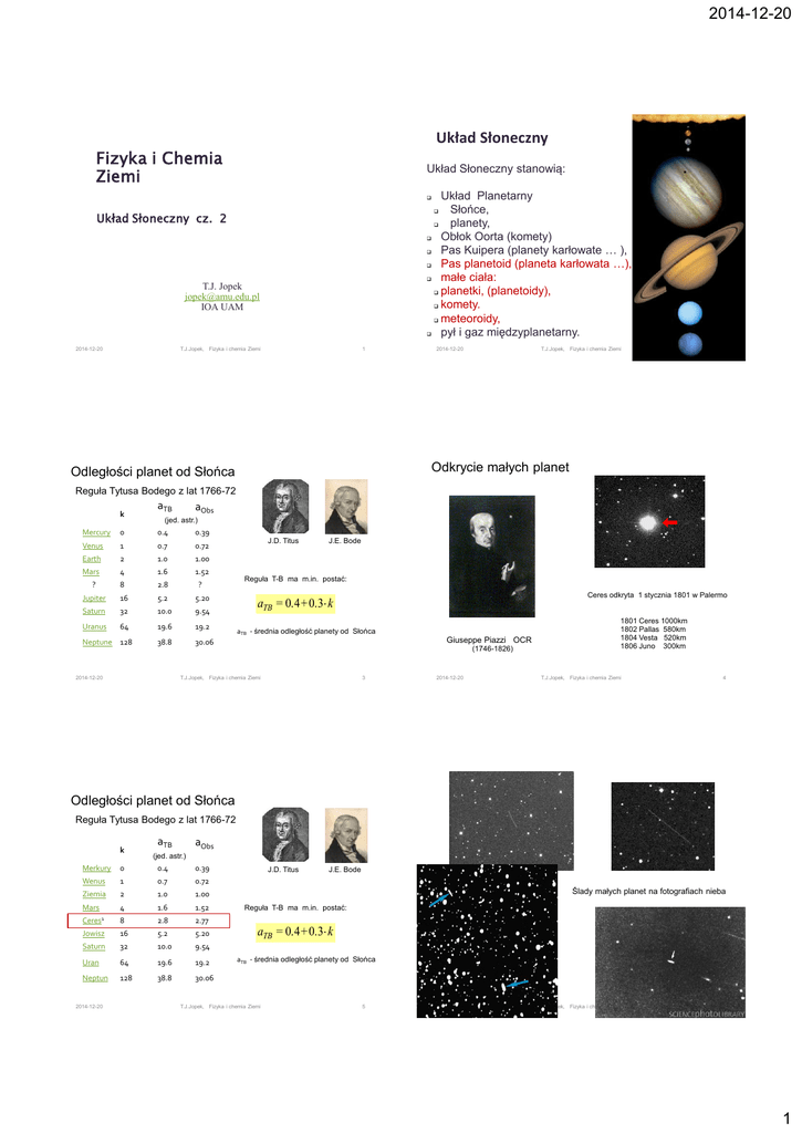 2014-12-20 Układ Słoneczny Fizyka i Chemia Ziemi Układ Słoneczny stanowią: Układ Planetarny Słońce, planety, Obłok Oorta (komety) Pas Kuipera (planety karłowate … ), Pas planetoid (planeta karłowata …), małe ciała: planetki, (planetoidy), komety. meteoroidy, pył i gaz międzyplanetarny. Układ Słoneczny cz. 2 T.J. Jopek [email protected] IOA UAM 2014-12-20 T.J.Jopek, Fizyka i chemia Ziemi 1 2014-12-20 T.J.Jopek, Fizyka i chemia Ziemi 2 Odkrycie małych planet Odległości planet od Słońca Reguła Tytusa Bodego z lat 1766-72 k aTB aObs (jed. astr.) Mercury 0 0.4 0.39 Venus 1 0.7 0.72 Earth 2 1.0 1.00 Mars 1.52 4 1.6 ? 8 2.8 ? Jupiter 16 5.2 5.20 Saturn 32 10.0 9.54 Uranus 64 19.6 19.2 38.8 30.06 Neptune 128 2014-12-20 J.D. Titus J.E. Bode Reguła T-B ma m.in. postać: Ceres odkryta 1 stycznia 1801 w Palermo aTB = 0.4+ 0.3 k aTB - średnia odległość planety od Słońca Giuseppe Piazzi OCR (1746-1826) T.J.Jopek, Fizyka i chemia Ziemi 3 2014-12-20 1801 Ceres 1000km 1802 Pallas 580km 1804 Vesta 520km 1806 Juno 300km T.J.Jopek, Fizyka i chemia Ziemi 4 Odległości planet od Słońca Reguła Tytusa Bodego z lat 1766-72 k aTB (jed. astr.) aObs Merkury 0 0.4 0.39 Wenus 1 0.7 0.72 Ziemia 2 1.0 1.00 Mars 4 1.6 1.52 Ceres1 8 2.8 2.77 Jowisz 16 5.2 5.20 Saturn 32 10.0 9.54 Uran 64 19.6 19.2 Neptun 128 38.8 30.06 2014-12-20 J.D. Titus J.E. Bode Ślady małych planet na fotografiach nieba Reguła T-B ma m.in. postać: aTB = 0.4+ 0.3 k aTB - średnia odległość planety od Słońca T.J.Jopek, Fizyka i chemia Ziemi 5 2014-12-20 T.J.Jopek, Fizyka i chemia Ziemi 6 1 2014-12-20 Pas planetoid. Miliony obiektów o rozmiarach od 1000 km – 1m … Materiał pozostały po nieutworzonej planecie 2014-12-20 T.J.Jopek, Fizyka i chemia Ziemi 7 2014-12-20 T.J.Jopek, Fizyka i chemia Ziemi 8 Obiekty typu NEO – Near Earth Objects Pas małych planet Orbita Jowisza Orbita Marsa Orbita Ziemi Sun Obiekty typu NEO Near-Earth-Object NEAs Komety jowiszowe lub docierające z bardzo odległych obszarów, Obłoku Oorta 2014-12-20 T.J.Jopek, Fizyka i chemia Ziemi 9 2005 YU55 (300-400 m średnica) 2014-12-20 T.J.Jopek, Fizyka i chemia Ziemi 10 Planetki Ida (31.4 km) i Daktyl (1.4 km) – układ dynamicznie podwójny 2011.11.08 miało miejsce ciasne zbliżenie planetki z Ziemią 2014-12-20 T.J.Jopek, Fizyka i chemia Ziemi 12 2014-12-20 T.J.Jopek, Fizyka i chemia Ziemi 13 2 2014-12-20 Misja ‘Near’ do planetki 433 Eros Lądowanie na Erosie 12.02.2001 Start 17.02.1996 Kometa Mc’ Naught, 27.01.2007 2014-12-20 T.J.Jopek, Fizyka i chemia Ziemi 14 2014-12-20 T.J.Jopek, Fizyka i chemia Ziemi 16 Budowa komety Ogon pyłowy Ogon gazowy Otoczka wodorowa Jądro komety Wild 2 ~ 5 km średnicy Jądro Koma Warkocze - ogony komety Hale-Bopp 2014-12-20 T.J.Jopek, Fizyka i chemia Ziemi 17 Ruch komety wokół Słońca 2014-12-20 T.J.Jopek, Fizyka i chemia Ziemi 18 Fizyko-chemiczny model jądra komety – „brudna śniegowa kula” ogon gazowy ogon pyłowy Autor modelu kometarnego jądra F.L. Whipple. Komety zawierają drobne krzemowe skały oraz cząsteczki : głównie H2O i w mniejszej ilości CO2, CO, OH, CN, amoniak, metan a także związki organiczne. 2014-12-20 T.J.Jopek, Fizyka i chemia Ziemi 20 2014-12-20 T.J.Jopek, Fizyka i chemia Ziemi Fizyczna aktywność jądra komety 21 3 2014-12-20 Sonda Rosetta – osadzenie próbnika Philae na komecie 67P/Czuriumow-Gierasimienko 2014-12-20 T.J.Jopek, Fizyka i chemia Ziemi Sonda Rosetta – osadzenie próbnika Philae na komecie 67/P 2 km 22 2014-12-20 T.J.Jopek, Fizyka i chemia Ziemi 23 Rozpad komet i planetoid Kometa 67/P 73P/Schwassmann 3 1/P Halley Cele misji: 1. 2. 3. 4. 5. 6. 7. wygląd jądra komety, morfologia powierzchni, skład jądra: chemia, skład izotopowy, skład mineralogiczny, własności fizyczne, aktywność jądra. C/1999 S4 Symulacja zderzenia dwóch małych planet 2014-12-20 T.J.Jopek, Fizyka i chemia Ziemi 24 2014-12-20 T.J.Jopek, Fizyka i chemia Ziemi 25 Meteoryty Spadek meteorytu Peekskill H6 • ~10 meteorytów, dla których wyznaczono ich orbity • 1000 meteorytów znaleziono obserwując ich spadek (obs. wizualna, przypadkowa), • znacznie więcej znajduje się w muzeach, kolekcjach prywatnych. 1992, październik 9, 23:48 UT 2014-12-20 T.J.Jopek, Fizyka i chemia Ziemi Zbieranie meteorytów na Antarktydzie 26 26 2014-12-20 T.J.Jopek, Fizyka i chemia Ziemi 27 4 2014-12-20 Podział meteorytów Podział meteorytów Wiele meteorytów kamiennych zawiera sferyczne milimetrowe inkluzje zwane chondrami, występujące wyłącznie w meteorytach. Takie meteoryty nazywane są chondrytami. Do najważniejszych typów należą meteoryty: Chondry prawdopodobnie powstały drogą kondensacji materiału w mgławicy słonecznej. Jednak w przeszłości mogły ulec parokrotnemu nagrzaniu a nawet stopieniu. Ale nie doznały zmian metamorficznych przekształcających je w struktury znane pośród skał ziemskich. • żelazne; zwykle w 100% z metali (żelazo, nikiel), • kamienne; składają się z kamieni z niewielkim dodatkiem żelaza, Figury Widmanstaettena w meteorytch żelaznych • żelazo-kamienne; mieszanina kamieni, metali w różnych proporcjach Uważa się, że meteoryty kamienne składają się na płaszcz i skorupę planet ziemskich. 2014-12-20 Szczególne znaczenie mają chondryty węgliste zawierające dużo węgla, do 4%. Stanowią klasę meteorytów najbardziej zbliżonych do ciał powstałych w wyniku akrecji materii w mgławicy słonecznej. Achondryty są to meteoryty kamienne nie zawierające chondr. Doznały przemian metamorficznych, zawierają mniej żelaza. Są w pełni skrystalizowane jak skały ziemskie. T.J.Jopek, Fizyka i chemia Ziemi 28 2014-12-20 T.J.Jopek, Fizyka i chemia Ziemi 29 Deszcz meteorytów żelaznych w Canyon Diablo Liczba planetek typu NEA odkrytych w latach 1980 - 2011 Krater Barringera k. Winslow w USA 2014-12-20 T.J.Jopek, Fizyka i chemia Ziemi 30 2014-12-20 T.J.Jopek, Fizyka i chemia Ziemi 31 Large -> o rozmiarach 1 km i w