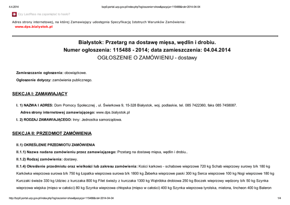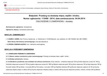 4.4.2014 bzp0.portal.uzp.gov.pl/index.php?ogloszenie=show&pozycja=115488&rok=2014-04-04 Czy LastPass ma zapamiętać to hasło? Adres strony internetowej, na której Zamawiający udostępnia Specyfikację Istotnych Warunków Zamówienia: www.dps.bialystok.pl Białystok: Przetarg na dostawę mięsa, wędlin i drobiu. Numer ogłoszenia: 115488 - 2014; data zamieszczenia: 04.04.2014 OGŁOSZENIE O ZAMÓWIENIU - dostawy Zamieszczanie ogłoszenia: obowiązkowe. Ogłoszenie dotyczy: zamówienia publicznego. SEKCJA I: ZAMAWIAJĄCY I. 1) NAZWA I ADRES: Dom Pomocy Społecznej , ul. Świerkowa 9, 15-328 Białystok, woj. podlaskie, tel. 085 7422360, faks 085 7458087. Adres strony internetowej zamawiającego: www.dps.bialystok.pl I. 2) RODZAJ ZAMAWIAJĄCEGO: Inny: Jednostka samorządowa. SEKCJA II: PRZEDMIOT ZAMÓWIENIA II.1) OKREŚLENIE PRZEDMIOTU ZAMÓWIENIA II.1.1) Nazwa nadana zamówieniu przez zamawiającego: Przetarg na dostawę mięsa, wędlin i drobiu.. II.1.2) Rodzaj zamówienia: dostawy. II.1.4) Określenie przedmiotu oraz wielkości lub zakresu zamówienia: Kości karkowo - schabowe wieprzowe 720 kg Schab wieprzowy surowy b/k 180 kg Karkówka wieprzowa surowa b/k 750 kg Łopatka wieprzowa surowa b/k 1800 kg Żeberka wieprzowe paski 300 kg Serca wieprzowe 100 kg Nogi wieprzowe 180 kg Kurczaki świeże 330 kg Udziec z kurczaka 800 kg Filet świeży z kurczaka 1300 kg Wątróbka drobiowa 250 kg Boczek wieprzowy wędzony b/k 50 kg Szynka wieprzowa wiejska (mięso w całości) 80 kg Szynka wieprzowa chłopska (mięso w całości) 400 kg Szynka wieprzowa tyrolska, mielona, lincheon 400 kg Baleron http://bzp0.portal.uzp.gov.pl/index.php?ogloszenie=show&pozycja=115488&rok=2014-04-04 1/4 4.4.2014 bzp0.portal.uzp.gov.pl/index.php?ogloszenie=show&pozycja=115488&rok=2014-04-04 wieprzowy wędzony, gotowany 500 kg Polędwica wieprzowa wiejska, tradycyjna 40 kg Polędwica wieprzowa sopocka 140 kg Kiełbasa piwna 200 kg Kiełbasa wieprzowa, szynkowa 200 kg Kiełbasa kanapkowa 150 kg Kiełbasa krakowska parzona 300 kg Kiełbasa podwawelska 130 kg Kiełbasa zwyczajna 300 kg Kiełbasa toruńska 150 kg Kiełbasa tatrzańska 90 kg Kiełbasa parówkowa wieprzowa, serdelki 410 kg Kiełbasa wiejska, swojska 140 kg Kiełbasa biała parzona 300 kg Mortadela wieprzowa 300 kg Parówki wieprzowe śląskie 100 kg Salceson wieprzowy 110 kg Salceson wieprzowy czarny 110 kg Salceson czosnkowy 110 kg Rolada boczkowa, boczek rolowany 200 kg Kaszanka 100 kg Krupnioki 140 kg Klops 200 kg Pasztetowa drobiowa, wieprzowa 250 kg Rolada drobiowa 150 kg Pieczeń drobiowa, wieprzowa 170 kg Pasztet drobiowy 240 kg Polędwica z indyka, drobiowa 300 kg Kiełbasa na święconkę 20 kg. II.1.6) Wspólny Słownik Zamówień (CPV): 15.10.00.00-9. II.1.7) Czy dopuszcza się złożenie oferty częściowej: nie. II.1.8) Czy dopuszcza się złożenie oferty wariantowej: nie. II.2) CZAS TRWANIA ZAMÓWIENIA LUB TERMIN WYKONANIA: Zakończenie: 17.05.2015. SEKCJA III: INFORMACJE O CHARAKTERZE PRAWNYM, EKONOMICZNYM, FINANSOWYM I TECHNICZNYM III.2) ZALICZKI III.4) INFORMACJA O OŚWIADCZENIACH LUB DOKUMENTACH, JAKIE MAJĄ DOSTARCZYĆ WYKONAWCY W CELU POTWIERDZENIA SPEŁNIANIA WARUNKÓW UDZIAŁU W POSTĘPOWANIU ORAZ NIEPODLEGANIA WYKLUCZENIU NA PODSTAWIE ART. 24 UST. 1 USTAWY III.4.1) W zakresie wykazania spełniania przez wykonawcę warunków, o których mowa w art. 22 ust. 1 ustawy, oprócz oświadczenia o spełnianiu warunków udziału w postępowaniu należy przedłożyć: III.4.2) W zakresie potwierdzenia niepodlegania wykluczeniu na podstawie art. 24 ust. 1 ustawy, należy przedłożyć: oświadczenie o braku podstaw do wykluczenia; aktualny odpis z właściwego rejestru lub z centralnej ewidencji i informacji o działalności gospodarczej, jeżeli odrębne przepisy wymagają wpisu do rejestru lub ewidencji, w celu wykazania braku podstaw do wykluczenia w oparciu o art. 24 ust. 1 pkt 2 ustawy, wystawiony nie wcześniej niż 6 miesięcy przed upływem terminu składania wniosków o dopuszczenie do udziału w postępowaniu o udzielenie zamówienia albo składania ofert; http://bzp0.portal.uzp.gov.pl/index.php?ogloszenie=show&pozycja=115488&rok=2014-04-04 2/4 4.4.2014 bzp0.portal.uzp.gov.pl/index.php?ogloszenie=show&pozycja=115488&rok=2014-04-04 aktualne zaświadczenie właściwego naczelnika urzędu skarbowego potwierdzające, że wykonawca nie zalega z opłacaniem podatków, lub zaświadczenie, że uzyskał przewidziane prawem zwolnienie, odroczenie lub rozłożenie na raty zaległych płatności lub wstrzymanie w całości wykonania decyzji właściwego organu - wystawione nie wcześniej niż 3 miesiące przed upływem terminu składania wniosków o dopuszczenie do udziału w postępowaniu o udzielenie zamówienia albo składania ofert; aktualne zaświadczenie właściwego oddziału Zakładu Ubezpieczeń Społecznych lub Kasy Rolniczego Ubezpieczenia Społecznego potwierdzające, że wykonawca nie zalega z opłacaniem składek na ubezpieczenia zdrowotne i społeczne, lub potwierdzenie, że uzyskał przewidziane prawem zwolnienie, odroczenie lub rozłożenie na raty zaległych płatności lub wstrzymanie w całości wykonania decyzji właściwego organu - wystawione nie wcześniej niż 3 miesiące przed upływem terminu składania wniosków o dopuszczenie do udziału w postępowaniu o udzielenie zamówienia albo składania ofert; III.4.3) Dokumenty podmiotów zagranicznych Jeżeli wykonawca ma siedzibę lub miejsce zamieszkania poza terytorium Rzeczypospolitej Polskiej, przedkłada: III.4.3.1) dokument wystawiony w kraju, w którym ma siedzibę lub miejsce zamieszkania potwierdzający, że: nie otwarto jego likwidacji ani nie ogłoszono upadłości - wystawiony nie wcześniej niż 6 miesięcy przed upływem terminu składania wniosków o dopuszczenie do udziału w postępowaniu o udzielenie zamówienia albo składania ofert; nie zalega z uiszczaniem podatków, opłat, składek na ubezpieczenie społeczne i zdrowotne albo że uzyskał przewidziane