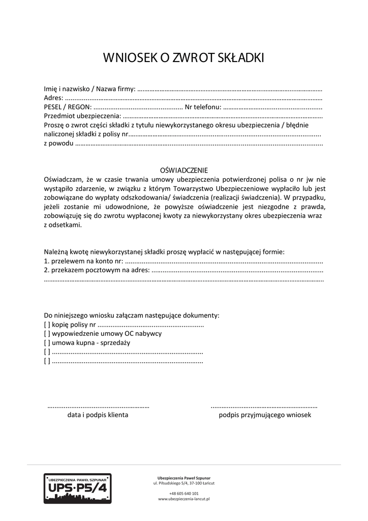 WNIOSEK O ZWROT SKŁADKI Imię i nazwisko / Nazwa firmy: ….………………………………………………………………….………....…………… Adres: ..................…………………………………………………………………………………..……………………………… PESEL / REGON: ................................................ Nr telefonu: ………………….................................. Przedmiot ubezpieczenia: ……………………………………………………………………..…………………….………… Proszę o zwrot części składki z tytułu niewykorzystanego okresu ubezpieczenia / błędnie naliczonej składki z polisy nr.….………………………..…..................................................................... z powodu ………………….………………..…………................................................................................... OŚWIADCZENIE Oświadczam, że w czasie trwania umowy ubezpieczenia potwierdzonej polisa o nr jw nie wystąpiło zdarzenie, w związku z którym Towarzystwo Ubezpieczeniowe wypłaciło lub jest zobowiązane do wypłaty odszkodowania/ świadczenia (realizacji świadczenia). W przypadku, jeżeli zostanie mi udowodnione, że powyższe oświadczenie jest niezgodne z prawda, zobowiązuję się do zwrotu wypłaconej kwoty za niewykorzystany okres ubezpieczenia wraz z odsetkami. Należną kwotę niewykorzystanej składki proszę wypłacić w następującej formie: 1. przelewem na konto nr: .......................................................................................................... 2. przekazem pocztowym na adres: ............................................................................................ ……………………………………………………………………………………………………………………………………………….. Do niniejszego wniosku załączam następujące dokumenty: [ ] kopię polisy nr ......................................................... [ ] wypowiedzenie umowy OC nabywcy [ ] umowa kupna - sprzedaży [ ] ................................................................................. [ ] ................................................................................. ….........................................………… data i podpis klienta ......….........…....……………………………… podpis przyjmującego wniosek Ubezpieczenia Paweł Szpunar ul. Piłsudskiego 5/4, 37-100 Łańcut +48 605 640 101 www.ubezpieczenia-lancut.pl