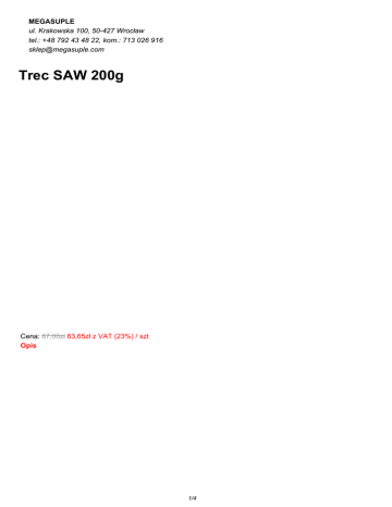 MEGASUPLE ul. Krakowska 100, 50-427 Wrocław tel.: +48 792 43 48 22, kom.: 713 026 916 [email protected] Trec SAW 200g Cena: 67,00zł 63,65zł z VAT (23%) / szt Opis 1/4 S.A.W. to ultra-skoncentrowana formuła przedtreningowa dla profesjonalistów. Preparat wykazuje silne działanie anaboliczne oraz pomaga uzyskać twarde i napompowane mięśnie w trakcie ćwiczeń. S.A.W. zapewnia im dodatkowe dotlenienie, odżywienie i impuls do wzrostu. Unikalny kompleks beta-alaniny, kofeiny i neurostymulatorów nasila produkcję energii, poprawia koncentrację i zwiększa motywację do treningów. Preparat może opóźniać objawy zmęczenia oraz przeciwdziałać nadmiernemu zakwaszeniu tkanek. S.A.W. wspomaga budowanie siły i masy mięśni, a także poprawia wydolność podczas ciężkich wysiłków fizycznych. Chcesz poprawić swoje wyniki treningowe? Zastanawiasz się nad tym jak to zrobić? Próbowałeś już wszystkiego i dalej nie osiągnąłeś zadowalających efektów? Twoje treningi przypominają nierówną walkę z własnymi słabościami? Nie możesz się skoncentrować, a mięśnie Cię palą? Każdy kolejny ruch sprawia, że dosłownie ?wyjesz z bólu?? Próbowałeś różnych stacków przedtreningowych, ale czy zastanawiałeś się kiedyś, dlaczego nie działają tak jak ?pisali w reklamie?? Ukryty we wnętrzu wielkiej, kolorowej puszki proszek nie pomógł Ci w budowaniu siły i dodatkowych kilogramów mięśni, tak jak się tego spodziewałeś? Tajemnicza mikstura egzotycznych ziół i pseudo-innowacyjnych węglowodanów nie działa i sprawia, że dziwnie się czujesz i obrastasz w tłuszcz? Potrzebujesz SUPER ANABOLICZNEGO WSPARCIA! TRAKTUJ SPORT PROFESJONALNIE! Jeśli poważnie podchodzisz do sportu jaki uprawiasz, musisz tak samo myśleć o suplementacji. Profesjonalne treningi wymagają stosowania profesjonalnych produktów! Bez względu na to czy jesteś kulturystą, fighterem, czy strongmanem, Twoje mięśnie potrzebują tych samych składników aby nieprzerwanie generować moc i energię! Tylko sprawdzone i bezpieczne substancje pomogą Ci osiągnąć sukces w każdej dyscyplinie sportowej. Nie eksperymentuj na swoim organizmie stosując skomplikowane i nie zawsze bezpieczne kombinacje mało znanych i słabo przebadanych składników. Pozostaw doświadczenia naukowcom! Szukasz dobrego produktu przedtreningowego? Sprawdź ile rzeczywiście ma składników aktywnych, bo to one pomogą Ci zwiększyć możliwości wysiłkowe! Nie płać za zbędne wypełniacze i za ?zaawansowane? systemy transportujące kreatynę czy aminokwasy, które w rzeczywistości okazują się być zwykłym, prostym cukrem! Pamiętaj! To stopień skoncentrowania produktu oraz właściwy wybór składników aktywnych i ich odpowiednie dawki, a nie wielkość opakowania przekładają się na końcowy efekt suplementacji! SKONCENTROWANA SIŁA Chcesz aby Twoje mięśnie były większe i mocniejsze, a ruchy szybsze, silniejsze i bardziej precyzyjne? Chcesz oko w oko stanąć ze swoimi słabościami i maksymalnie wykorzystać tkwiący w twoim organizmie potencjał? Wypróbuj S.A.W. ? najsilniejszy stack przedtreningowy jaki kiedykolwiek powstał w laboratoriach TREC NUTRITION. Wyostrz swoje zmysły! Poczuj niesamowity przypływ energii i otwórz się na zupełnie nowe doznania treningowe. Od teraz Twój mózg uzyska absolutną kontrolę nad pracą mięśni! Przenieś swoje ćwiczenia na najwyższy poziom intensywności, o którym wcześniej nawet nie myślałeś. Zamień zwykły trening na SUPER ANABOLIC WORKOUT! ABSOLUTNA SYNERGIA, TYLKO SPRAWDZONE SKŁADNIKI S.A.W. to formuła łącząca wyłącznie przebadane, bezpieczne i skuteczne substancje czynne, które pomogą Ci przezwyciężyć zastój treningowy już po pierwszym użyciu. Niezwykle wysoka koncentracja składników aktywnych nadaje suplementacji przedtreningowej zupełnie nowy wymiar. S.A.W. to czysta esencja wspomagania ? produkt wolny od zbędnych cukrów, dodatków i wypełniaczy. Oszałamiająco wysoki stopień koncentracji (blisko 96% receptury preparatu to substancje czynne) i najwyższej jakości surowce sprawiają, że każda 5 g miarka preparatu kryje w sobie olbrzymi potencjał anaboliczny i ergogeniczny. Synergistycznie działające składniki produktu drastycznie zwiększają możliwości organizmu do pracy pod dużym obciążeniem. Dzięki czemu nie tylko możesz trenować dłużej i intensywniej, ale także twój wysiłek przyniesie o wiele lepsze rezultaty. Aktywująca główne szlaki anaboliczne formuła preparatu pomoże Ci w szybkim czasie zbudować wysokiej jakości zdolne do podejmowania ciężkiej pracy mięśnie i to bez ryzyka zbędnego otłuszczenia. SUPER Pump Vasodilators Zaawansowany matrix niezwykle silnych boosterów tlenku azotu (NO), których działanie wielokrotnie potwierdzono w badaniach naukowych. Odpowiednie dawki Alfa-Ketoglutaranu i Jabłczanu L-Argininy w połączeniu z Jabłczanem Cytruliny szybko zwiększają syntezę NO w organizmie. Aby maksymalnie wykorzystać drzemiący w tych składnikach potencjał do produktu dodano ViNitrox? ? opatentowany ekstrakt z jabłek i winogron. Zawarte w nim naturalne roślinne polifenole aktywują enzym nadzorujący produkcję tlenku azotu w organizmie. Dzięki czemu zwiększa się jej wydajność, powstaje więcej NO i wydłuża się jego aktywność. 2/4 Efekt tego działania obserwowany jest już od samego początku ćwiczeń, a pełna waskularyzacja nie zanika i utrzymuje się o wiele dłużej niż w przypadku innych preparatów. Przez cały trening mięśnie są lepiej ukrwione i nieustannie otrzymują niezbędne do pracy składniki odżywcze oraz tlen. ANABOLIC Energy Maximizer To specjalna receptura składników maksymalizujących wytwarzanie energii w trakcie długotrwałych i ciężkich ćwiczeń. Wysoka dawka Beta-Alaniny przeciwdziała przedwczesnemu zmęczeniu mięśni i obniża stopień ich zakwaszenia. Powstająca z niej Karnozyna działa jak naturalny bufor, kt