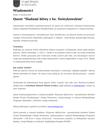 Wiadomości Środa, 27 stycznia 2016 Quest "Śladami bitwy z ks. Świeykowskim" Zapraszamy wszystkich zainteresowanych na spacer po Gorlicach z dawnym burmistrzem miasta, księdzem Bronisławem Świeykowskim, po miejscach związanych z I wojną światową. Questy to bezobsługowe, nieznakowane trasy dziedzictwa, po których można się poruszać czytając wierszowane wskazówki, pokazujące w ciekawy - innowacyjny sposób jakąś historię, legendę, elementy przyrody. Tematyka: Wędrując po centrum Gorlic odwiedzisz miejsca związane z działaniami, które miały miejsce podczas „Bitwy Gorlickiej” w 1915 r., kiedy to na moment Gorlice stały się sceną światowej historii. Walki pozycyjne pod Gorlicami trwały prawie pół roku, ale decydujące starcie rozpoczął niespodziewany atak wojsk niemieckich i austro-węgierskich 2 maja 1915. Wtedy to został przerwany front rosyjski. Jak szukać skarbu? Podczas spaceru kieruj się wskazówkami zawartymi w instrukcji, odgaduj zagadki i zbieraj literki potrzebne do hasła. Na mecie trasy podaj je, by otrzymać odcisk pieczęci – skarbu questu. Zachęcamy do odwiedzania trasy questu, który "czynny" jest cały czas. Wystarczy pobrać ulotkę trasy w Pawilonie Historii Miasta Gorlice, bądź samemu ją wydrukować i ruszyć na start wyprawy. Quest został przygotowany w ramach projektu: Wyprawy odkrywców - poszukiwanie skarbów Szlaku Frontu Wschodniego I Wojny Światowej, realizowanego w ramach Małopolskiego Programu Obchodów „100-lecie I wojny światowej”. Więcej informacji o queście na stronie: www.bestquest.pl Quest powstał w ramach działania: Wyprawy odkrywców - poszukiwanie skarbów Szlaku Frontu Wschodniego I Wojny Światowej, realizowanego w ramach Małopolskiego Programu Obchodów „100-lecie I wojny światowej”. Partnerami projektu są Małopolski Instytut Kultury, Urząd Miejski w Gorlicach, Spółdzielnia Socjalna ENTER.