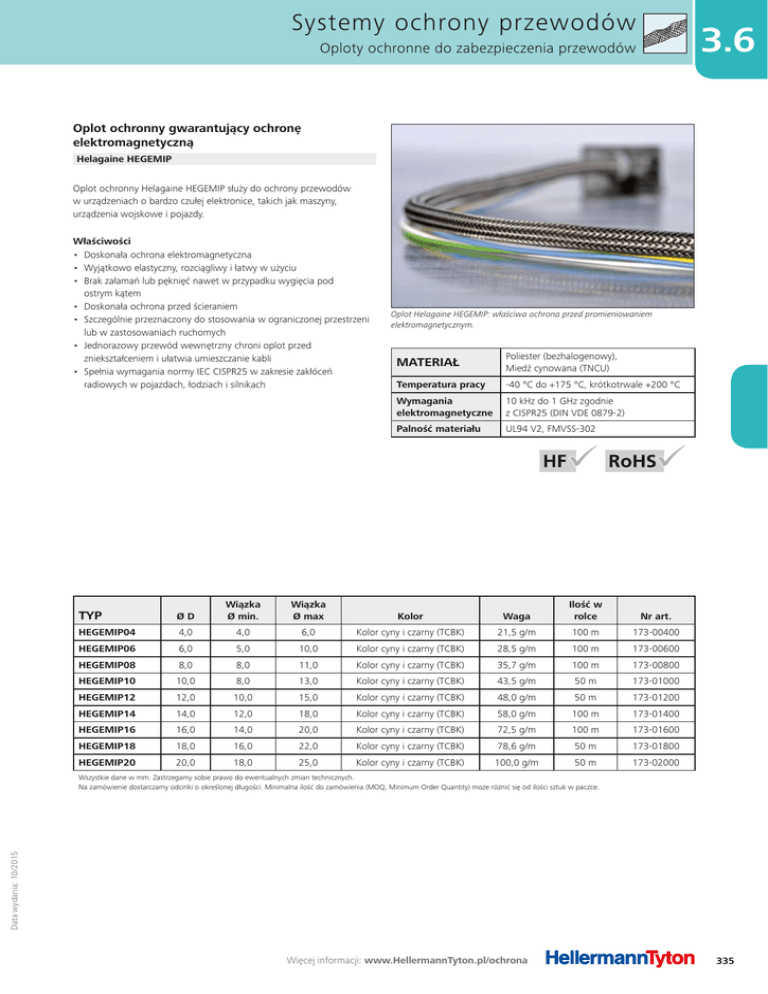 Systemy ochrony przewodów 3.6 Oploty ochronne do zabezpieczenia przewodów Oplot ochronny gwarantujący ochronę elektromagnetyczną Helagaine HEGEMIP Oplot ochronny Helagaine HEGEMIP służy do ochrony przewodów w urządzeniach o bardzo czułej elektronice, takich jak maszyny, urządzenia wojskowe i pojazdy. Właściwości • Doskonała ochrona elektromagnetyczna • Wyjątkowo elastyczny, rozciągliwy i łatwy w użyciu • Brak załamań lub pęknięć nawet w przypadku wygięcia pod ostrym kątem • Doskonała ochrona przed ścieraniem • Szczególnie przeznaczony do stosowania w ograniczonej przestrzeni lub w zastosowaniach ruchomych • Jednorazowy przewód wewnętrzny chroni oplot przed zniekształceniem i ułatwia umieszczanie kabli • Spełnia wymagania normy IEC CISPR25 w zakresie zakłóceń radiowych w pojazdach, łodziach i silnikach Oplot Helagaine HEGEMIP: właściwa ochrona przed promieniowaniem elektromagnetycznym. MATERIAŁ Poliester (bezhalogenowy), Miedź cynowana (TNCU) Temperatura pracy -40 °C do +175 °C, krótkotrwale +200 °C Wymagania elektromagnetyczne 10 kHz do 1 GHz zgodnie z CISPR25 (DIN VDE 0879-2) Palność materiału UL94 V2, FMVSS-302 TYP ØD Wiązka Ø min. Wiązka Ø max Kolor Waga Ilość w rolce Nr art. HEGEMIP04 4,0 4,0 6,0 Kolor cyny i czarny (TCBK) 21,5 g/m 100 m 173-00400 HEGEMIP06 6,0 5,0 10,0 Kolor cyny i czarny (TCBK) 28,5 g/m 100 m 173-00600 HEGEMIP08 8,0 8,0 11,0 Kolor cyny i czarny (TCBK) 35,7 g/m 100 m 173-00800 HEGEMIP10 10,0 8,0 13,0 Kolor cyny i czarny (TCBK) 43,5 g/m 50 m 173-01000 HEGEMIP12 12,0 10,0 15,0 Kolor cyny i czarny (TCBK) 48,0 g/m 50 m 173-01200 HEGEMIP14 14,0 12,0 18,0 Kolor cyny i czarny (TCBK) 58,0 g/m 100 m 173-01400 HEGEMIP16 16,0 14,0 20,0 Kolor cyny i czarny (TCBK) 72,5 g/m 100 m 173-01600 HEGEMIP18 18,0 16,0 22,0 Kolor cyny i czarny (TCBK) 78,6 g/m 50 m 173-01800 HEGEMIP20 20,0 18,0 25,0 Kolor cyny i czarny (TCBK) 100,0 g/m 50 m 173-02000 Data wydania: 10/2015 Wszystkie dane w mm. Zastrzegamy sobie prawo do ewentualnych zmian technicznych. Na zamówienie dostarczamy odcinki o określonej długości. Minimalna ilość do zamówienia (MOQ, Minimum Order Quantity) może różnić się od ilości sztuk w paczce. Więcej informacji: www.HellermannTyton.pl/ochrona 335