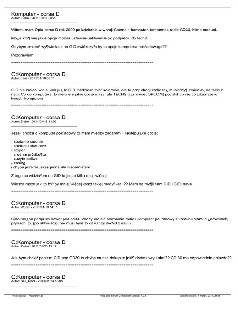 Komputer - corsa D Autor: Ziobo - 2011/01/17 20:22 _____________________________________ Witam, mam Opla corse D rok 2009 pa¼dziernik w wersji Cosmo + komputer, tempomat, radio CD30, klima manual. Mo¿e kto¶ wie jakie opcje mozna ustawiæ-uaktywniæ po podpiêciu do tech2. Gdybym zmieni³ wy¶wietlacz na GID zwiêkszy³o by to opcje komputera pok³adowago?? Pozdrawiam ============================================================================ O:Komputer - corsa D Autor: dam - 2011/01/18 08:11 _____________________________________ GID nie zmieni wiele. Jak ju¿ to CID, bêdziesz mia³ kolorowo, ale to przy okazji radio te¿ musia³by¶ zmieniæ, na takie z navi. Co do komputera, to nie wiem jakie opcje masz, ale TECH2 (czy nawet OPCOM) potrafi± co nie co zdzia³aæ w kwestii komputera. ============================================================================ O:Komputer - corsa D Autor: Ziobo - 2011/01/18 13:02 _____________________________________ Jezeli chodzi o komputer pok³adowy to mam miedzy zagarami i nastêpuj±ce opcje: - spalanie srednie - spalanie chwilowe - stoper - sredni± prêdko¶æ - zuzyte paliwo - zasiêg i chyba jeszcze jakas jedna ale niepamiêtam Z tego co widzia³em na GID to jest o kilka opcji wiêcej Wiesza moze jaki to by³ by mniej wiêcej koszt takiej modyfikacji?? Mam na my¶li sam GID i CID+nava. ============================================================================ O:Komputer - corsa D Autor: Wo³ek - 2011/01/19 14:11 _____________________________________ Cida mo¿na podpi±æ nawet pod cd30. Wtedy ma siê normalnie radio i komputer pok³adowy z komunikatami o ¿arówkach, p³ynach itp. (po aktywacji), nie musi byæ to cd70 czy dvd90 z navi;) ============================================================================ O:Komputer - corsa D Autor: Ziobo - 2011/01/20 13:17 _____________________________________ Jak bym chcia³ popi±æ CID pod CD30 to chyba musze dokupiæ jaki¶ dodatkowy kabel?? CD 30 ma odpowiednie gniazdo?? ============================================================================ O:Komputer - corsa D Autor: SIG_MAN - 2011/01/24 18:05 _____________________________________ Projektnavi.pl - Projektnavi.pl FireBoard Forum Component version: 1.0.4 Wygenerowano: 7 March, 2017, 21:48 Na GID i CID jest jeszcze ukryte menu :) Tam jest wiele ¶miesznych rzeczy :) Temperatura silnika, prêdko¶æ w M na SEK spalanie chwilowe i niechwilowe :) Od razu napiszê jak tam wej¶æ (w menu g³ównym przytrzymujemy SETINGS) a potem klikamy kilka razy BC i patrzymy co tam siê dzieje :) ============================================================================ Projektnavi.pl - Projektnavi.pl FireBoard Forum Component version: 1.0.4 Wygenerowano: 7 March, 2017, 21:48