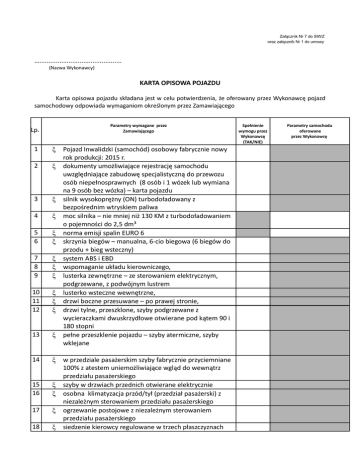 Załącznik Nr 7 do SIWZ oraz załącznik Nr 1 do umowy …............................................. (Nazwa Wykonawcy) KARTA OPISOWA POJAZDU Karta opisowa pojazdu składana jest w celu potwierdzenia, że oferowany przez Wykonawcę pojazd samochodowy odpowiada wymaganiom określonym przez Zamawiającego Parametry wymagane przez Zamawiającego Lp. 1 ξ 2 ξ 3 ξ 4 ξ 5 6 ξ ξ 7 8 9 ξ ξ ξ 10 11 12 ξ ξ ξ 13 ξ 14 ξ 15 16 ξ ξ 17 ξ 18 ξ Pojazd Inwalidzki (samochód) osobowy fabrycznie nowy rok produkcji: 2015 r. dokumenty umożliwiające rejestrację samochodu uwzględniające zabudowę specjalistyczną do przewozu osób niepełnosprawnych (8 osób i 1 wózek lub wymiana na 9 osób bez wózka) – karta pojazdu silnik wysokoprężny (ON) turbodoładowany z bezpośrednim wtryskiem paliwa moc silnika – nie mniej niż 130 KM z turbodoładowaniem o pojemności do 2,5 dm³ norma emisji spalin EURO 6 skrzynia biegów – manualna, 6-cio biegowa (6 biegów do przodu + bieg wsteczny) system ABS i EBD wspomaganie układu kierowniczego, lusterka zewnętrzne – ze sterowaniem elektrycznym, podgrzewane, z podwójnym lustrem lusterko wsteczne wewnętrzne, drzwi boczne przesuwane – po prawej stronie, drzwi tylne, przeszklone, szyby podgrzewane z wycieraczkami dwuskrzydłowe otwierane pod kątem 90 i 180 stopni pełne przeszklenie pojazdu – szyby atermiczne, szyby wklejane w przedziale pasażerskim szyby fabrycznie przyciemniane 100% z atestem uniemożliwiające wgląd do wewnątrz przedziału pasażerskiego szyby w drzwiach przednich otwierane elektrycznie osobna klimatyzacja przód/tył (przedział pasażerski) z niezależnym sterowaniem przedziału pasażerskiego ogrzewanie postojowe z niezależnym sterowaniem przedziału pasażerskiego siedzenie kierowcy regulowane w trzech płaszczyznach Spełnienie wymogu przez Wykonawcę (TAK/NIE) Parametry samochodu oferowane przez Wykonawcę 19 20 ξ ξ 21 22 ξ ξ ξ ξ ξ 23 24 ξ ξ 25 ξ 26 27 ξ ξ 28 29 30 ξ ξ ξ 31 ξ 32 33 34 ξ ξ ξ 35 ξ ξ 36 ξ ξ ξ ξ 37 ξ 38 ξ poduszka powietrzna kierowcy i pasażera podłoga z wykładziną antypoślizgową w przestrzeni pasażerskiej, wykończona listwami aluminiowymi wysokość kabiny pasażerskiej : min. 1,9 m, rozkład foteli w samochodzie pierwszy rząd – 2 oddzielne fotele (kierowca + pasażer) drugi rząd – 2 oddzielne fotele po lewej stronie pojazdu trzeci rząd – 2 oddzielne fotele po lewej stronie pojazdu czwarty rząd – 2 oddzielne fotele na nadkolach po obydwu stronach, pomiędzy nimi miejsce na wózek inwalidzki lub trzeci fotel fotele z regulacją oparcia demontowany środkowy fotel w czwartym rzędzie (na szybkozłączkach) trzypunktowe pasy bezpieczeństwa na wszystkich siedzeniach tapicerka przedziału pasażerskiego, radio z odtwarzaczem CD z instalacją i głośnikami w przedziale pasażerskim, centralny zamek zdalnie sterowany, podwójny system antykradzieżowy kolor: pochodny od ciemnej czerwieni lub pochodny od jasnej kawy szyny wzdłuż pojazdu mocujące wózek w podłodze (fotel w miejscu wózka w czwartym rzędzie) komplet pasów do mocowania 1 wózka inwalidzkiego, pasy zabezpieczające osobę niepełnosprawną na wózku, wyposażony w windę wewnętrzną hydrauliczną sterowaną przyciskiem, wraz z kompletną dokumentacją UDT, dopuszczającą do eksploatacji. plansze magnetyczne, nakładane na nadwozie samochodu z symbolami o przewozie osób niepełnosprawnych zgodnie z art. 58 ustawy z dnia 20 czerwca 1997r. Prawo o ruchu drogowym (Dz. U. z 2012r. poz. 1137 z późn. zm.); Kierunkowskazy ostrzegawcze zamontowane na dachu z tyłu pojazdu Gwarancja (książka gwarancyjna określająca szczegółowe warunki gwarancji i serwisu oraz książka przeglądów serwisowych): minimalny okres gwarancji mechanicznej: 3 lata (36 m-cy), minimalny okres gwarancji na powłokę lakierniczą: 3 lata (36 m-cy), minimalny okres gwarancji na perforację nadwozia: 6 lat (72 m-ce) regulacja ustawienia reflektorów przednich z kabiny kierowcy dwie poręcze przy drzwiach bocznych – przesuwnych 39 40 41 42 43 ξ ξ ξ ξ ξ 44 45 46 ξ ξ ξ 47 48 49 ξ ξ ξ 50 51 ξ ξ 52 ξ 53 ξ 54 ξ 55 ξ 56 ξ 57 ξ 58 ξ ułatwiające wsiadanie młoteczki do zbicia szyb ewakuacyjnych (do każdej szyby) antypoślizgowe progi automatyczna blokada drzwi podczas jazdy chlapacze kół – 4 szt. dodatkowe ogrzewanie postojowe ze sterowaniem na pilota odległość między oparciami foteli nie mniej niż 75 cm pełne zagłówki lampki podsufitowe w kabinie kierowcy i części tylnej, pasażerskiej światła do jazdy dziennej zewnętrzne boczne listwy ochronne wzdłuż całego pojazdu sygnalizacja nie zapiętych pasów foteli przednich i pozostawienie włączonych świateł światła przeciwmgielne pakiet bezpłatnych wymaganych przeglądów w okresie gwarancyjnym (koszty płatnych przeglądów po stronie oferenta) Wykonawca musi zapewnić serwis w autoryzowanej stacji obsługi w odległości do 150km od siedziby Zamawiającego tj. od miasta Poddębice Dopuszczalna masa całkowita pojazdu - nie przekraczająca 3,5 tony założone letnie opony na felgach stalowych, min. 16 cali + kołpaki oryginalne – preferowane z logo producenta, koło zapasowe- pełnowymiarowe Dodatkowo komplet 4 szt. opon zimowych na felgach stalowych, min.16 cali. Opony fabrycznie nowe, rozmiar opon zimowych i letnich zgodny z zaleceniami producenta samochodu Dostarczony pojazd winien posiadać pełny zbiornik paliwa oraz dodatkowy komplet kluczyków Koło zapasowe z koszem mocującym i zestawem narzędzi z podnośnikiem Hak holowniczy …........…........................................ (Data i czytelny podpis Wykonawcy)