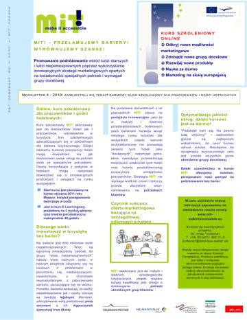 5 0 4 6 5 5 L L P 1 2 0 0 9 1 D E L E O N A R D O L M P MIT! – PRZEŁ AMUJEMY B ARIERY! WYRÓWNUJEMY SZANSE! Kurs szkoleniowy MIT! skierowany jest do kierowników hoteli jak I pracowników, udziałowców w turystyce, firm szkoleniowych specjalizujących się w szkoleniach dla sektora turystycznego. Dzięki naszemu kursowi pracownicy hoteli mogą dowiedzieć się jak dostosować swoje usługi do potrzeb osób ze specjalnymi potrzebami. Osoby korzystające z pobytów w hotelach mogą natomiast dowiedzieć się o innowacyjnych produktach i usługach na rynku europejskim. Zdobądź nowe grupy docelowe Rozwijaj nowe produkty Nauka za darmo Marketing na skalę europejską ZA R E J E S T R U J S IĘ T E R A Z ! D A R MO W Y K U R S S ZK O LE N IOW Y D LA P R A C OW N IK ÓW I G O Ś C I H O T E LOW YC H Online- kurs szkoleniowy dla pracowników i gości hotelowych: Odkryj nowe możliwości marketingowe Promowanie podróżowania wśród ludzi starszych i ludzi niepełnosprawnych poprzez wykorzystanie innowacyjnych strategii marketingowych opartych na świadomości specjalnych potrzeb i wymagań grupy docelowej. N EW S LE TT E R 4 - 2010: KURS SZKOLENIOWY ONLINE Start kursu jest planowany na koniec stycznia 2011 roku Miejsce: Instytut postępowania twórczego w Łodzi Jest to kurs E-Learningowy, podzielony na 3 moduły główne; czas trwania jest elastyczny, maksymalnie 40 godzin Na podstawie doświadczeń z lat poprzednich MIT! stawia na podejście innowacyjne: jako że w małych i średnich przedsiębiorstwach hotelowych poza barierami rozwoju wciąż młodego rynku turystyki dla wszystkich, często warunki architektoniczne nie pozwalają określić tych hoteli jako “dostępnych”, natomiast potrzebne inwestycje przeweższają możliwości właścicieli tych hoteli oraz rozwój produktów/usług przewyższa umiejętności pracowników. Strategia MIT! nie wymaga wielkich zmian I dotyczy przede wszystkim skoncentrowaniu na potrzebach klientów. Czynnik sukcesu: oferta marketingowa bazująca na szczegółowej informacji o hotelu Dlaczego warto inwestować w turystykę bez barier? Na świecie jest 650 milionów osób niepełnosprawnych. Więc są ogromną mniejszością. Jednak, do grupy “osób niepełnosprawnych” należy wiele różnych osób, w naszym projekcie skupiamy się na osobach z problemami w poruszaniu się, niedosłyszącymi, niewidomymi, z chorobami reumatoidalnymi, z zaburzeniami wzrostu, poruszające się na wózku. Ponadto, badania wskazują, że osoby niepełnosprawne jak i osoby starsze są bardziej lojalnymi klientami, zdecydowanie wolą podróżować poza sezonem a ich wypoczynek zazwyczaj trwa dłużej. Optymalizacja jakości usług: dzięki kursowi jest za darmo! “Podobało nam się. Na pewno tutaj wrócimy!” – zadowoleni goście są najlepszym wskaźnikiem, że nasz biznes odnosi sukces. Niezbędne do osiagnięcia wyznaczonego celu jest przede wszystkim jasne określenie grupy docelowej. Dzięki uczestnictwu w kursie MIT! oferujemy hotelom, pensjonatom nasz pomysł na podróżowanie bez barier. W celu uzyskania więcej informacji zapraszamy do odwiedzenia naszej strony: www.mitmakeitaccessible.eu Kontakt do koordynatora projektu: Dr. Imke Troltenier T. +49 (0) 6421 360 21-0 [email protected] MIT! skierowany jest do małych i średnich przedsiębiorstw turystycznych, projekt wspiera rozwój kwalifikacji jeśli chodzi o dostrzeganie potrzeb określonych grup klientów Projekt został sfinansowany dzięki wsparciu ze strony Komisji Europejskiej. Niniejsza publikacja jest tylko i wyłącznie odzwierciedleniem poglądów samego autora. Komisja nie ponosi żadnej odpowiedzialności za jakiekolwiek zastosowanie zawartych w niej informacji.