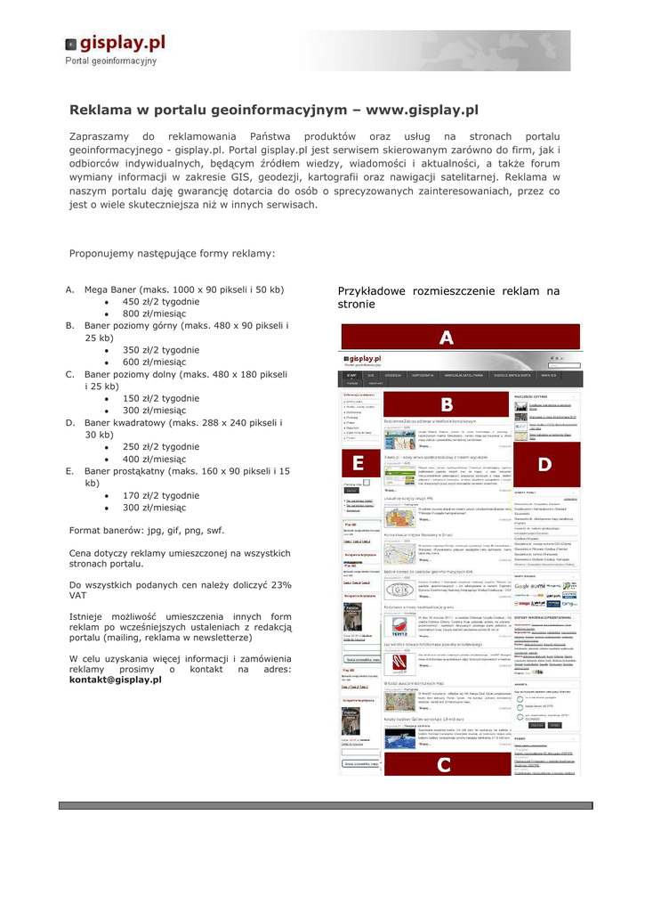 Reklama w portalu geoinformacyjnym – www.gisplay.pl Zapraszamy do reklamowania Państwa produktów oraz usług na stronach portalu geoinformacyjnego - gisplay.pl. Portal gisplay.pl jest serwisem skierowanym zarówno do firm, jak i odbiorców indywidualnych, będącym źródłem wiedzy, wiadomości i aktualności, a także forum wymiany informacji w zakresie GIS, geodezji, kartografii oraz nawigacji satelitarnej. Reklama w naszym portalu daję gwarancję dotarcia do osób o sprecyzowanych zainteresowaniach, przez co jest o wiele skuteczniejsza niż w innych serwisach. Proponujemy następujące formy reklamy: A. B. C. D. E. Mega Baner (maks. 1000 x 90 pikseli i 50 kb) 450 zł/2 tygodnie 800 zł/miesiąc Baner poziomy górny (maks. 480 x 90 pikseli i 25 kb) 350 zł/2 tygodnie 600 zł/miesiąc Baner poziomy dolny (maks. 480 x 180 pikseli i 25 kb) 150 zł/2 tygodnie 300 zł/miesiąc Baner kwadratowy (maks. 288 x 240 pikseli i 30 kb) 250 zł/2 tygodnie 400 zł/miesiąc Baner prostąkatny (maks. 160 x 90 pikseli i 15 kb) 170 zł/2 tygodnie 300 zł/miesiąc Format banerów: jpg, gif, png, swf. Cena dotyczy reklamy umieszczonej na wszystkich stronach portalu. Do wszystkich podanych cen należy doliczyć 23% VAT Istnieje możliwość umieszczenia innych form reklam po wcześniejszych ustaleniach z redakcją portalu (mailing, reklama w newsletterze) W celu uzyskania więcej informacji i zamówienia reklamy prosimy o kontakt na adres: [email protected] Przykładowe rozmieszczenie reklam na stronie