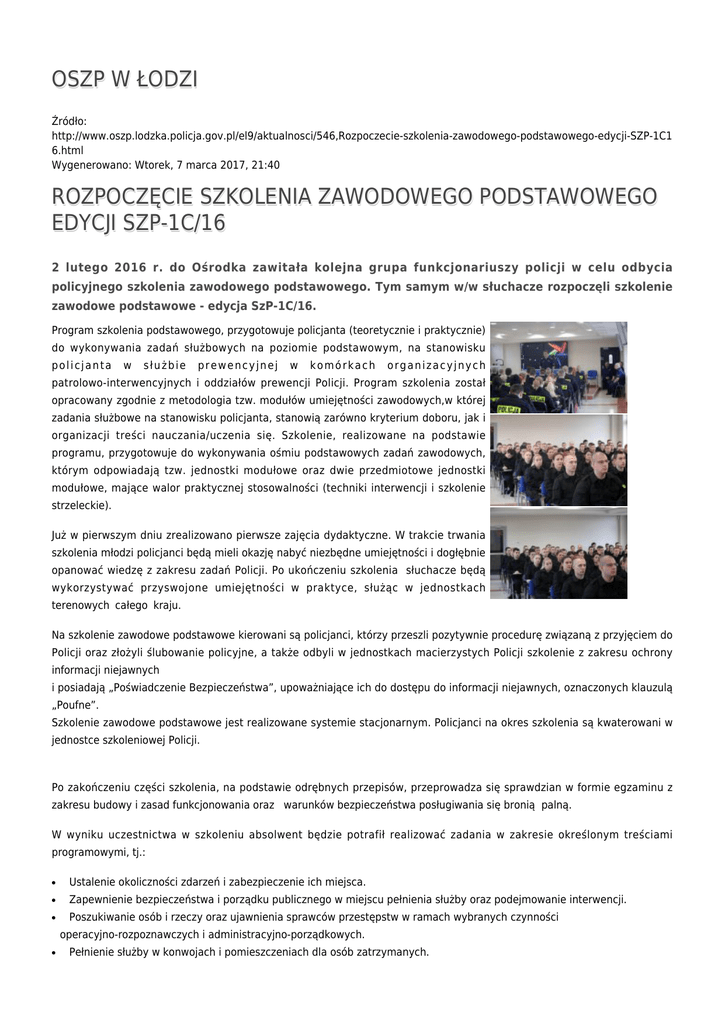 OSZP W ŁODZI Źródło: http://www.oszp.lodzka.policja.gov.pl/el9/aktualnosci/546,Rozpoczecie-szkolenia-zawodowego-podstawowego-edycji-SZP-1C1 6.html Wygenerowano: Wtorek, 7 marca 2017, 21:40 ROZPOCZĘCIE SZKOLENIA ZAWODOWEGO PODSTAWOWEGO EDYCJI SZP-1C/16 2 lutego 2016 r. do Ośrodka zawitała kolejna grupa funkcjonariuszy policji w celu odbycia policyjnego szkolenia zawodowego podstawowego. Tym samym w/w słuchacze rozpoczęli szkolenie zawodowe podstawowe - edycja SzP-1C/16. Program szkolenia podstawowego, przygotowuje policjanta (teoretycznie i praktycznie) do wykonywania zadań służbowych na poziomie podstawowym, na stanowisku policjanta w służbie prewencyjnej w komórkach organizacyjnych patrolowo-interwencyjnych i oddziałów prewencji Policji. Program szkolenia został opracowany zgodnie z metodologia tzw. modułów umiejętności zawodowych,w której zadania służbowe na stanowisku policjanta, stanowią zarówno kryterium doboru, jak i organizacji treści nauczania/uczenia się. Szkolenie, realizowane na podstawie programu, przygotowuje do wykonywania ośmiu podstawowych zadań zawodowych, którym odpowiadają tzw. jednostki modułowe oraz dwie przedmiotowe jednostki modułowe, mające walor praktycznej stosowalności (techniki interwencji i szkolenie strzeleckie). Już w pierwszym dniu zrealizowano pierwsze zajęcia dydaktyczne. W trakcie trwania szkolenia młodzi policjanci będą mieli okazję nabyć niezbędne umiejętności i dogłębnie opanować wiedzę z zakresu zadań Policji. Po ukończeniu szkolenia słuchacze będą wykorzystywać przyswojone umiejętności w praktyce, służąc w jednostkach terenowych całego kraju. Na szkolenie zawodowe podstawowe kierowani są policjanci, którzy przeszli pozytywnie procedurę związaną z przyjęciem do Policji oraz złożyli ślubowanie policyjne, a także odbyli w jednostkach macierzystych Policji szkolenie z zakresu ochrony informacji niejawnych i posiadają „Poświadczenie Bezpieczeństwa”, upoważniające ich do dostępu do informacji niejawnych, oznaczonych klauzulą „Poufne”. Szkolenie zawodowe podstawowe jest realizowane systemie stacjonarnym. Policjanci na okres szkolenia są kwaterowani w jednostce szkoleniowej Policji. Po zakończeniu części szkolenia, na podstawie odrębnych przepisów, przeprowadza się sprawdzian w formie egzaminu z zakresu budowy i zasad funkcjonowania oraz warunków bezpieczeństwa posługiwania się bronią palną. W wyniku uczestnictwa w szkoleniu absolwent będzie potrafił realizować zadania w zakresie określonym treściami programowymi, tj.: ● Ustalenie okoliczności zdarzeń i zabezpieczenie ich miejsca. ● Zapewnienie bezpieczeństwa i porządku publicznego w miejscu pełnienia służby oraz podejmowanie interwencji. ● Poszukiwanie osób i rzeczy oraz ujawnienia sprawców przestępstw w ramach wybranych czynności operacyjno-rozpoznawczych i administracyjno-porządkowych. ● Pełnienie służby w konwojach i pomieszczeniach dla osób zatrzymanych. ● Podejmowanie czynności wobec uczestników ruchu drogowego. ● Wykonywanie czynności w sprawach o wykroczenia. ● Przeciwdziałanie zjawiskom kryminogennym. ● Udział w działaniach związanych z przywracaniem zbiorowo naruszonego porządku publicznego. ● Szkolenie strzeleckie. ● Taktyka i techniki interwencji. Ocena: 0/5 (0) Tweetnij
