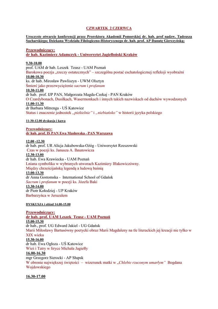 CZWARTEK 2 CZERWCA Uroczyste otwarcie konferencji przez Prorektora Akademii Pomorskiej dr. hab. prof nadzw. Tadeusza Sucharskiego; Dziekana Wydziału Filologiczno-Historycznego dr. hab. prof. AP Danutę Gierczyńską; Przewodniczący: dr hab. Kazimierz Adamczyk - Uniwersytet Jagielloński Kraków 9.30-10.00 prof. UAM dr hab. Leszek Teusz - UAM Poznań Barokowa poezja „rzeczy ostatecznych” – szczególna postać eschatologicznej refleksji wyobraźni 10.00-10.30 ks. dr hab. Mirosław Pawliszyn - UWM Olsztyn Śmierć jako przezwyciężenie sacrum i profanum 10.30-11.00 dr hab. prof. IJP PAN, Małgorzata Magda-Czekaj - PAN Kraków O Czardybonach, Dusiłkach, Wasermonkach i innych takich nazwiskach od duchów wywodzonych 11.00-11.30 dr Barbara Mitrenga - UŚ Katowice Status i znaczenie jednostek „piekielnie” i „niebiańsko” w historii języka polskiego 11-30-12.00 dyskusja i kawa Przewodniczący: dr hab. prof. IS PAN Ewa Masłowska - PAN Warszawa 12.00 -12.30 dr hab. prof. UR Alicja Jakubowska-Ożóg - Uniwersytet Rzeszowski Czas w poezji ks. Janusza A. Ihnatowicza 12.30-13.00 dr hab. Ewa Krawiecka - UAM Poznań Lniana symbolika w wybranych utworach Kazimiery Iłłakowiczówny. Między chrześcijańską legendą a ludową baśnią 13.00-13.30 dr Anna Gostomska - International School of Gdańsk Sacrum i profanum w poezji ks. Józefa Baki 13.30-14.00 dr Piotr Kołodziej - UP Kraków Barbarzyńca w Jeruzalem DYSKUSJA i obiad 14.00-15.00 Przewodniczący: dr hab. prof. UAM Leszek Teusz - UAM Poznań 15.00-15.30 dr hab., prof. UG Edward Jakiel - UG Gdańsk Marii Miłosławy Bartusówny poetycki obraz Marii Magdaleny na tle literackich jej kreacji nie tylko w XIX wieku 15.30-16.00 dr hab. Ewa Ogłoza - UŚ Katowice Wieś i Tatry w liryce Michała Jagiełły 16.00-16.30 mgr Grzegorz Sierocki - AP Słupsk W obronie największej świętości – wizerunek matki w „Chlebie rzuconym umarłym” Bogdana Wojdowskiego 16.30-17.00 mgr Rafał Piekarz - Gender Studies, Instytut Badań Literackich PAN w Warszawie Komunie ekskomunikowane. Niedogmatyczne wizualizacje Wieczerzy Pańskiej w perspektywie teologii feministycznej oraz teologii queer Przewodniczący: dr hab. prof. ATH Marek Bernacki – Akademia Techniczno-Humanistyczna Bielsko-Biała 17.00-17.30 dr. hab. Barbara Czarnecka - UMK Toruń Pamiątki po Auschwitz jako sacrum i profanum 17.30-18.00 dr hab. Kazimierz Adamczyk - Uniwersytet Jagielloński Kraków Sacrum i profanum w relacjach więźniów Sonderkommando w Auschwitz 18.00-18.30 dr Janusz Waligóra - UP Kraków Człowiek – ssak metafizyczny, Spięcia słów i wyładowania sensów w poezji Tadeusza Różewicza (w kontekście doświadczeń okupacyjnych) 18.30-19.00 mgr Dorota Zach - AP Słupsk Religijny wymiar wybranych utworów G. Herlinga-Grudzińskiego 19,00 – do końca................. dyskusja 20.00 uroczysta kolacja PIĄTEK 3 CZERWCA Przewodnicząca: dr hab. prof. UR. Alicja Jakubowska-Ożóg 9.00-9.30 dr hab.. prof. UMK Iwona Rzepnikowska UMK Toruń Piękna nieobecna, czyli Meluzyna w polskim folklorze bajkowym 9.30-10.00 prof. Henryk Gradkowski JWSZ Jelenia Góra W sidłach szatana. "Słońce w kuchni" Jarosława Iwaszkiewicza. 10.00-10.30 dr hab. prof. ATH Marek Bernacki Akademia Techniczno-Humanistyczna Bielsko-Biała Czesław Miłosz w krainie zaczarowanej. Interpretacja wiersza Obecność z tomu Wiersze ostatnie 10.30-11.00 mgr Anna Radzewicz-Borg UG Gdansk Demony Miłosza 11.00-11.30 dr Paweł Sporek UP Kraków Ku czci szatana? Motyw ofiary w powieściach Cormaca McCarthy’ego 11.30 – 12.00 KAWA I DYSKUSJA Przewodniczący: dr hab. prof. UG Edward Jakiel UG Gdańsk 12.00-12.30 dr Stefan Pastuszewski - Towarzystwo Inicjatyw Kulturalnych Bydgoszcz Sacrum w przestrzeni publicznej rosyjskiego staroprawosławia 12.30-13.00 dr Zbigniew Landowski UG Gdańsk Sacrum i profanum w islamie ludowym na przykładzie Kitāb 'alf layla wa-layla". 13.00-13.30 mgr Karolina Keler AP Słupsk Życie codzienne kobiety na Gochach. Odsłona sacrum i profanum , 13.30-14.00 dr Agnieszka Gołębiowska-Suchorska - Uniwersytet Kazimierza Wielkiego Bydgoszcz Głuchy anioł i królewna niemowa, czyli o roli niedoskonałości w świecie „sacrum” i „profanum” (na materiale folkloru słowiańskiego) 14.00-15.00 DYSKUSJA I OBIAD przewodnicząca: dr hab.. prof. nadzw. Urszula Kopeć - Uniwersytet Rzeszowski 15.00-15.30 dr Katarzyna Stark - Akademia Górniczo-Hutnicza Kraków „Sacrum w malarstwie ikonicznym Jerzego Nowosielskiego” 15.30-16.00 mgr Dorota Dec AkaP Słupsk Religijność jako podstawa sztuki w ujęciu C.K. Norwida w kontekście malarstwa Rafaela Santi 16.00-16.30 mgr Justyna Borkowska AP Słupsk "Sacrum i profanum w tekstach i koncepcjach Witkacego". 16.30-17.00 dr Marta Szymańska UP Kraków Wszystko na sprzedaż? — Praktyki ery konsumpcjonizmu w sferze sacrum 17.00 - dyskusja SOBOTA 4 CZERWCA Przewodnicząca: dr hab. prof. IJP PAN, Małgorzata Magda-Czekaj PAN Kraków 9.00-9.30 dr hab., prof. IS PAN Ewa Masłowska - PAN Warszawa Anima Mundi w perspektywie etnolingwistyczne 9.30-10.00 dr hab. prof. UR Urszula Kopeć - UR Rzeszów Leksykalne wykładniki profanum na przykładzie opowiadania Josepha Conrada "Jądro ciemności" 10.00-10.30 mgr Iwona Płóciennik – AP Słupsk Kategoria sacrum w pismach Norwida z perspektywy nowotworów językowych poety. , 10.30-11.00 mgr Kamila Gieba – UZ Zielona Góra Elementy sacrum w polskiej literaturze powojennej – miejsce wątków biblijnych w narracji założycielskiej tzw. Ziem Odzyskanych 11.00 – 11.30 kawa i dyskusja Przewodnicząca: dr Grażyna Różańska 11.30-12.00 dr Ewa Bielińska-Galas - Biblioteka Narodowa w Warszawie i Akademia Muzyczna w Łodzi ”Vitia i absoniae w średniowiecznej teorii i praktyce śpiewu”. 12.00-12.30 mgr Joanna Sowa - AP Słupsk Muzyka sferą sacrum dla wykonującego ją artysty na przykładzie wywiadu – rzeki z Tomaszem Stańką 12.30-13.00 mgr Paweł Wiktor Ryś - UJ Kraków Salò, czyli 120