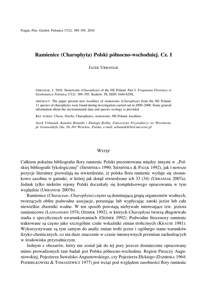 Fragm. Flor. Geobot. Polonica 17(2): 389–395, 2010 Ramienice (Charophyta) Polski północno-wschodniej. Cz. I JACEK URBANIAK URBANIAK, J. 2010. Stoneworts (Charophyta) of the NE Poland. Part I. Fragmenta Floristica et Geobotanica Polonica 17(2): 389–395. Kraków. PL ISSN 1640-629X. ABSTRACT: The paper present new localities of stoneworts (Charophyta) from the NE Poland. 11 species of charophytes were found during investigation carried out in 2000–2008. Some general information about the environmental data and species ecology is provided. KEY WORDS: Chara, Nitella, Charophytes, stoneworts, NE Poland, localities Jacek Urbaniak, Katedra Botaniki i Ekologii Roślin, Uniwersytet Przyrodniczy we Wrocławiu, pl. Grunwaldzki 24a, 50–363 Wrocław, Polska; e-mail: [email protected] WSTĘP Całkiem pokaźna bibliografia flory ramienic Polski prezentowana między innymi w „Polskiej bibliografii fykologicznej” (SIEMIŃSKA 1990; SIEMIŃSKA & PAJĄK 1992), jak i nowsze pozycje literatury pozwalają na stwierdzenie, iż polska flora ramienic wydaje się stosunkowo zasobna w gatunki, w której jak dotąd stwierdzono ich 33 (34) (URBANIAK 2007a). Jednak tylko niektóre rejony Polski doczekały się kompleksowego opracowania w tym względzie (URBANIAK 2007b). Ramienice (Characeae, Charophyta) często są dominującą grupą organizmów wodnych, tworzących obfite podwodne asocjacje, porastając lub wypłycając zatoki jezior lub całe niewielkie zbiorniki wodne. W ten sposób powstają niebywale interesujące tzw. jeziora ramienicowe (LANGANGEN 1974; OZIMEK 1992), w których Charophyta tworzą długotrwałe stadia o specyficznych uwarunkowaniach (OZIMEK 1992). Podwodne fitocenozy ramienic traktowane są często jako szczególnie czułe wskaźniki zmian troficznych (KRAUSE 1981). Wykorzystywane są tym samym do analiz zmian trofii jezior i ogólnego stanu warunków fizyko-chemicznych, co ma duże znaczenie w czasie intensywnych przemian zachodzących w środowisku przyrodniczym. Jednym z obszarów, który nie został jak do tej pory jeszcze dostatecznie opracowany mimo prowadzonych tam badań jest Polska pólnocno-wschodnia. Region Puszczy Augustowskiej, Pojezierza Suwalsko-Augustowskiego, czy Pojezierza Ełckiego (DĄMBSKA 1964; PODBIELKOWSKI & TOMASZEWICZ 1977) jest wciąż pod względem zasobności flory ramienic 390 Fragm. Flor. Geobot. Polonica 17(2), 2010 niedostatecznie poznany. Dlatego też niniejsza praca prezentuje nowe, niepublikowane dotąd informacje o występowaniu ramienic z Polski północno-wschodniej czyli regionu Zielonych Płuc Polski. MATERIAŁ I METODY Polska Północno Wschodnia pod względem geograficznym jest częścią makroregionu Pojezierza Litewskiego, którego większość znajduje się na terytorium Republiki Litewskiej. Podobnie jak w innych pojezierzach, silnie zaznacza się tu wpływ zlodowaceń (faza leszczyńska, poznańska i pomorska) oraz klimatu kontynentalnego ze wszystkimi tego konsekwencjami fenologicznymi. Zachodnia część Pojezierza Litewskiego bywa określana jako Pojezierze Suwalsko-Augustowskie bądź właśnie Polska Północno-Wschodnia (KONDRACKI 2002). Mniejszymi jednostkami geograficznymi, które objęły badania są: Wigierski Park Narodowy, Suwalski Park Krajobrazowy, Pojezierze Augustowskie, Pojezierze Ełckie, Puszcza Augustowska i Pojezierze Suwalskie. Badany region jest bogaty w jeziora, w tym jedno z większych w Polsce jez. Wigry oraz jez. Hańcza – najgłębsze jezioro Polski. Większość badanych jezior charakteryzuje się umiarkowaną przejrzystością wody do 3 m według krążka Sechiego i posiada charakter zbiorników eutroficznych lub mezotroficznych (np. plosa jez. Wigry). Rozbudowana linia brzegowa wielu jezior, zróżnicowane pod względem morfometrycznym i morfologicznym rozległe płycizny i zatoczki sprzyjają warunkom do tworzenia mozaikowatych siedlisk unikatowych i bogatych zespołów roślinnych w tym ramienic. Jeziora o najwyższej przejrzystości do 7–8 m według krążka Sechiego: jez. Hańcza, jez. Białe Wigierskie. Badaniami objęto również jeziora dystroficzne Wigierskiego Parku Narodowego, jednak glonów z gromady Charophyta w nich nie stwierdzono. Badania terenowe były prowadzone przez autora w latach 2000–2008 (Ryc. 1). Objęto nimi głównie jeziora, wraz z przyległymi do nich strefami odciętych i wypłyconych zatok, jak i powstałe i okresowo utrzymujące się zbiorniki w zagłębieniach terenowych Suwalskiego Parku Krajobrazowego i części północnej badanego obszaru. W sumie przebadano około 31zbiorników wodnych o różnej trofii i charakterze morfometrycznym; w większych jeziorach wyróżniano osobne stanowiska. W wykazie uwzględniono materiały zielnikowe na podstawie wykazu gatunku i stanowisk w publikacjach STANGENBERGA (1934), DĄMBSKIEJ (1966) oraz PODBIELKOWSKIEGO i TOMASZEWICZA (1977). Gatunki zebrane przez autora w miejscach opisywanych przez autorów nie były wykazywane. Całość flory ramienic Polski północno-wschodniej, po rewizji gatunków w herbariach będzie przedmiotem osobnej publikacji. Nomenklatura gatunków oraz układ systematyczny są zgodne z publikacją KRAUSE (1997). Lokalizacja stanowisk została podana w sieci ATPOL, przy czym zgodnie z metodyką zaproponowaną przez ZAJĄCA (1978) cyfry znajdujące się po symbolach literowych oznaczają numer kwadratu o boku 10 km. Materiał dokumentacyjny prezentowanej pracy, znajduje się w prywatnej kolekcji autora. WYKAZ GATUNKÓW Chara aspera Dethard. ex Willd. 1809: pow. Augustów, Upustek, jez. Blizno (ATPOL FB 29), 30.06.2008; pow. Gołdap, Pobłędzie, jez. Pobłędzie NW brzeg (ATPOL: FA 87), 23.07.2003; pow. Sejny, Wiłkokuk, jez. Zelwa (ATPOL: GB 11), 30.06.2008. Chara contraria A. Br. ex Kütz. 1845: pow. Augustów, Mołowiste, jez. Serwy (ATPOL: GB 20), 01.07.2001; pow. Augustów, Płaska, jez. Gorczyckie (ATPOL: GB 20), 19.07.2003; pow. Augustów, Sucha Rzeczka, jez. Serwy przy jazie (ATPOL: GB 30), 19.07.