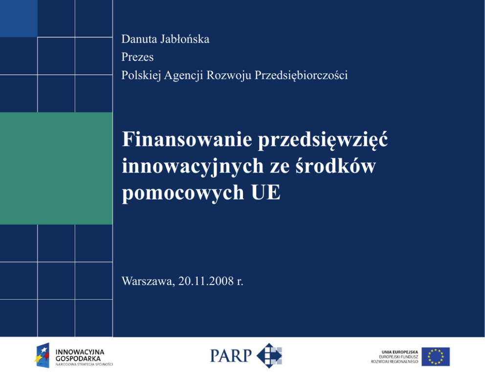 Danuta Jabłońska Prezes Polskiej Agencji Rozwoju Przedsiębiorczości Finansowanie przedsięwzięć innowacyjnych ze środków pomocowych UE Warszawa, 20.11.2008 r. Warszawa, 20.11.2008 r. POLSKA AGENCJA ROZWOJU PRZEDSIĘBIORCZOŚCI działa od 1 stycznia 2001 r., powołana na mocy ustawy, podlega Ministrowi Gospodarki. DZIAŁA NA RZECZ: małych i średnich przedsiębiorstw (MSP) eksportu rozwoju regionalnego wykorzystania nowych technik i technologii tworzenia nowych miejsc pracy przeciwdziałania bezrobociu rozwoju zasobów ludzkich Warszawa, 20.11.2008 r. Wspieramy innowacyjność – dlaczego? Innowacyjność polskich MSP można określić jako „zaawansowane raczkowanie”. Wskaźnik innowacyjności dla Polski jest o połowę niższy od średniej UE (Polska - 0,24 ; UE - 0,46). Liczba patentów zgłaszanych przez polskie podmioty jest mniejsza niż w UE. (ok. 2% w stosunku do średniej unijnej, która wynosi 136,7 patentów na 1 mln mieszkańców). Polskie firmy w niewielkim stopniu wykorzystują technologie informacyjno-telekomunikacyjne. Polskie firmy w niewielkim stopniu zainteresowane są prowadzeniem prac B+R. (Wydatki na naukę wynoszą w Polsce 0,6% PKB, przy średniej unijnej 1,8% PKB z czego prawie 60% to wydatki budżetu państwa.) Warszawa, 20.11.2008 r. Innowacyjność polskich MSP Sumaryczny indeks innowacyjności 2007 • Wartość dla Polski – 0,24 • Średnia UE27 – 0,46 • Szwecja (lider) – 0,73 • Polska wyprzedza : Chorwację, Bułgarię, Łotwę, Rumunię, Turcję Polska ↓ Warszawa, 20.11.2008 r. Główne bariery dla innowacyjności – w świetle badań PARP * Brak zewnętrznego finansowania procesów innowacyjnych, Czynniki organizacyjne (m.in. niedostosowanie infrastruktury organizacyjnej do wymagań procesów innowacyjnych), Wewnętrzne czynniki ekonomiczne (szczególnie dla przedsiębiorstw zlokalizowanych w regionach najuboższych), Czynniki rynkowe (niepewny popyt i opanowanie rynku przez dominujące przedsiębiorstwo), Bariery związane z wiedzą (problemy w znalezieniu partnerów zgłaszane przeciętnie przez 22% MSP oraz brak wykwalifikowanego personelu – średnio 15% MSP). * Kierunki inwestowania w nowoczesne technologie w przedsiębiorstwach MSP, PARP, Warszawa 2007 Warszawa, 20.11.2008 r. Pomoc unijna udzielana przez PARP w latach 2007-2013 PARP w perspektywie finansowej 2007-2013 jest zaangażowana we wdrażanie trzech programów operacyjnych, realizowanych w ramach Narodowych Strategicznych Ram Odniesienia 2007-2013: Programu Operacyjnego Innowacyjna Gospodarka (PO IG) - budżet 3,9 mld EUR Programu Operacyjnego Kapitał Ludzki (PO KL) - budżet 672 mln EUR Programu Operacyjnego Rozwój Polski Wschodniej (PO RPW) - budżet 2,6 mld EUR Wartość podpisanych umów: 998 mln zł (ok. 285 mln euro) Całkowity budżet NSRO na lata 2007-2013 wynosi 85,6 mld euro, co odpowiada rocznym wydatkom w wysokości 5% polskiego PKB. Udział finansowy programów operacyjnych w NSRO wdrażanych przez PARP: 7 172 mld EUR (8,4% budżetu NSRO). Warszawa, 20.11.2008 r. PROGRAM OPERACYJNY INNOWACYJNA GOSPODARKA Rodzaje wsparcia oferowane w ramach PO IG przez PARP: Bezpośrednie wsparcie dla przedsiębiorców dotacje na innowacyjne inwestycje, dotacje na B+R i wdrażanie wyników prac B+R, dotacje na rozwijanie działalności B+R przedsiębiorstw, ochrona własności przemysłowej, wsparcie w zakresie wzornictwa przemysłowego, doradztwo i wsparcie w pozyskiwaniu zewnętrznego finansowania, projekty związane z gospodarką elektroniczną, dotacje na doradztwo do wejścia przedsiębiorców na rynki zagraniczne. Warszawa, 20.11.2008 r. PROGRAM OPERACYJNY INNOWACYJNA GOSPODARKA Rodzaje wsparcia oferowane w ramach PO IG przez PARP: Bezpośrednie wsparcie dla instytucji otoczenia biznesu wsparcie rozwoju klastrów, wsparcie dla parków technologicznych i centrów transferu technologii, wsparcie dla instytucji otoczenia biznesu działających na rzecz rozwoju innowacyjności, rozwój sieci instytucji otoczenia biznesu, rozwijanie alternatywnych form zewnętrznego finansowania rozwoju przedsiębiorstw. Warszawa, 20.11.2008 r. 1.4 Wsparcie projektów celowych 4.1 Wsparcie wdrożeń wyników prac B+R Wsparcie na przedsięwzięcia techniczne, technologiczne lub organizacyjne (badania przemysłowe i prace rozwojowe). Dofinansowanie wydatków na prace B+R do momentu stworzenia prototypu (Działanie 1.4.) oraz wdrożeniowej części projektu (Działanie 4.1.). PO IG Działanie 1.4 Wnioskodawcy PO IG Działanie 4.1 MSP oraz duże firmy Budżet działania 390 mln EUR 390 mln EUR Wartość projektu maks. 25 mln EUR maks. 50 mln EUR Cel działania Podniesienie innowacyjności przedsiębiorców dzięki wykorzystaniu rezultatów prac B+R Poprawa poziomu innowacyjności przedsiębiorstw poprzez wspieranie wyników wdrożeń B+R Wybrane wskaźniki rezultatu Liczba przedsiębiorstw współpracujących z jednostkami naukowymi, wzrost zatrudnienia w działalności B+R, wzrost nakładów na B+R Wartość zmobilizowanych środków prywatnych, liczba wprowadzonych na rynek nowych technologii Warszawa, 20.11.2008 r. 3.1 Inicjowanie działalności innowacyjnej 3.3 Tworzenie systemu ułatwiającego inwestowanie w MSP 3.1 Wsparcie na tworzenia nowych przedsiębiorstw na bazie innowacyjnych pomysłów (doradztwo, udostępnianie infrastruktury, usług, zasilenie finansowe nowopowstałego przedsiębiorstwa). 3.3 Wsparcie na przygotowanie przedsiębiorców do pozyskania zewnętrznego źródła finansowania (też o charakterze udziałowym), wsparcie sieci inwestorów (anioły biznesu, fundusze venture capital); zwiększenie świadomości przedsiębiorców o korzyściach i usługach oferowanych przez te sieci. PO IG Działanie 3.1 Wnioskodawcy Budżet działania PO IG Działanie 3.3 Instytucje wspierające powstawanie innowacyjnych przedsiębiorstw, instytucje otoczenia biznesu (IOB), przedsiębiorstwa MSP 110 mln EUR 50 mln EUR Cel działania Zwiększenie liczby przedsiębiorców działającyc