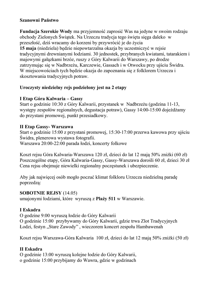 Szanowni Państwo Fundacja Szerokie Wody ma przyjemność zaprosić Was na jedyne w swoim rodzaju obchody Zielonych Świątek. Na Urzeczu tradycja tego święta sięga daleko w przeszłość, dziś wracamy do korzeni by przywrócić je do życia 15 maja (niedziela) będzie niepowtarzalna okazja by uczestniczyć w rejsie tradycyjnymi drewnianymi łodziami. 30 jednostek, przybranych kwiatami, tatarakiem i majowymi gałązkami brzóz, ruszy z Góry Kalwarii do Warszawy, po drodze zatrzymując się w Nadbrzeżu, Karczewie, Gassach i w Otwocku przy ujściu Świdra. W miejscowościach tych będzie okazja do zapoznania się z folklorem Urzecza i skosztowania tradycyjnych potraw. Uroczysty niedzielny rejs podzielony jest na 2 etapy I Etap Góra Kalwaria – Gassy Start o godzinie 10:30 z Góry Kalwarii, przystanek w Nadbrzeżu (godzina 11-13, występy zespołów regionalnych, degustacja potraw), Gassy 14:00-15:00 dojeżdżamy do przystani promowej, punkt przesiadkowy. II Etap Gassy- Warszawa Start o godzinie 15:00 z przystani promowej, 15:30-17:00 przerwa kawowa przy ujściu Świdra, plenerowa wystawa fotografii. Warszawa 20:00-22:00 parada łodzi, koncerty folkowe Koszt rejsu Góra Kalwaria-Warszawa 120 zł, dzieci do lat 12 mają 50% zniżki (60 zł) Poszczególne etapy, Góra Kalwaria-Gassy, Gassy-Warszawa dorośli 60 zł, dzieci 30 zł Cena rejsu obejmuje niewielki regionalny poczęstunek i ubezpieczenie. Aby jak najwięcej osób mogło poczuć klimat folkloru Urzecza niedzielną paradę poprzedzą: SOBOTNIE REJSY (14.05) umajonymi łodziami, które wyruszą z Plaży 511 w Warszawie. I Eskadra O godzine 9:00 wyruszą łodzie do Góry Kalwarii O godzinie 15:00 przybywamy do Góry Kalwarii, gdzie trwa Zlot Tradycyjnych Łodzi, festyn „Stare Zawody” , wieczorem koncert zespołu Hambawenah Koszt rejsu Warszawa-Góra Kalwaria 100 zł, dzieci do lat 12 mają 50% zniżki (50 zł) II Eskadra O godzinie 13:00 wyruszą kolejne łodzie do Góry Kalwarii, o godzinie 15:00 przybijamy do Wawra, gdzie w godzinach 15:00-21:00 trwa festyn „Po kolana w rzece”, występy zespołów: Kapela ze Wsi Warszawa, Kapela Niwińskich. O godzinie 16:30 ruszamy do Góry Kalwarii, dopływamy do portu na godzinę 19:00 gdzie trwa Zlot Łodzi Tradycyjnych, wieczorem koncert zespołu Hambawenah. Koszt rejsu Warszawa-Góra Kalwaria 100 zł, dzieci do lat 12 mają 50% zniżki (50 zł) UWAGA! Uczestników prosimy o uwzględnienie kaprysów aury przy doborze strojów. Zawsze warto mieć nakrycie głowy (o udar słoneczny na wodzie wyjątkowo łatwo) krem z filtrem przeciw poparzeniom słonecznym, coś od deszczu, choćby i cieniutki płaszcz foliowy i na wszelki wypadek coś cieplejszego. Słońce o poranku, niekoniecznie świecić będzie i w południe a przelotne opady nie są czymś niezwykłym w środku maja. Suchy prowiant i napoje na całodzienną wycieczkę też warto zabrać ze sobą. PIĄTEK WIECZOREM 13.05 Tych, co nie mogą płynąć ani w sobotę ani w niedzielę, zapraszamy na rejs umajonymi łodziami, by choć w części poczuli klimat Zielonych Świątek. O godzinie 18:00 wypływamy z plaży Saska Kępa, kierujemy się do przystani 511 (zabieramy kolejnych pasażerów) i z biegiem rzeki udajemy się na plażę Rusałka przy przystani Aqutica na prawym brzegu Wisły. Będą Państwo mieli okazję podziwiać panoramę Stolicy, jak z obrazów Canaletta, w promieniach zachodzącego słońca. Na godzinę 20:20, zgodnie z przepisami, wracamy do przystani w 511 Koszt rejsu 50 zł od osoby. Opłaty rejsowe należy wpłacać na konto Fundacji Szerokie Wody, z tytułem: Darowizna na rzecz Fundacji Szerokie Wody + imię i nazwisko wpłacającego 43 1140 2004 0000 3402 7508 7513 Gwarancją rezerwacji jest przesłanie potwierdzenia przelewu na adres [email protected] Kontakt telefoniczny: Ewa Jachowska 517 38 26 44 Serdecznie zapraszamy