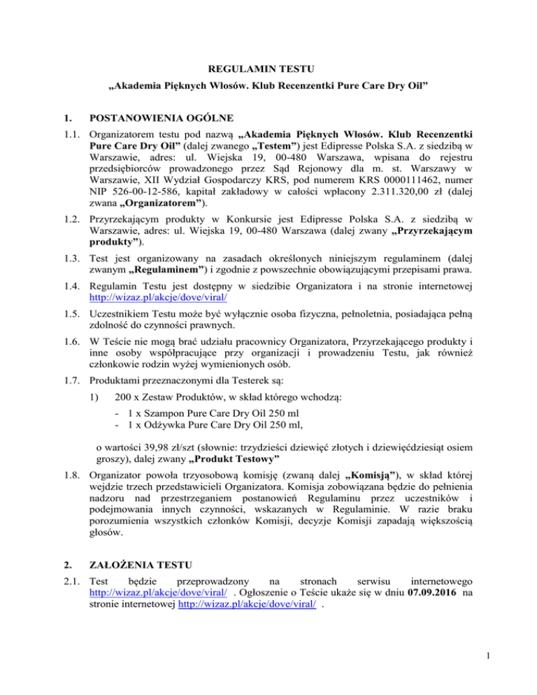 REGULAMIN TESTU „Akademia Pięknych Włosów. Klub Recenzentki Pure Care Dry Oil” 1. POSTANOWIENIA OGÓLNE 1.1. Organizatorem testu pod nazwą „Akademia Pięknych Włosów. Klub Recenzentki Pure Care Dry Oil” (dalej zwanego „Testem”) jest Edipresse Polska S.A. z siedzibą w Warszawie, adres: ul. Wiejska 19, 00-480 Warszawa, wpisana do rejestru przedsiębiorców prowadzonego przez Sąd Rejonowy dla m. st. Warszawy w Warszawie, XII Wydział Gospodarczy KRS, pod numerem KRS 0000111462, numer NIP 526-00-12-586, kapitał zakładowy w całości wpłacony 2.311.320,00 zł (dalej zwana „Organizatorem”). 1.2. Przyrzekającym produkty w Konkursie jest Edipresse Polska S.A. z siedzibą w Warszawie, adres: ul. Wiejska 19, 00-480 Warszawa (dalej zwany „Przyrzekającym produkty”). 1.3. Test jest organizowany na zasadach określonych niniejszym regulaminem (dalej zwanym „Regulaminem”) i zgodnie z powszechnie obowiązującymi przepisami prawa. 1.4. Regulamin Testu jest dostępny w siedzibie Organizatora i na stronie internetowej http://wizaz.pl/akcje/dove/viral/ 1.5. Uczestnikiem Testu może być wyłącznie osoba fizyczna, pełnoletnia, posiadająca pełną zdolność do czynności prawnych. 1.6. W Teście nie mogą brać udziału pracownicy Organizatora, Przyrzekającego produkty i inne osoby współpracujące przy organizacji i prowadzeniu Testu, jak również członkowie rodzin wyżej wymienionych osób. 1.7. Produktami przeznaczonymi dla Testerek są: 1) 200 x Zestaw Produktów, w skład którego wchodzą: - 1 x Szampon Pure Care Dry Oil 250 ml - 1 x Odżywka Pure Care Dry Oil 250 ml, o wartości 39,98 zł/szt (słownie: trzydzieści dziewięć złotych i dziewięćdziesiąt osiem groszy), dalej zwany „Produkt Testowy” 1.8. Organizator powoła trzyosobową komisję (zwaną dalej „Komisją”), w skład której wejdzie trzech przedstawicieli Organizatora. Komisja zobowiązana będzie do pełnienia nadzoru nad przestrzeganiem postanowień Regulaminu przez uczestników i podejmowania innych czynności, wskazanych w Regulaminie. W razie braku porozumienia wszystkich członków Komisji, decyzje Komisji zapadają większością głosów. 2. ZAŁOŻENIA TESTU 2.1. Test będzie przeprowadzony na stronach serwisu internetowego http://wizaz.pl/akcje/dove/viral/ . Ogłoszenie o Teście ukaże się w dniu 07.09.2016 na stronie internetowej http://wizaz.pl/akcje/dove/viral/ . 1 2.2. Test będzie trwał w dniach od 07.09.2016 do 09.10.2016 r. przy założeniu, że Zgłoszenia do Testu można dokonywać w dniach 07.09.2016 – 20.09.2016. 2.3 Rozwiązanie Testu, w tym lista Testerek, zostanie ogłoszone na stronie internetowej http://wizaz.pl/akcje/dove/viral/ w terminie nie później niż do dnia 23.09.2016 r. 3. ZASADY PROWADZENIA TESTU 3.1. W celu wzięcia udziału w Teście uczestnik powinien: 1) wypełnić formularz zgłoszeniowy znajdujący się na stronie internetowej http://wizaz.pl/akcje/dove/viral/ , w tym złożyć stosowne oświadczenia i udzielić stosownych zgód stanowiących integralną część formularza zgłoszeniowego; 2) wypełnić ankietę i udzielić odpowiedzi na znajdujące się w formularzu zgłoszeniowym pytanie otwarte „Napisz, dlaczego chciałabyś przetestować szampon i odżywkę Dove Pure Care Dry Oil” (dalej zwanej „Odpowiedzią”); 3) przesłać formularz zgłoszeniowy do Organizatora za pomocą znajdującego się na dole formularza przycisku „Wyślij zgłoszenie”. 4) podać dane osobowe niezbędne do wysyłki Produktu 3.2. Jeden uczestnik może wziąć udział w Teście tylko jeden raz. 3.3. Spośród wszystkich poprawnie przesłanych Odpowiedzi na pytanie otwarte, Komisja wybierze 200 najlepszych Odpowiedzi. Przy wyborze najlepszych Odpowiedzi Komisja będzie się kierować własnym uznaniem, biorąc pod uwagę walory artystyczne Odpowiedzi, w szczególności oryginalność i pomysłowość uczestnika – autora Odpowiedzi. Nie ma znaczenia kolejność zgłoszeń. 3.4. Testerkami w liczbie 200 zostaną uczestnicy, których Odpowiedzi na pytanie otwarte zostaną uznane przez Komisję za najlepsze zgodnie z pkt 3.4 powyżej, zwani dalej „Testerami”. Produkty zostaną przyznane po spełnieniu warunków określonych w Regulaminie. 3.5. Uczestnik oświadcza, że Odpowiedź na pytanie otwarte jest unikalną treścią, stworzoną przez niego specjalnie w celu wzięcia udziału w Teście, jak również, że nie jest publikowana w innych serwisach internetowych. 3.6. Uczestnik niniejszym oświadcza, że: (i) jest jedynym autorem Odpowiedzi zgłoszonej przez niego do Testu; (ii) Odpowiedź nie narusza praw osób trzecich; (iii) w przypadku, jeżeli Odpowiedź stanowi utwór, w rozumieniu ustawy z dnia 4 lutego 1994 r. o prawie autorskim i prawach pokrewnych, przysługują mu autorskie prawa majątkowe do Odpowiedzi, w zakresie niezbędnym do udzielenia licencji (iv) Odpowiedź nie stanowi opracowania w rozumieniu ustawy z dnia 4 lutego 1994 r. o prawie autorskim i prawach pokrewnych. 3.7. Odpowiedzi na pytanie otwarte nie spełniające wymogów Regulaminu będą wykluczane z Testu przez Organizatora. 3.8. Do dnia 03.10.2016 r. Testerka otrzyma wiadomość drogą mailową z linkiem do ankiety wynikowej, którą zobowiązana jest wypełnić do dnia 09.10.2016 (zwanej dalej „Ankietą Wynikową”). 3.9. Do dnia 17.10.2016 r. Testerka otrzyma wiadomość mailową z prośbą o zamieszczenie swojej opinii o testowanym Produkcie w Katalogu Kosmetyku Wszech Czasów. 2 3.10. Organizator oświadcza, że dane osobowe uczestnika w zakresie: imię i nazwisko, adres email, numer telefonu komórkowego i adres zamieszkania, będą przetwarzane przez Organizatora w celu realizacji umowy przystąpienia do Testu i jego prawidłowego przeprowadzenia lub marketingu bezpośredniego własnych produktów Organizatora i Przyrzekającego produkt. Organizator gwarantuje prawo wglądu uczestnika do jego danych osobowych i do ich poprawiania, jak również do żądania 