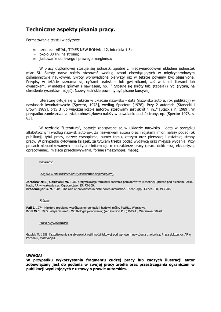 Techniczne aspekty pisania pracy. Formatowanie tekstu w edytorze • • • czcionka: ARIAL, TIMES NEW ROMAN, 12, interlinia 1.5; około 30 linii na stronie; justowanie do lewego i prawego marginesu; W pracy dyplomowej stosuje się jednostki zgodne z międzynarodowym układem jednostek miar SI. Skróty nazw naleŜy stosować według zasad obowiązujących w międzynarodowym piśmiennictwie naukowym. Skróty wprowadzone pierwszy raz w tekście powinny być objaśnione. Przypisy w tekście zaznacza się cyframi arabskimi lub gwiazdkami, zaś w tabeli literami lub gwiazdkami, w indeksie górnym z nawiasem, np. 1). Stosuje się skróty tab. (tabela) i ryc. (rycina, na określenie rysunków i zdjęć). Nazwy łacińskie powinny być pisane kursywą. Literaturę cytuje się w tekście w układzie nazwisko - data (nazwisko autora, rok publikacji) w nawiasach kwadratowych: [Spector, 1978], według Spectora [1978]. Przy 2 autorach [Stanecki i Brown 1989], przy 3 lub większej liczbie autorów stosowany jest skrót "i in.." [Stack i in, 1989]. W przypadku zamieszczania cytatu obowiązkowo naleŜy w powołaniu podać strony, np. [Spector 1978, s. 83]. W rozdziale "Literatura", pozycje zapisywane są w układzie nazwisko - data w porządku alfabetycznym według nazwisk autorów. Za nazwiskiem autora oraz inicjałami imion naleŜy podać rok publikacji, tytuł pracy, nazwę czasopisma, numer tomu, zeszytu oraz pierwszej i ostatniej strony pracy. W przypadku cytowania ksiąŜek, za tytułem trzeba podać wydawcę oraz miejsce wydania. Przy pracach niepublikowanych - po tytule informacje o charakterze pracy (praca doktorska, ekspertyza, opracowanie), miejscu przechowywania, formie (maszynopis, mapa). Przykłady: Artykuł w czasopiśmie lub wydawnictwie nieperiodyczny Jarosiewicz B., Gosiewski W. 1986. Optymalizacja terminów sadzenia pomidorów w wiosennej uprawie pod osłonami. Zesz. Nauk, AR w Krakowie ser. Ogrodnictwo, 15, 73-109. Bredemeijer G. M. 1984. The role of prexidases in pistil-pollen interaction. Theor. Appl. Genet., 68, 193-206. KsiąŜka Pali J. 1974. Niektóre problemy współczesnej genetyki i hodowli roślin. PWRiL., Warszawa. Briill W.J. 1985. Wiązanie azotu. W: Biologia plonowania; (red Garison P.S.) PWRiL., Warszawa, 58-78. Praca niepublikowana Grzelak M. 1988. Kształtowanie się zbiorowisk roślinności łąkowej pod wpływem nawoŜenia gnojowicą. Praca doktorska, AR w Poznaniu, maszynopis. UWAGA! W przypadku wykorzystania fragmentu cudzej pracy lub cudzych ilustracji autor zobowiązany jest do podania w swojej pracy źródła oraz przestrzegania ograniczeń w publikacji wynikających z ustawy o prawie autorskim.