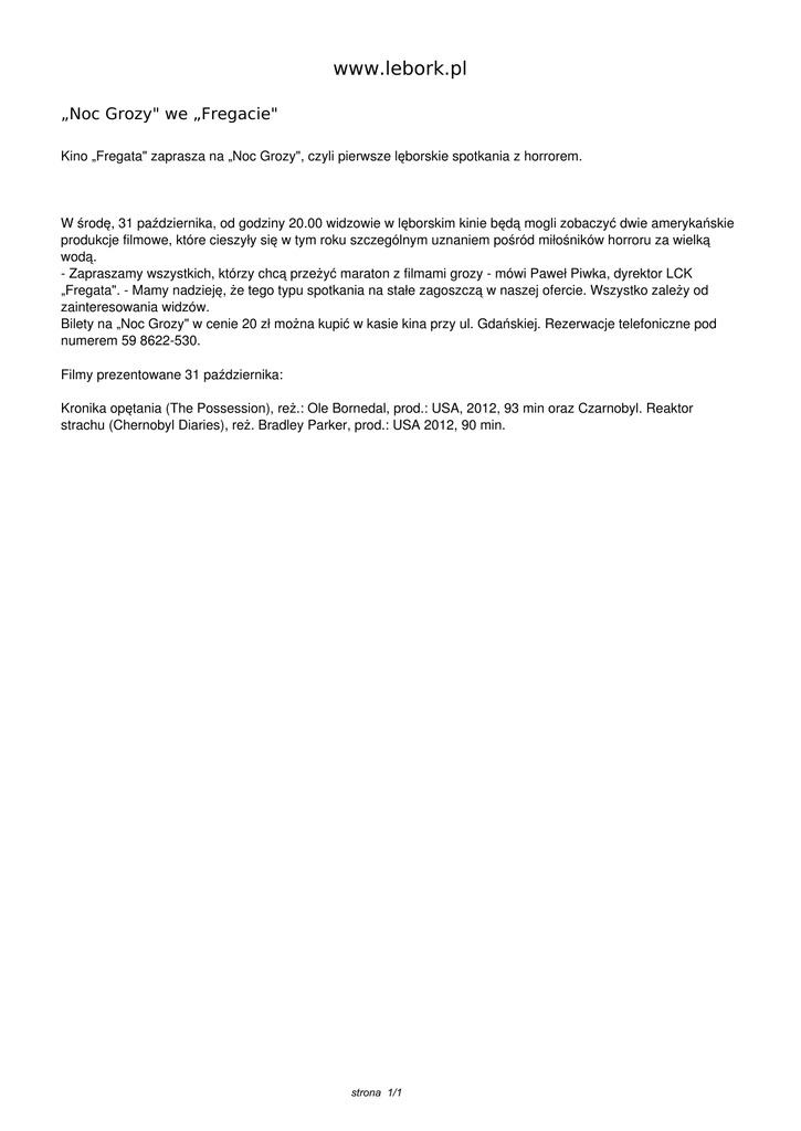 www.lebork.pl „Noc Grozy" we „Fregacie" Kino „Fregata" zaprasza na „Noc Grozy", czyli pierwsze lęborskie spotkania z horrorem. W środę, 31 października, od godziny 20.00 widzowie w lęborskim kinie będą mogli zobaczyć dwie amerykańskie produkcje filmowe, które cieszyły się w tym roku szczególnym uznaniem pośród miłośników horroru za wielką wodą. - Zapraszamy wszystkich, którzy chcą przeżyć maraton z filmami grozy - mówi Paweł Piwka, dyrektor LCK „Fregata". - Mamy nadzieję, że tego typu spotkania na stałe zagoszczą w naszej ofercie. Wszystko zależy od zainteresowania widzów. Bilety na „Noc Grozy" w cenie 20 zł można kupić w kasie kina przy ul. Gdańskiej. Rezerwacje telefoniczne pod numerem 59 8622-530. Filmy prezentowane 31 października: Kronika opętania (The Possession), reż.: Ole Bornedal, prod.: USA, 2012, 93 min oraz Czarnobyl. Reaktor strachu (Chernobyl Diaries), reż. Bradley Parker, prod.: USA 2012, 90 min. strona 1/1 Powered by TCPDF (www.tcpdf.org)