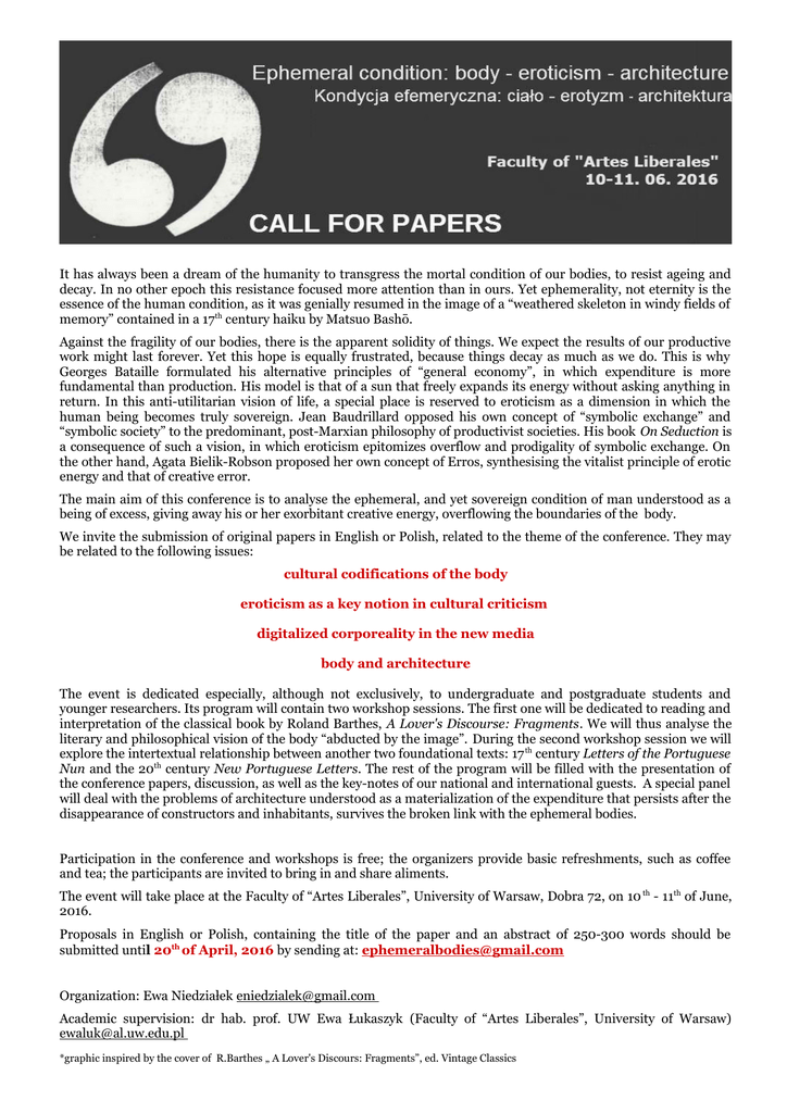 It has always been a dream of the humanity to transgress the mortal condition of our bodies, to resist ageing and decay. In no other epoch this resistance focused more attention than in ours. Yet ephemerality, not eternity is the essence of the human condition, as it was genially resumed in the image of a “weathered skeleton in windy fields of memory” contained in a 17th century haiku by Matsuo Bashō. Against the fragility of our bodies, there is the apparent solidity of things. We expect the results of our productive work might last forever. Yet this hope is equally frustrated, because things decay as much as we do. This is why Georges Bataille formulated his alternative principles of “general economy”, in which expenditure is more fundamental than production. His model is that of a sun that freely expands its energy without asking anything in return. In this anti-utilitarian vision of life, a special place is reserved to eroticism as a dimension in which the human being becomes truly sovereign. Jean Baudrillard opposed his own concept of “symbolic exchange” and “symbolic society” to the predominant, post-Marxian philosophy of productivist societies. His book On Seduction is a consequence of such a vision, in which eroticism epitomizes overflow and prodigality of symbolic exchange. On the other hand, Agata Bielik-Robson proposed her own concept of Erros, synthesising the vitalist principle of erotic energy and that of creative error. The main aim of this conference is to analyse the ephemeral, and yet sovereign condition of man understood as a being of excess, giving away his or her exorbitant creative energy, overflowing the boundaries of the body. We invite the submission of original papers in English or Polish, related to the theme of the conference. They may be related to the following issues: cultural codifications of the body eroticism as a key notion in cultural criticism digitalized corporeality in the new media body and architecture The event is dedicated especially, although not exclusively, to undergraduate and postgraduate students and younger researchers. Its program will contain two workshop sessions. The first one will be dedicated to reading and interpretation of the classical book by Roland Barthes, A Lover's Discourse: Fragments. We will thus analyse the literary and philosophical vision of the body “abducted by the image”. During the second workshop session we will explore the intertextual relationship between another two foundational texts: 17 th century Letters of the Portuguese Nun and the 20th century New Portuguese Letters. The rest of the program will be filled with the presentation of the conference papers, discussion, as well as the key-notes of our national and international guests. A special panel will deal with the problems of architecture understood as a materialization of the expenditure that persists after the disappearance of constructors and inhabitants, survives the broken link with the ephemeral bodies. Participation in the conference and workshops is free; the organizers provide basic refreshments, such as coffee and tea; the participants are invited to bring in and share aliments. The event will take place at the Faculty of “Artes Liberales”, University of Warsaw, Dobra 72, on 10 th - 11th of June, 2016. Proposals in English or Polish, containing the title of the paper and an abstract of 250-300 words should be submitted until 20th of April, 2016 by sending at: [email protected] Organization: Ewa Niedziałek [email protected] Academic supervision: dr hab. prof. UW Ewa Łukaszyk (Faculty of “Artes Liberales”, University of Warsaw) [email protected] *graphic inspired by the cover of R.Barthes „ A Lover's Discours: Fragments”, ed. Vintage Classics *** Snem ludzkości zawsze było przekroczenie śmiertelnej kondycji ciała, oparcie się starzeniu i rozpadowi. W żadnej innej epoce ta tęsknota nie skupiała na sobie więcej uwagi niż w naszej. A jednak to efemeryczność, a nie wieczność jest esencją kondycji ludzkiej, jak to zostało genialnie uchwycone w XVII-wiecznym haiku, gdzie Matsuo Bashō mówi o „wystawionym na niepogodę szkielecie na wietrznych polach pamięci”. Kruchości naszych ciał przeciwstawiamy pozorną solidność rzeczy. Spodziewamy się, że rezultaty naszej produktywnej pracy będą trwały zawsze. A jednak i ta nadzieja jest złudna, rzeczy podlegają rozpadowi tak samo jak my sami. Dlatego też Georges Bataille sformułował alternatywne zasady „ekonomii ogólnej”, w której wydatkowanie jest bardziej podstawowe od wytwarzania. Przyjętym przez niego modelem jest słońce, wydatkujące energię w sposób darmowy, bez żądania czegokolwiek w zamian. Ta antyutylitarna wizja życia przewiduje specjalne miejsce dla erotyzmu jako wymiaru, w którym jednostka ludzka staje się prawdziwie suwerenna. Z kolei Jean Baudrillard przeciwstawił swoją koncepcję „wymiany symbolicznej” i „społeczeństwa symbolicznego” dominującej, post-Marksowskiej filozofii społeczeństw produktywistycznych. Jego książka O uwodzeniu jest konsekwencją tej wizji, w której erotyzm ucieleśnia nadmiarowość i rozrzutność jako zasady wymiany symbolicznej. Natomiast Agata Bielik-Robson zaproponowała swoją własną koncepcję Errosa, dokonując syntezy witalistycznej zasady energii erotycznej i twórczego błędu. Głównym celem tej konferencji jest analiza wymiarów efemeryczności, a zarazem suwerenności człowieka, rozumianego jako byt ekscesywny, wypromieniowujący gigantyczną energię, nadmiarową w stosunku do ograniczeń ciała. Zachęcamy do zgłaszania propozycji referatów w języku angielskim lub polskim, powiązanych z tematyką sesji. Mogą one dotyczyć m.in. następujących kwestii: kulturowe kodyfikacje ciała erotyzm jako pojęcie klucz w krytyce kultury cielesność zdigitalizowana w nowych mediach ciało i architektura Wydarzenie jest przeznaczone głównie, choć nie wyłączn