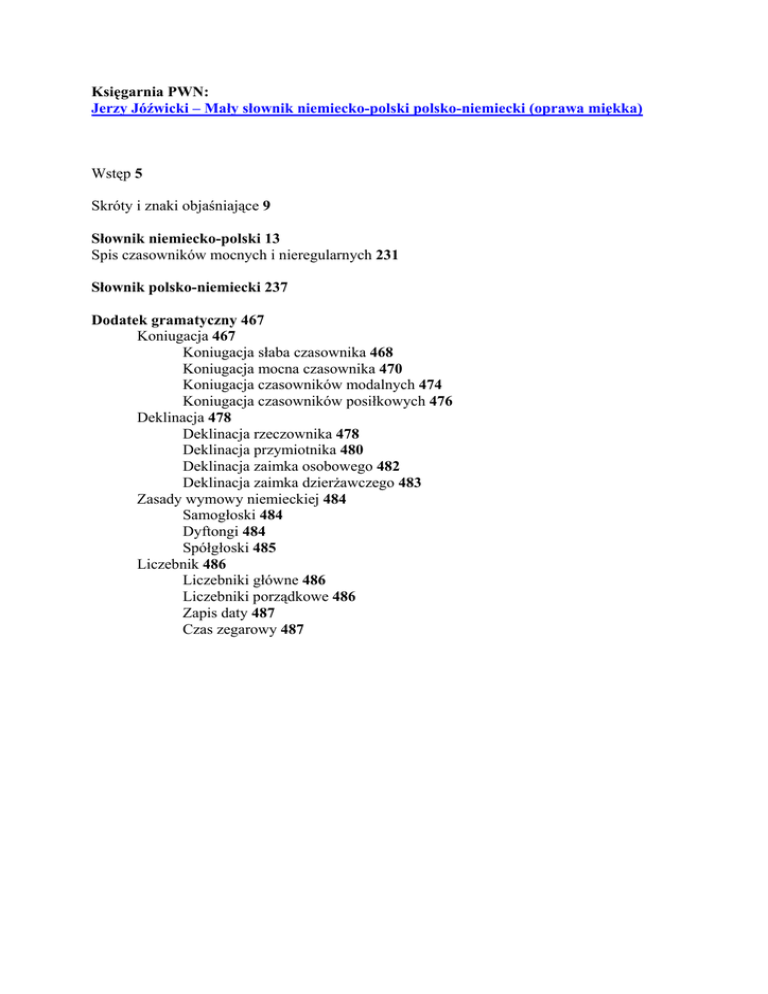 Księgarnia PWN: Jerzy Jóźwicki – Mały słownik niemiecko-polski polsko-niemiecki (oprawa miękka) Wstęp 5 Skróty i znaki objaśniające 9 Słownik niemiecko-polski 13 Spis czasowników mocnych i nieregularnych 231 Słownik polsko-niemiecki 237 Dodatek gramatyczny 467 Koniugacja 467 Koniugacja słaba czasownika 468 Koniugacja mocna czasownika 470 Koniugacja czasowników modalnych 474 Koniugacja czasowników posiłkowych 476 Deklinacja 478 Deklinacja rzeczownika 478 Deklinacja przymiotnika 480 Deklinacja zaimka osobowego 482 Deklinacja zaimka dzierżawczego 483 Zasady wymowy niemieckiej 484 Samogłoski 484 Dyftongi 484 Spółgłoski 485 Liczebnik 486 Liczebniki główne 486 Liczebniki porządkowe 486 Zapis daty 487 Czas zegarowy 487