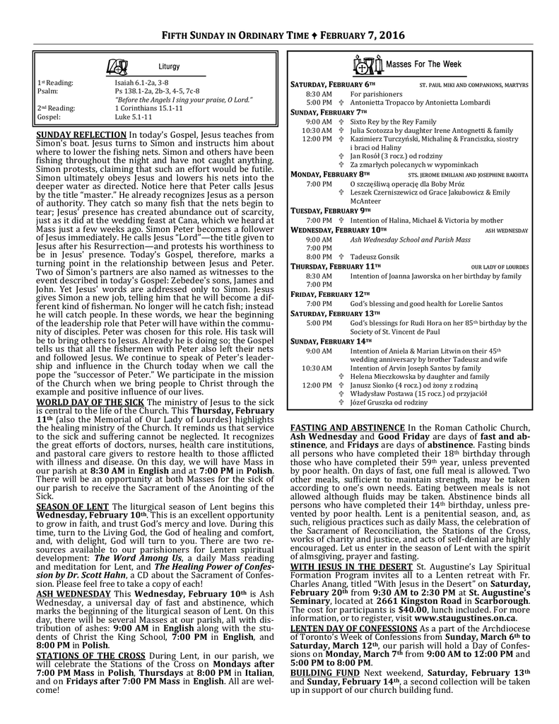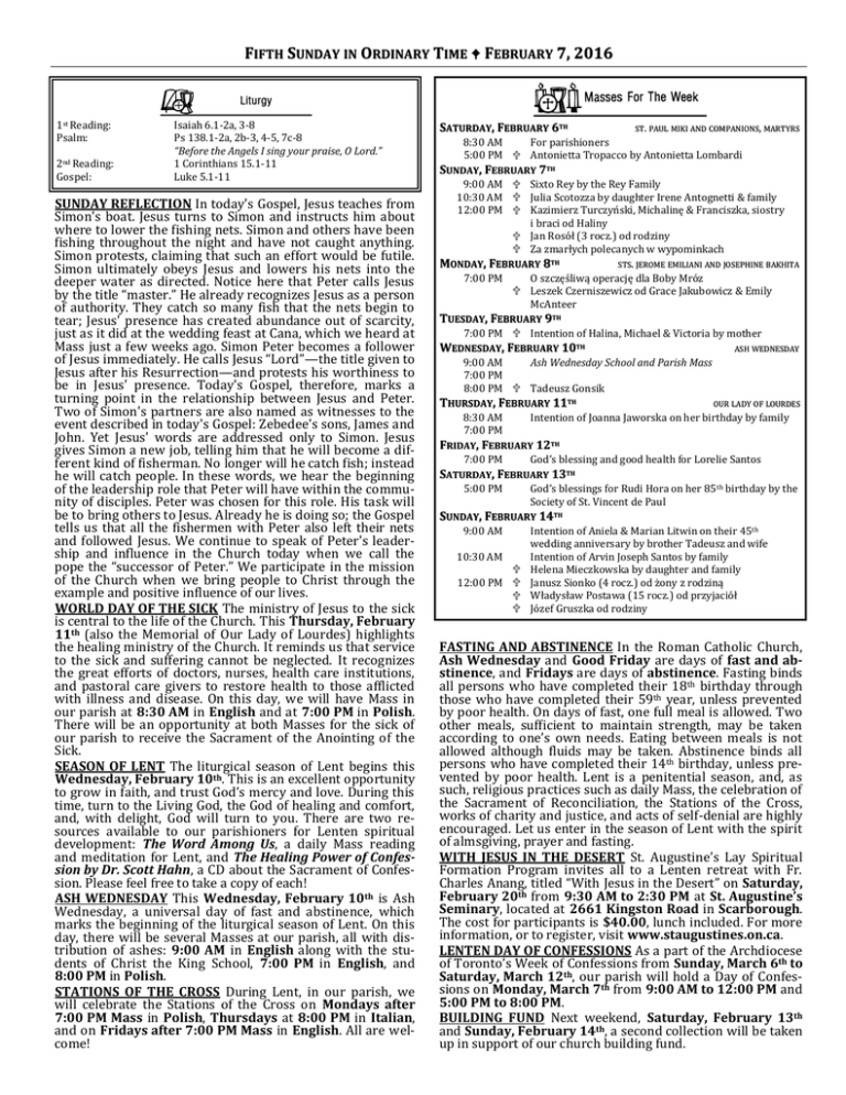 FIFTH SUNDAY IN ORDINARY TIME FEBRUARY 7, 2016 1st Reading: Psalm: 2nd Reading: Gospel: Isaiah 6.1-2a, 3-8 Ps 138.1-2a, 2b-3, 4-5, 7c-8 “Before the Angels I sing your praise, O Lord.” 1 Corinthians 15.1-11 Luke 5.1-11 SUNDAY REFLECTION In today's Gospel, Jesus teaches from Simon's boat. Jesus turns to Simon and instructs him about where to lower the fishing nets. Simon and others have been fishing throughout the night and have not caught anything. Simon protests, claiming that such an effort would be futile. Simon ultimately obeys Jesus and lowers his nets into the deeper water as directed. Notice here that Peter calls Jesus by the title “master.” He already recognizes Jesus as a person of authority. They catch so many fish that the nets begin to tear; Jesus' presence has created abundance out of scarcity, just as it did at the wedding feast at Cana, which we heard at Mass just a few weeks ago. Simon Peter becomes a follower of Jesus immediately. He calls Jesus “Lord”—the title given to Jesus after his Resurrection—and protests his worthiness to be in Jesus' presence. Today's Gospel, therefore, marks a turning point in the relationship between Jesus and Peter. Two of Simon's partners are also named as witnesses to the event described in today's Gospel: Zebedee's sons, James and John. Yet Jesus' words are addressed only to Simon. Jesus gives Simon a new job, telling him that he will become a different kind of fisherman. No longer will he catch fish; instead he will catch people. In these words, we hear the beginning of the leadership role that Peter will have within the community of disciples. Peter was chosen for this role. His task will be to bring others to Jesus. Already he is doing so; the Gospel tells us that all the fishermen with Peter also left their nets and followed Jesus. We continue to speak of Peter's leadership and influence in the Church today when we call the pope the “successor of Peter.” We participate in the mission of the Church when we bring people to Christ through the example and positive influence of our lives. WORLD DAY OF THE SICK The ministry of Jesus to the sick is central to the life of the Church. This Thursday, February 11th (also the Memorial of Our Lady of Lourdes) highlights the healing ministry of the Church. It reminds us that service to the sick and suffering cannot be neglected. It recognizes the great efforts of doctors, nurses, health care institutions, and pastoral care givers to restore health to those afflicted with illness and disease. On this day, we will have Mass in our parish at 8:30 AM in English and at 7:00 PM in Polish. There will be an opportunity at both Masses for the sick of our parish to receive the Sacrament of the Anointing of the Sick. SEASON OF LENT The liturgical season of Lent begins this Wednesday, February 10th. This is an excellent opportunity to grow in faith, and trust God’s mercy and love. During this time, turn to the Living God, the God of healing and comfort, and, with delight, God will turn to you. There are two resources available to our parishioners for Lenten spiritual development: The Word Among Us, a daily Mass reading and meditation for Lent, and The Healing Power of Confession by Dr. Scott Hahn, a CD about the Sacrament of Confession. Please feel free to take a copy of each! ASH WEDNESDAY This Wednesday, February 10th is Ash Wednesday, a universal day of fast and abstinence, which marks the beginning of the liturgical season of Lent. On this day, there will be several Masses at our parish, all with distribution of ashes: 9:00 AM in English along with the students of Christ the King School, 7:00 PM in English, and 8:00 PM in Polish. STATIONS OF THE CROSS During Lent, in our parish, we will celebrate the Stations of the Cross on Mondays after 7:00 PM Mass in Polish, Thursdays at 8:00 PM in Italian, and on Fridays after 7:00 PM Mass in English. All are welcome! TH SATURDAY, FEBRUARY 6TH ST. PAUL MIKI AND COMPANIONS, MARTYRS 8:30 AM For parishioners 5:00 PM Antonietta Tropacco by Antonietta Lombardi TH SUNDAY, FEBRUARY 7TH 9:00 AM Sixto Rey by the Rey Family 10:30 AM Julia Scotozza by daughter Irene Antognetti & family 12:00 PM Kazimierz Turczyński, Michalinę & Franciszka, siostry i braci od Haliny Jan Rosół (3 rocz.) od rodziny Za zmarłych polecanych w wypominkach TH MONDAY, FEBRUARY 8TH 7:00 PM STS. JEROME EMILIANI AND JOSEPHINE BAKHITA O szczęśliwą operację dla Boby Mróz Leszek Czerniszewicz od Grace Jakubowicz & Emily McAnteer TH TUESDAY, FEBRUARY 9TH 7:00 PM Intention of Halina, Michael & Victoria by mother TH WEDNESDAY, FEBRUARY 10TH ASH WEDNESDAY 9:00 AM Ash Wednesday School and Parish Mass 7:00 PM 8:00 PM Tadeusz Gonsik TH THURSDAY, FEBRUARY 11TH 8:30 AM 7:00 PM OUR LADY OF LOURDES Intention of Joanna Jaworska on her birthday by family TH FRIDAY, FEBRUARY 12TH 7:00 PM God’s blessing and good health for Lorelie Santos TH SATURDAY, FEBRUARY 13TH 5:00 PM God’s blessings for Rudi Hora on her 85th birthday by the Society of St. Vincent de Paul TH SUNDAY, FEBRUARY 14TH 9:00 AM 10:30 AM 12:00 PM Intention of Aniela & Marian Litwin on their 45th wedding anniversary by brother Tadeusz and wife Intention of Arvin Joseph Santos by family Helena Mieczkowska by daughter and family Janusz Sionko (4 rocz.) od żony z rodziną Władysław Postawa (15 rocz.) od przyjaciół Józef Gruszka od rodziny FASTING AND ABSTINENCE In the Roman Catholic Church, Ash Wednesday and Good Friday are days of fast and abstinence, and Fridays are days of abstinence. Fasting binds all persons who have completed their 18th birthday through those who have completed their 59th year, unless prevented by poor health. On days of fast, one full meal is allowed. Two other meals, sufficient to maintain strength, may be taken according to one’s own needs. Eating between meals is not allowed although fluids may be taken. Abstinence binds all persons who have completed their 14th birthday, unless prevented by poor h