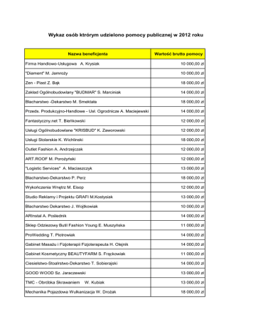 Wykaz osób ktrórym udzielono pomocy publicznej w 2012 roku Nazwa beneficjenta Wartość brutto pomocy Firma Handlowo-Usługowa A. Krysiak 10 000,00 zł "Diament" M. Jamroży 10 000,00 zł Zen - Piast Z. Bąk 18 000,00 zł Zakład Ogólnobudowlany "BUDMAR" S. Marciniak 14 000,00 zł Blacharstwo -Dekarstwo M. Smektała 18 000,00 zł Przeds. Produkcyjno-Handlowe - Usł. Ogrodnicze A. Maciejewski 14 000,00 zł Fantastyczny.net T. Bieńkowski 12 000,00 zł Usługi Ogólnobudowlane "KRISBUD" K. Zaworowski 12 000,00 zł Usługi Stolarskie K. Wichlinski 18 000,00 zł Outlet Fashion A. Andrzejczak 12 000,00 zł ART.ROOF M. Porożyński 12 000,00 zł "Logistic Services" A. Maciaszczyk 13 000,00 zł Blacharstwo-Dekarstwo P. Perz 18 000,00 zł Wykończenia Wnętrz M. Eisop 12 000,00 zł Studio Reklamy i Projektu GRAFI M.Kostysiak 13 000,00 zł Blacharstwo Dekarstwo J. Wojtkowiak 10 000,00 zł ARInstal A. Poślednik 14 000,00 zł Sklep Odziezowy Butil Fashion Young E. Muszyńska 11 000,00 zł ProWedding T. Piotrowiak 14 000,00 zł Gabinet Masażu i Fizjoterapii Fizjoterapeuta H. Olejnik 14 000,00 zł Gabinet Kosmetyczny BEAUTYFARM S. Frąckowiak 11 000,00 zł Ciesielstwo-Stoalrstwo-Dekarstwo T. Sobierajski 14 000,00 zł GOOD WOOD Sz. Jaraczewski 13 000,00 zł TMC - Obróbka Skrawaniem 13 000,00 zł W. Kubiak Mechanika Pojazdowa Wulkanizacja W. Drożak 18 000,00 zł AUTO MYJNIA "ADAMOS" D. Wróbel 14 000,00 zł Produkcyjno-Usługowy Zakład Stolarski M. Rosa 14 000,00 zł PHU "Ogrody" K. Matuszewski 14 000,00 zł IT SERVICE G. Kaczmarek 13 000,00 zł Fotografia M. Kapała 11 000,00 zł Salon Kosmetyczny "MIRABELLA" M. Lekowska 12 000,00 zł Mechanika Pojazdowa "RADI" 14 000,00 zł R. Dyba Usługi Budowlane D. Giera 12 000,00 zł Sklep Spozywczo-Przemysłowy "POLKA" M. Śniegocka 10 000,00 zł GeoSystem Usługi Geodezyjne i Kartograficzne K. Wątor 12 000,00 zł Kamieniarstwo Artystyczne P. Ławecki 8 000,00 zł ART INTERIO K. Szumińska 14 000,00 zł GASTROMAR M. Jędrkowiak 12 000,00 zł "GABI" Gabinet Pielęgnacji Urody A. Konieczna 10 000,00 zł Dam - Bud D. Ratajczak 12 000,00 zł "smart-NT" M . Święcicki 13 000,00 zł Bar Mleczny I Kropka A. Cieślarczyk 12 000,00 zł "TAUBEN" M. Obroślak 13 000,00 zł Przedsiębiorstwo Handlowo-Usługowe FILAR M. Michalak 12 000,00 zł Gabinet Masażu J. Kowalska 12 000,00 zł Professional Cleaning R. Andrzejewski 10 000,00 zł Auto Wit W. Gorynia 12 000,00 zł "ONYKS" A. Płaczek 10 000,00 zł "ANIMA" J. Kowalska 14 000,00 zł 2GetThere I. Ratajczyk 10 609,81 zł Gabinet Kosmetyczny METAMORFOZA KUŹNIA URODY K. Bogusz-Knapp 10 000,00 zł T.M.S TECH MAL A. Grabowski 14 000,00 zł Vitamina Agencja Reklamowa M. Teodorczyk 12 000,00 zł WAL-BUD Ł. Walczak 12 000,00 zł PHU Mechanika Pojazdowa A. Grabarek 12 000,00 zł MABU DESIGN Studio M. Buliński 14 000,00 zł Ślusarstwo Spawalnictwo Sz. Ratajczak 13 000,00 zł HOME INVEST B. Zieliński 14 000,00 zł Blacharstwo Samochodowe Cz. Frąckowiak 14 000,00 zł Second Hand "KupCiuszek" K. Piórek 12 000,00 zł PPH AKART A. Kasperkowiak 13 000,00 zł ROX-CAR R. Rolnik 14 000,00 zł ForVet Sz. Fornalik 13 000,00 zł Akademia Umiejętności J. Andrzejewski 16 000,00 zł Blacharstwo samochodowe i mechanika pojazdowa T. Broszko 13 000,00 zł ITE BIT W. Marciniak 14 000,00 zł Usługi Malarsko-Tapeciarskie T. Ślęzak 12 000,00 zł ArtDecor R. Nowak 12 450,00 zł EKO-AGRO M.Kaczmarek 12 000,00 zł NOVAVET Działalność Weterynaryjna M. Klonowska 16 000,00 zł Atman Creatio Ł. Grzelak 16 000,00 zł MPM-tech M. Janus 13 500,00 zł Auto Naprawa M. Sikora 13 500,00 zł B.R.T. W. Ratajczak 18 000,00 zł Firma Usługowo-Remontowa L. Kołak 12 000,00 zł Mechanika Pojazdowa A. Moderski 14 000,00 zł Pure Line A. Kaniewski 14 000,00 zł Przem-Bruk Usługi Remontowo-Budowlane P. Jędryczka 12 000,00 zł "BAS-Pol" Sprzedaż drzewek owocowych, nasion i warzyw Stróżyk B. 10 350,00 zł Przedsiębiorstwo Handlowo-Usługowe "iGo" P. Długi 14 000,00 zł Firma Handlowa GASPAR P. Dominiak 12 000,00 zł SP-STACH M. Staszewski 16 000,00 zł SZLIF-ED M. Ciesielski 18 000,00 zł Vkaa Sound K. Kaźmierczak 12 000,00 zł Firma Ogólnobudowlana P. Matyla 14 000,00 zł Spółdzielnia Socjalna ARKA 14 000,00 zł Spółdzielnia Socjalna ARKA 14 000,00 zł SPA DLA PSA N. Wojtkowiak 14 000,00 zł Usługi Krawieckie E. Maćkowiak 16 000,00 zł "PLANDEMIX" T. Bartków 16 000,00 zł Blacharstwo Pojazdowe M. Busz 12 000,00 zł Diagnostyka Pojazdów samochodowych T. Gendera 14 000,00 zł Salon Fryzjerski "YOANA" J. Kubiak 14 000,00 zł Sklep Odziezowy M. Gerlach 14 000,00 zł Usługi Dietetyczne MIKO S. Mikołajska 18 000,00 zł PHU HUSARINSTAL M. Baranek 14 000,00 zł AUTO Serwis Opony Felgi D. Gubański 18 000,00 zł CzekoStudio A. Adamska 14 000,00 zł Sklep Wielobranżowy L. Jankowiak 12 000,00 zł Firma Handlowo-Usługowa "OSMOTIC" M. Chuda 10 000,00 zł Usługi Stolarskie, Ciesielskie, Dekarskie 14 000,00 zł W. Smektała ADA - ROL A.Adamek 18 000,00 zł "BARTASMAL" B. Majnert 12 000,00 zł P.H.U. Przedsiębiorstwo Handlowo-Usługowe AFIS F. Radwan 16 000,00 zł Renowacja i kosmetyka pojazdowa A. Busz 13 000,00 zł "Ann Decor" A. Łapawa 12 000,00 zł Fryzjerstwo objazdowe "Wizaż" K. Kosowicz 10 000,00 zł Firma Usługowa K. Chlebowska 12 000,00 zł Europejska Agencja Reklamowa "ANGEL" Skrzypczak A. Czapla- 14 000,00 zł Usługi ogólnobudowlane M. Grodzki 14 000,00 zł Zakład ogólnobudowlany M. Sieński 14 000,00 zł Usługi tapicerskie, szewskie, kaletnicze P. Mikołajczak 14 000,00 zł MATRONIC M. Majusiak 12 000,00 zł Mechanika Pojazdowa R. Biderman 14 000,00 zł Firma Usługowa 12 000,00 zł Sz. Rajewski "STRECZ-PAK" E. Zgoła 16 000,00 zł Hurt Detal W. Pazoła 14 000,00 zł Zakład Instalacyjny wod-kan.co, gaz P. Sarbinowski 14 000,00 zł Zakład ogólnobudowlany E. Kuropka 14 000,00 zł Bud-Malex Firma Ogólnobudowlana E. Wujczak 14 000,00 zł Usługi Ogólnobudowlane A. Łukowski 14 000,00 zł Zakład Fryzjerski "HANIA" H. Podkow