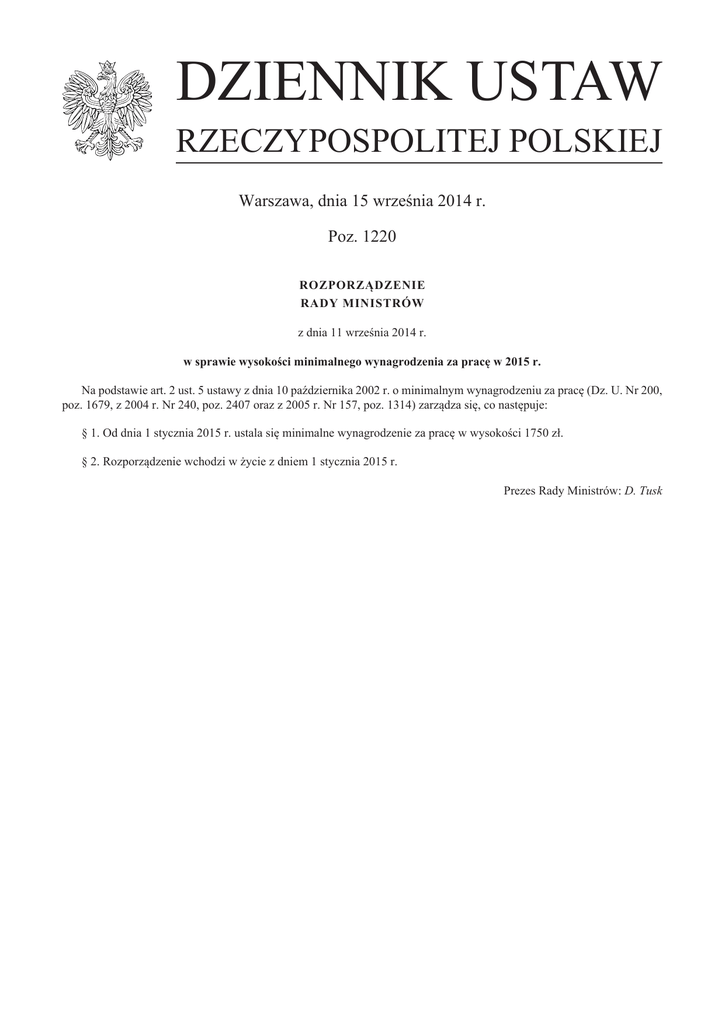 DZIENNIK USTAW RZECZYPOSPOLITEJ POLSKIEJ Warszawa, dnia 15 września 2014 r. Poz. 1220 rozporządzenie rady ministrów z dnia 11 września 2014 r. w sprawie wysokości minimalnego wynagrodzenia za pracę w 2015 r. Na podstawie art. 2 ust. 5 ustawy z dnia 10 października 2002 r. o minimalnym wynagrodzeniu za pracę (Dz. U. Nr 200, poz. 1679, z 2004 r. Nr 240, poz. 2407 oraz z 2005 r. Nr 157, poz. 1314) zarządza się, co następuje: § 1. Od dnia 1 stycznia 2015 r. ustala się minimalne wynagrodzenie za pracę w wysokości 1750 zł. § 2. Rozporządzenie wchodzi w życie z dniem 1 stycznia 2015 r. Prezes Rady Ministrów: D. Tusk