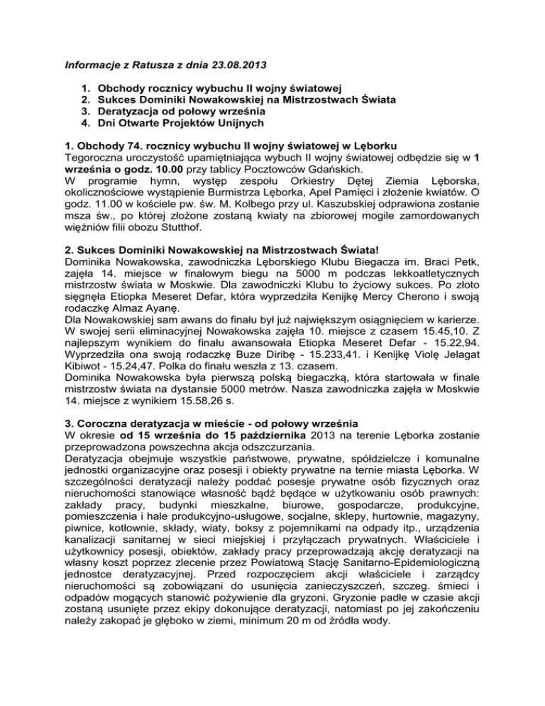 Informacje z Ratusza z dnia 23.08.2013 1. 2. 3. 4. Obchody rocznicy wybuchu II wojny światowej Sukces Dominiki Nowakowskiej na Mistrzostwach Świata Deratyzacja od połowy września Dni Otwarte Projektów Unijnych 1. Obchody 74. rocznicy wybuchu II wojny światowej w Lęborku Tegoroczna uroczystość upamiętniająca wybuch II wojny światowej odbędzie się w 1 września o godz. 10.00 przy tablicy Pocztowców Gdańskich. W programie hymn, występ zespołu Orkiestry Dętej Ziemia Lęborska, okolicznościowe wystąpienie Burmistrza Lęborka, Apel Pamięci i złożenie kwiatów. O godz. 11.00 w kościele pw. św. M. Kolbego przy ul. Kaszubskiej odprawiona zostanie msza św., po której złożone zostaną kwiaty na zbiorowej mogile zamordowanych więźniów filii obozu Stutthof. 2. Sukces Dominiki Nowakowskiej na Mistrzostwach Świata! Dominika Nowakowska, zawodniczka Lęborskiego Klubu Biegacza im. Braci Petk, zajęła 14. miejsce w finałowym biegu na 5000 m podczas lekkoatletycznych mistrzostw świata w Moskwie. Dla zawodniczki Klubu to życiowy sukces. Po złoto sięgnęła Etiopka Meseret Defar, która wyprzedziła Kenijkę Mercy Cherono i swoją rodaczkę Almaz Ayanę. Dla Nowakowskiej sam awans do finału był już największym osiągnięciem w karierze. W swojej serii eliminacyjnej Nowakowska zajęła 10. miejsce z czasem 15.45,10. Z najlepszym wynikiem do finału awansowała Etiopka Meseret Defar - 15.22,94. Wyprzedziła ona swoją rodaczkę Buze Diribę - 15.233,41. i Kenijkę Violę Jelagat Kibiwot - 15.24,47. Polka do finału weszła z 13. czasem. Dominika Nowakowska była pierwszą polską biegaczką, która startowała w finale mistrzostw świata na dystansie 5000 metrów. Nasza zawodniczka zajęła w Moskwie 14. miejsce z wynikiem 15.58,26 s. 3. Coroczna deratyzacja w mieście - od połowy września W okresie od 15 września do 15 października 2013 na terenie Lęborka zostanie przeprowadzona powszechna akcja odszczurzania. Deratyzacja obejmuje wszystkie państwowe, prywatne, spółdzielcze i komunalne jednostki organizacyjne oraz posesji i obiekty prywatne na ternie miasta Lęborka. W szczególności deratyzacji należy poddać posesje prywatne osób fizycznych oraz nieruchomości stanowiące własność bądź będące w użytkowaniu osób prawnych: zakłady pracy, budynki mieszkalne, biurowe, gospodarcze, produkcyjne, pomieszczenia i hale produkcyjno-usługowe, socjalne, sklepy, hurtownie, magazyny, piwnice, kotłownie, składy, wiaty, boksy z pojemnikami na odpady itp., urządzenia kanalizacji sanitarnej w sieci miejskiej i przyłączach prywatnych. Właściciele i użytkownicy posesji, obiektów, zakłady pracy przeprowadzają akcję deratyzacji na własny koszt poprzez zlecenie przez Powiatową Stację Sanitarno-Epidemiologiczną jednostce deratyzacyjnej. Przed rozpoczęciem akcji właściciele i zarządcy nieruchomości są zobowiązani do usunięcia zanieczyszczeń, szczeg. śmieci i odpadów mogących stanowić pożywienie dla gryzoni. Gryzonie padłe w czasie akcji zostaną usunięte przez ekipy dokonujące deratyzacji, natomiast po jej zakończeniu należy zakopać je głęboko w ziemi, minimum 20 m od źródła wody. Nadzór nad akcją sprawuje Straż Miejska i PSS-E w Lęborku. Informacja o akcji deratyzacji zostanie upowszechniona w prasie lokalnej (ogłoszenia) oraz poprzez plakaty wywieszane w miejscach publicznych na terenie Lęborka. (więcej nt. akcji – Wydz. Ochrony Środowiska UM). 4. Dni Otwarte Projektów Unijnych W dniach 7-15 września br. na terenie województwa pomorskiego odbędą się „Dni Otwarte Projektów Unijnych” – największy w województwie cykl imprez promujących projekty unijne realizowane na terenie Pomorza. W tych dniach na terenie woj. pomorskiego odbędzie się ponad 150 imprez, które promować będą blisko 100 projektów realizowanych w województwie pomorskim. Wśród zaplanowanych atrakcji są m.in. festyny, koncerty, seanse filmowe, zawody sportowe, regaty, zwiedzanie projektów, wystawy, konkursy i zabawy dla dzieci, gry, spektakle teatralne i wiele innych. Jest to wyjątkowa okazja, by zobaczyć, jakie inwestycje udało się z powodzeniem zrealizować w naszym regionie. W ramach Dni Otwartych Projektów Unijnych w Lęborku będzie można zapoznać się z efektami trzech spośród prowadzonych w ostatnim okresie projektów unijnych: „Baltic Rally - bałtyckie mistrzostwa amatorów w grach zespołowych, Program Południowy Bałtyk”, RECReate - rewitalizacja europejskiego szlaku kulturowego na obszarze Południowego Bałtyku - Pomorska Droga św. Jakuba, Rewitalizacja Centrum Lęborka. 7 i 8 września odbędzie się turniej finałowy o Puchar Południowego Bałtyku w piłce siatkowej zorganizowany w ramach projektu pn. „Baltic Rally - bałtyckie mistrzostwa amatorów w grach zespołowych, Program Południowy Bałtyk”. W turnieju finałowym udział wezmą wszystkie drużyny, które wygrały turnieje kwalifikacyjne. Zespoły z Polski, Niemiec i Litwy będą rywalizować o puchar Południowego Bałtyku i miano najlepszej amatorskiej drużyny. Rozgrywki będą trwać dwa dni, początek w sobotę o godzinie 10.00. Podczas trwania turnieju finałowego odbędzie się również amatorski turniej siatkówki kobiet oraz turniej piłki nożnej jako imprezy towarzyszące. Zakończenie turnieju finałowego planowane jest w niedzielę na godzinę 15.00 i to wtedy poznamy amatorskiego siatkarskiego mistrza z rejonu Południowego Bałtyku. Podczas tych dwóch dni promowana będzie aktywność ruchowa w wolnym czasie wraz z promocją zdrowego tryby życia. Miejsce: Hala sportowa przy Gimnazjum nr 2 w Lęborku, ul. P. Skargi 52. Więcej o projekcie na: http://www.baltic-rally.eu/ oraz http://www.lebork.pl/ W ramach projektu RECReate - rewitalizacja europejskiego szlaku kulturowego na obszarze Południowego Bałtyku - Pomorska Droga św. Jakuba, Program Południowy Bałtyk – w dniu 7 września od godziny 11.30 - zwiedzanie Sankt