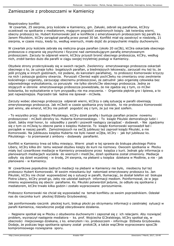 Płońszczak - Gazeta lokalna - Płońsk, Raciąż, Baboszewo, Czerwińsk, Dzierzążnia, Joniec, Naruszewo Zamieszanie z proboszczami w Kamienicy Niepotrzebny konflikt W czwartek, 25 sierpnia, przy kościele w Kamienicy, gm. Załuski, zebrali się parafianie, ktÃłrzy oczekiwali na spotkanie z mediatorem, mającym pogodzić zwaśnionych księży. Jak twierdzą wierni, obecny proboszcz ks. Hubert Komorowski jest w konflikcie z emerytowanym proboszczem tej parafii ks. Janem Pikulskim, ktÃłry zarządzał parafią przez ponad 30 lat. Konflikt miał się zaostrzyć w niedzielę, 21 sierpnia, w czasie mszy, kiedy to, według wiernych, miało dojść do przepychanki między duchownymi. W czwartek przy kościele zebrała się nieliczna grupa parafian (około 20 osÃłb), ktÃłra oskarżała obecnego proboszcza o znęcanie się psychiczne i fizyczne nad zamieszkującym parafię emerytowanym proboszczem. Zarzuty te odpierali wierni, ktÃłrzy przyszli bronić obecnego proboszcza, ktÃłry, według nich, zrobił bardzo dużo dla parafii w ciągu swojej trzyletniej posługi w Kamienicy. Obydwie strony przekrzykiwały się w swoich racjach. Zwolennicy emerytowanego proboszcza oskarżali obecnego o to, że uznaje tylko bogatszych parafian, a biedniejszych lekceważy, zarzucali mu też to, że jeśli przyjdą w innych godzinach, niż podane, do kancelarii parafialnej, to proboszcz Komorowski krzyczy na nich i pokazuje godziny otwarcia. Poruszali rÃłwnież wątki pochÃłwku na cmentarzu oraz zwolnienie kościelnego i organisty, zarzucając obecnemu proboszczowi, że zatrudnił jako organistę człowieka bez odpowiedniego wykształcenia, co poruszyło nie tylko obrońcÃłw obecnego proboszcza. Jedna ze stojących w obronie emerytowanego proboszcza powiedziała, że nie zgadza się z tym, co mÃłwi koleżanka, bo wykształcenie w tym przypadku nie ma znaczenia. - Organista pięknie gra i śpiewa, a to jest najważniejsze. Poprzedni tak ładnie nie śpiewał - mÃłwiła. Zarzuty wobec obecnego proboszcza odpierali wierni, ktÃłrzy o całą sytuację w parafii obwiniają emerytowanego proboszcza. Jak mÃłwili w czasie spotkania przy kościele, to nie proboszcz Komorowski jest winny, ale emeryt, ktÃłry nie potrafi pogodzić się z tym, że już nie jest szefem. - To wszystko przez księdza Pikulskiego, ktÃłry dzieli parafię i buntuje parafian przeciw nowemu proboszczowi - mÃłwili obrońcy ks. Huberta Komorowskiego. - To ksiądz Pikulski demoralizuje ludzi i dzieli. Jakby miał honor, to odszedłby z parafii i pozwolił następcy zarządzać - dodawali. - Nie zgadzamy się z tym co mÃłwią tu obecne panie o księdzu Hubercie. To ksiądz Komorowski wprowadził ład i porządek w naszej parafii. Zamożniejszych na swÃłj jubileusz też zaprosił ksiądz Pikulski, a nie Komorowski. Na jubileuszu księdza Huberta nie było nawet wÃłjta, ktÃłry - jak był jubileusz ks. Pikulskiego - to przemawiał z ambony - dodawały parafianki. Konflikt w Kamienicy trwa od kilku miesięcy. Wierni pisali w tej sprawie do biskupa płockiego Piotra Libery, ktÃłry kilka dni temu wezwał obydwu księży do kurii na rozmowy. Owocem spotkania w Płocku miały być czwartkowe mediacje w Kamienicy prowadzone przez księdza z kurii. Jednak gdy informacja o planowanych mediacjach wyciekła do wiernych i mediÃłw, dzień spotkania został zmieniony. Mediacje odbyły się dzień wcześniej - w środę, 24 sierpnia, na plebanii u księdza dziekana w Modlinie, a nie - jak planowano - w Kamienicy. W czwartkowe popołudnie żadnych mediacji na plebanii w Kamienicy nie było, nieobecny był też proboszcz Hubert Komorowski. W swoim mieszkaniu był natomiast emerytowany proboszcz ks. Jan Pikulski, ktÃłry nie chciał wypowiedzieć się o sytuacji w parafii, tłumacząc, że dostał telefon od biskupa Piotra Libery, ktÃłry prosił go, żeby nie udzielał żadnych informacji mediom. Poinformował, że w jego imieniu wypowiedzą się obecni parafianie. Ks. Pikulski potwierdził jedynie, że odbyło się spotkanie z mediatorem, ktÃłre trwało kilka godzin i zostało wypracowane porozumienie. Proboszcz Komorowski nie chciał się wypowiadać na temat konfliktu ze swoim poprzednikiem. Odesłał nas do rzecznika kurii płockiej Elżbiety Grzybowskiej. Jak poinformowała rzecznik płockiej kurii, biskup płocki po otrzymaniu informacji o zaistniałej sytuacji w parafii Kamienica, niezwłocznie podjął zdecydowane działania. - Najpierw spotkał się w Płocku z obydwoma duchownymi i zapoznał się z ich relacjami. Aby rozwiązać problem, wyznaczył następnie mediatora - ks. prof. Wojciecha GÃłralskiego, ktÃłry spotkał się, w obecności miejscowego dziekana, z ks. emerytem i ks. proboszczem - informuje Elżbieta Grzybowska. Dodaje, że podczas tego spotkania spisany został protokÃłł, a także wspÃłlnie wypracowano sposÃłb kompromisowego rozwiązania sporu. http://www.plonszczak.pl Kreator PDF Utworzono 7 March, 2017, 19:49 Płońszczak - Gazeta lokalna - Płońsk, Raciąż, Baboszewo, Czerwińsk, Dzierzążnia, Joniec, Naruszewo - Kuria diecezjalna na bieżąco monitoruje sytuację w parafii Kamienica. Mamy nadzieję, że wkrÃłtce ulegnie ona poprawie - napisała w mailu rzeczniczka kurii. Do sprawy będziemy wracać, bo za dwa miesiące mediator ponownie ma pojawić się w parafii, by sprawdzić, czy spisane w środę ustalenia zostały zrealizowane, a konflikt rozwiązany. Łukasz Wielechowski foto: Łukasz Wielechowski http://www.plonszczak.pl Kreator PDF Utworzono 7 March, 2017, 19:49