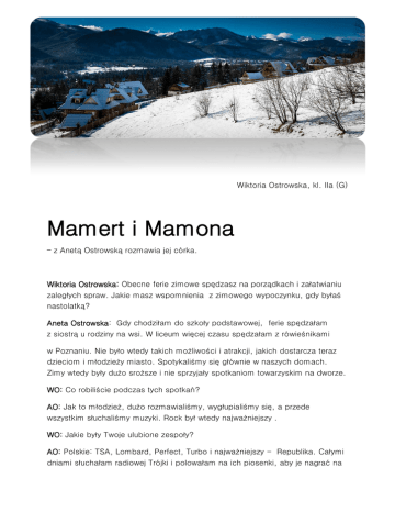 Wiktoria Ostrowska, kl. IIa (G) Mamert i Mamona – z Anetą Ostrowską rozmawia jej córka. Wiktoria Ostrowska: Obecne ferie zimowe spędzasz na porządkach i załatwianiu zaległych spraw. Jakie masz wspomnienia z zimowego wypoczynku, gdy byłaś nastolatką? Aneta Ostrowska: Gdy chodziłam do szkoły podstawowej, ferie spędzałam z siostrą u rodziny na wsi. W liceum więcej czasu spędzałam z rówieśnikami w Poznaniu. Nie było wtedy takich możliwości i atrakcji, jakich dostarcza teraz dzieciom i młodzieży miasto. Spotykaliśmy się głównie w naszych domach. Zimy wtedy były dużo sroższe i nie sprzyjały spotkaniom towarzyskim na dworze. WO: Co robiliście podczas tych spotkań? AO: Jak to młodzież, dużo rozmawialiśmy, wygłupialiśmy się, a przede wszystkim słuchaliśmy muzyki. Rock był wtedy najważniejszy . WO: Jakie były Twoje ulubione zespoły? AO: Polskie: TSA, Lombard, Perfect, Turbo i najważniejszy - Republika. Całymi dniami słuchałam radiowej Trójki i polowałam na ich piosenki, aby je nagrać na kasetowy magnetofon. To był wtedy jedyny sposób odtwarzania ulubionej muzyki. Często śmieję się w myślach, gdy przypomnę sobie, że Twój dziadek wchodził do mojego pokoju i wyłączał mi magnetofon Grundig, bo za głośno słuchałam i „nie mógł wytrzymać tych wrzasków”. Powinnaś docenić moją wytrzymałość psychiczną wobec Twojej muzyki. WO: Czasami każesz mi ściszyć! Miałaś swoich idoli? AO: Oczywiście. Różnych. W Twoim wieku był to Grzegorz Ciechowski. Całą ścianę miałam wytapetowaną jego plakatami. Podczas ferii zrobiłam też sobie na drutach sweter w barwach Republiki. WO: Czyli? AO: W biało – czarne pasy. WO: Z czym jeszcze kojarzą Ci się Twoje ferie zimowe? AO: Z biblioteką osiedlową dla dzieci i młodzieży. To było miejsce odwiedzane przeze mnie co najmniej raz w tygodniu i właściwie mogę stwierdzić, że zaczynając od lat najmłodszych, gdy czytała mi jeszcze mama, do wieku dorosłego, przeczytałam prawie wszystko, co biblioteka miała do zaoferowania. Książki po prostu pochłaniałam, bywało, że w nocy, z latarką pod kołdrą. WO: Twoi ulubieni bohaterowie to: AO: Ania Shirley, Tomek Wilmowski, Jan Skrzetuski, uwielbiałam też książki o Indianch, czyli o Winnetou z plemienia Apaczów i Chingachgooku i Unkasie – ostatnich Mohikanach. Najbliższą memu sercu była i nadal pozostała „Jeżycjada” Małgorzaty Musierowicz. Przygody rodziny Borejków i ich przyjaciół przeżywałam bardzo mocno. Do tej pory każda nowa powieść z tej serii jest dla mnie ucztą czytelniczą. WO: Trudno w domu tego nie zauważyć. Przy czytaniu ostatniej najpierw się ciągle na głos śmiałaś, a potem popłakałaś. Które części „Jeżycjady” najmilej wspominasz? AO: Pierwsze: „Szóstą klepkę”, „Kłamczuchę”, „Idę”, pierwszych sześć, może siedem. Ostatnia – „McDusia” też mi się bardzo podobała. WO: Z tego, co mi opowiedziałaś, Twoje ferie bywały mało zimowe. AO: I chwała im za to. Tak mi już zostało. Kocham słońce, lato. Wolę duże upały od mrozów. Zimę mogłabym przespać.