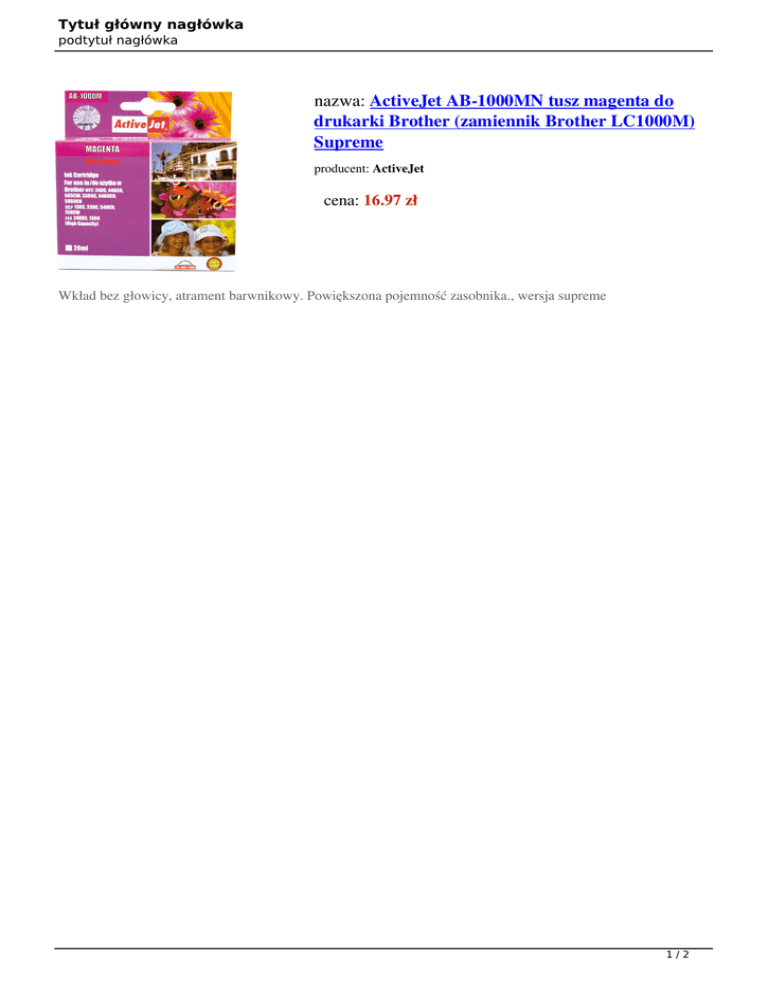 Tytuł główny nagłówka podtytuł nagłówka nazwa: ActiveJet AB-1000MN tusz magenta do drukarki Brother (zamiennik Brother LC1000M) Supreme producent: ActiveJet cena: 16.97 zł Wkład bez głowicy, atrament barwnikowy. Powiększona pojemność zasobnika., wersja supreme 1/2 Tytuł główny nagłówka podtytuł nagłówka Kod Producenta www Kolor Zastosowanie Pojemność Kod OEM Pasuje do drukarek: Opakowanie Wersja Technologia wytworzenia Zwiększona wydajność Atrament Hologram Grupa nazwa wartość AB-1000MN (AB-1000M) http://www.activejet.pl Magenta. Wydruki profesjonalne – zdjęcia, katalogi, prezentacje, oferty, dyplomy, zaproszenia, ulotki 35 ml LC1000M, LC970M DCP: 130C, 330C, 350C, 357C, 540CN, 560CN, 750 CW, 770CW. MFC: 240C, 260C, 440CN, 465CN, 660CN, 665CW, 845CW, 3360C, 5460CN, 5860CN. FAX: 1360, 1460, 1560, 2480C., DCP: 135C, 150C. MFC: 235C foliowane, odporne na UV Supreme 100% nowy XL Barwnik klasa A+ hologram serializowany Gold 2/2