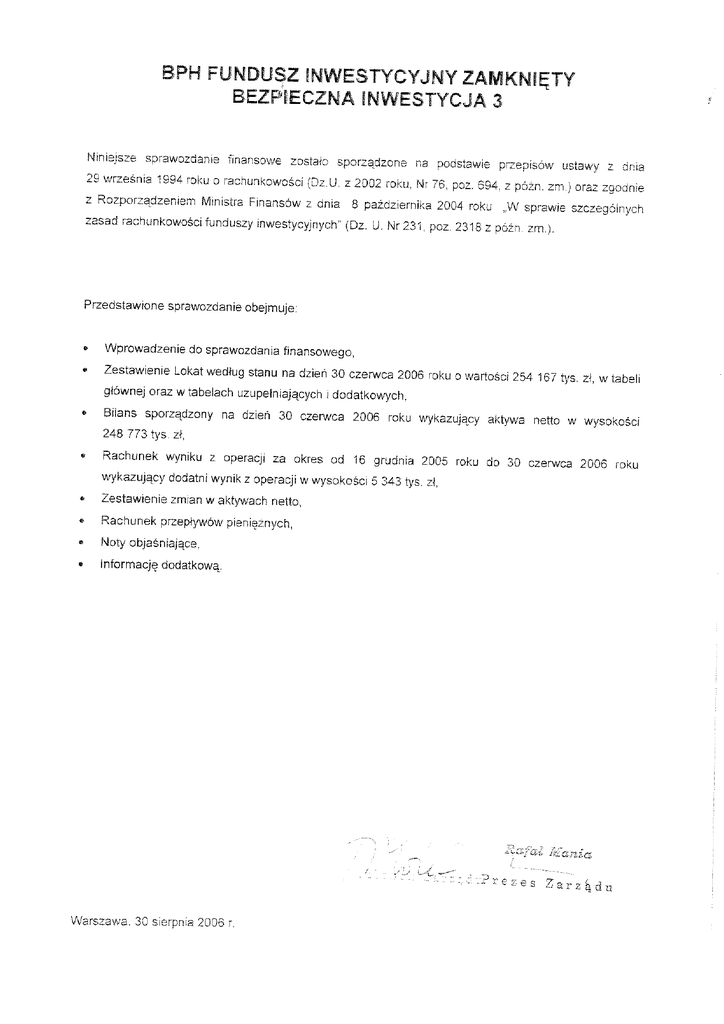 Wprowadzenie BPH Fundusz Inwestycyjny Zamknięty Bezpieczna Inwestycja 3, dalej zwany Funduszem, działa zgodnie z ustawą z dnia 27 maja 2004 roku o funduszach inwestycyjnych (Dz. U. Nr 146 poz. 1546) jako fundusz inwestycyjny zamknięty. Fundusz jest zarządzany przez BPH Towarzystwo Funduszy Inwestycyjnych Spółka Akcyjna z siedzibą w Warszawie pod adresem: ul. Emilii Plater 53, 00-113 Warszawa. Nadzwyczajne Walne Zgromadzenie Akcjonariuszy w dniu 8 marca 2004 roku podjęło uchwałę o zmianie nazwy Towarzystwa z CA IB Towarzystwo Funduszy Inwestycyjnych Spółka Akcyjna (Repertorium A. 646/2004) na BPH Towarzystwo Funduszy Inwestycyjnych Spółka Akcyjna. Towarzystwo wpisane jest do rejestru przedsiębiorców prowadzonego przez Sąd Rejonowy dla Miasta Stołecznego Warszawy, XII Wydział Gospodarczy Krajowego Rejestru Sądowego pod Nr KRS 0000002970. Decyzją nr DFI/W/4034-23/13P-1-4559/05 z dnia 19 października 2005 roku Komisja Papierów Wartościowych i Giełd udzieliła BPH Towarzystwu Funduszy Inwestycyjnych Spółka Akcyjna zezwolenia na utworzenie BPH Funduszu Inwestycyjnego Zamkniętego Bezpieczna Inwestycja 3. W dniu 9 grudnia 2005 roku Fundusz został wpisany do rejestru funduszy inwestycyjnych prowadzonego przez Sąd Okręgowy w Warszawie, VII Wydział Cywilny i Rejestrowy pod numerem RFJ 219. Cel inwestycyjny, specjalizacja oraz stosowane ograniczenia inwestycyjne Celem inwestycyjnym Funduszu jest wzrost wartości Aktywów Funduszu w wyniku wzrostu wartości lokat Funduszu. Dla osiągnięcia celu inwestycyjnego Fundusz będzie stosował strategię zabezpieczania portfela akcji o nazwie Constant Proportion Portfolio Insurance (w skrócie „CPPI”) polegającą na odpowiednim rebalansowaniu udziałów akcji i instrumentów dłużnych w portfelu w celu ochrony Wartości Aktywów Netto Funduszu na Certyfikat Inwestycyjny przed spadkiem poniżej zakładanego poziomu na koniec założonego każdorazowo okresu zgodnie z następującymi założeniami: a) Wartość Aktywów Netto Funduszu w dowolnym momencie nie powinna spaść poniżej określonego poziomu minimalnego, zwanego dalej poziomem odniesienia, tak aby na koniec zdefiniowanego wstępnie okresu Wartość Aktywów Netto Funduszu była nie mniejsza od wymaganego dla uzyskania przyjętego poziomu ochrony kapitału, b) maksymalne zaangażowanie w akcje (dalej zwane także maksymalną ekspozycją) powinno być równe w dowolnym momencie stałej wielokrotności różnicy pomiędzy aktualną Wartością Aktywów Netto Funduszu oraz poziomem odniesienia. Zakładany poziom ochrony kapitału będzie obowiązywał w okresach trzyletnich, przy czym poziom ten, przy zastosowaniu strategii, w pierwszym okresie trzyletnim będzie nie mniejszy niż 100% (sto procent) Wartości Aktywów Netto Funduszu na Certyfikat Inwestycyjny z pierwszego Dnia Wyceny Funduszu. Fundusz poprzez przekazanie raportu bieżącego oraz publikację, w okresie od 4 (czterech) do 2 (dwóch) tygodni przed pierwszym Dniem Wyceny każdego kolejnego okresu trzyletniego, poda do publicznej wiadomości informację o zakładanym poziomie ochrony kapitału w następnym trzyletnim okresie, przy czym poziom ten będzie nie mniejszy niż 100% (sto procent) Wartości Aktywów Netto Funduszu na Certyfikat Inwestycyjny z pierwszego Dnia Wyceny kolejnego okresu trzyletniego. Fundusz może także, w tym samym trybie i na tych samych warunkach, podwyższyć zakładany poziom ochrony kapitału w trakcie trwania trzyletnich okresów, przy czym zmiana ta dotyczy danego okresu trzyletniego i staje się skuteczna w następnym Dniu Giełdowym po dniu, w którym podano do publicznej wiadomości informację o podwyższeniu zakładanego poziomu ochrony kapitału. Fundusz nie gwarantuje osiągnięcia celu inwestycyjnego, w tym w szczególności ochrony kapitału na zakładanym poziomie, a także spełnienia się założeń strategii zabezpieczania portfela akcji. Fundusz, z zastrzeżeniem ograniczeń określonych w Statucie, może lokować Aktywa Funduszu wyłącznie w: a) papiery wartościowe; b) wierzytelności, z wyjątkiem wierzytelności wobec osób fizycznych; c) Instrumenty Pochodne, w tym Niewystandaryzowane Instrumenty Pochodne; d) Instrumenty Rynku Pieniężnego; e) depozyty w bankach krajowych. Okres sprawozdawczy i dzień bilansowy Prezentowane sprawozdanie finansowe obejmuje okres od 16 grudnia 2005 roku do 30 czerwca 2006 roku. Dniem bilansowym jest 30.06.2006 roku. Kontynuacja działalności Poniższe sprawozdanie finansowe zostało sporządzone przy założeniu kontynuacji działalności przez Fundusz w dającej się przewidzieć przyszłości. Czas trwania Funduszu jest nieograniczony. Na dzień sporządzenia sprawozdania finansowego nie ujawniły się żadne przesłanki świadczące o możliwości zaprzestania działalności przez Fundusz, w związku z czym sprawozdanie sporządzono w oparciu o zasadę kontynuacji działania. Wskazanie podmiotu, który przeprowadził przegląd sprawozdania finansowego Przegląd sprawozdania finansowego za okres od 16 grudnia 2005 roku do 30 czerwca 2006 roku został przeprowadzony, na podstawie zawartej umowy o badanie sprawozdania finansowego, przez Deloitte Audyt Sp. z o.o. z siedzibą w Warszawie pod adresem: ul. Piękna 18, 00-549 Warszawa. Wskazanie rynku, na którym notowane są certyfikaty inwestycyjne Certyfikaty inwestycyjne BPH Funduszu Inwestycyjnego Zamkniętego Bezpieczna Inwestycja 3 notowane są na Giełdzie Papierów Wartościowych w Warszawie S.A. Wskazanie serii certyfikatów inwestycyjnych i cech je różnicujących Fundusz BPH FIZ Bezpieczna Inwestycja 3 wyemitował certyfikaty inwestycyjne serii A. Wskazanie emisji certyfikatów inwestycyjnych Certyfikaty inwestycyjne BPH Funduszu Inwestycyjnego Zamkniętego Bezpieczna Inwestycja 3 zostały wyemitowane w pierwszej emisji certyfikatów. Warszawa, 30 sierpnia 2006 r.