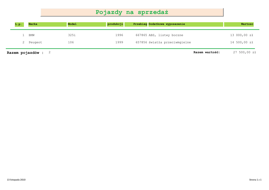 Pojazdy na sprzedaż Marka Model 1 BMW 325i 1996 667865 ABS, listwy boczne 13 000,00 zł 2 Peugeot 106 1999 657856 światła przeciwmgielne 14 500,00 zł L.p. Razem pojazdów : 13 listopada 2010 2 Rok produkcji Przebieg Dodatkowe wyposazenie Wartosc Razem wartość: 27 500,00 zł Strona 1 z 1