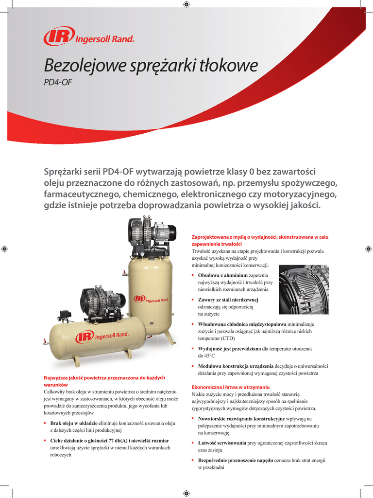 Bezolejowe sprężarki tłokowe PD4-OF Sprężarki serii PD4-OF wytwarzają powietrze klasy 0 bez zawartości oleju przeznaczone do różnych zastosowań, np. przemysłu spożywczego, farmaceutycznego, chemicznego, elektronicznego czy motoryzacyjnego, gdzie istnieje potrzeba doprowadzania powietrza o wysokiej jakości. Zaprojektowana z myślą o wydajności, skonstruowana w celu zapewnienia trwałości Trwałość uzyskana na etapie projektowania i konstrukcji pozwala uzyskać wysoką wydajność przy minimalnej konieczności konserwacji. ■ ■ ■ ■ ■ Najwyższa jakość powietrza przeznaczona do każdych warunków Całkowity brak oleju w strumieniu powietrza o średnim natężeniu jest wymagany w zastosowaniach, w których obecność oleju może prowadzić do zanieczyszczenia produktu, jego wycofania lub kosztownych przestojów. ■ Brak oleju w układzie eliminuje konieczność usuwania oleju z dalszych części linii produkcyjnej Ciche działanie o głośności 77 db(A) i niewielki rozmiar umożliwiają użycie sprężarki w niemal każdych warunkach roboczych Zawory ze stali nierdzewnej odznaczają się odpornością na zużycie Wbudowana chłodnica międzystopniowa minimalizuje zużycie i pozwala osiągnąć jak najniższą różnicę niskich temperatur (CTD) Wydajność jest przewidziana dla temperatur otoczenia do 45°C Modułowa konstrukcja urządzenia decyduje o uniwersalności działania przy zapewnionej wymaganej czystości powietrza Ekonomiczna i łatwa w utrzymaniu Niskie zużycie mocy i przedłużona trwałość stanowią najwygodniejszy i najskuteczniejszy sposób na spełnienie rygorystycznych wymogów dotyczących czystości powietrza. ■ ■ Obudowa z aluminium zapewnia najwyższą wydajność i trwałość przy niewielkich rozmiarach urządzenia ■ ■ Nowatorskie rozwiązania konstrukcyjne wpływają na polepszenie wydajności przy minimalnym zapotrzebowaniu na konserwację Łatwość serwisowania przy ograniczonej częstotliwości skraca czas zastoju Bezpośrednie przenoszenie napędu oznacza brak strat energii w przekładni Konstrukcja modułowa na potrzeby użytkownika Wiele opcji konfiguracji sprężarki PD4-OF pozwala na użycie jej w różnych warunkach roboczych. Silnik o mocy 4 kW (5,5 KM) zapewnia natężenie przepływu do 380 l/min przy ciśnieniu 10 bar g (500 l/min przy 6 bar g) Opcjonalny, montowany na kołach zbiornik o pojemności 270 litrów zapewnia mobilność urządzenia w obrębie obszaru roboczego Opcjonalny, montowany pionowo zbiornik o pojemności 270 litrów zapewnia dużą pojemność na minimalnej przestrzeni Dane techniczne sprężarki Ingersoll Rand PD4-OF — 50 Hz* Silnik Maks. ciśnienie kW KM bar g psig Odbiornik l gal PD4-OF 4,0 5,5 10 145 Montaż na podstawie 380 13,4 77 590 x 400 x 350 PD4-270-3-OF 4,0 5,5 10 145 270 380 13,4 77 PD4-270V-3-OF 4,0 5,5 10 145 380 13,4 77 1767 x 600 x 600 Model/CPN 270 71,3 † 71,3 Pojemność (FAD) l/min cfm Hałas db(A) Wymiary dł. x wys. x szer. mm cale Masa kg lb 23,2 x 15,7 x 13,8 55 121 1527 x 1144 x 594 60,1 x 45,0 x 23,4 158 348 69,6 x 23,6 x 23,6 154 342 *Dostępne opcje 60 Hz i S/D †Konfiguracja pionowa Gwarancja jakości powietrza Osuszacz modułowy Ingersoll Rand wraz z systemem filtrowania stwarza możliwość utrzymania wilgotności natężenia cząstek na wybranym poziomie — wszystko zgodnie z wydajnością klasy 0. Klasa ISO 8573.1:2010 0 Całkowite stężenie oleju (aerozol, ciecz, opar) mg/m3 Klasa wody Wartość ciśnienia skraplania Osuszacz Ingersoll Rand Model/CPN Klasa cząstek stałych Maks. liczba cząstek/m3 Filtry IR/CPN Określone przez użytkownika lub dostawcę urządzenia, ale nie przekraczające w kryteriach klasy 1 1 ≤ 0,01 -70ºC D41IM/23167026* 0,01 mikrona FA40IH/24231896 2 ≤ 0,1 -40ºC D41IM/23166937* 0,1 mikrona FA40IG/24231870 3 ≤1 -20ºC D41IM/23166937* 1 mikrona FA40ID/24231854 4 ≤5 +3ºC IRD42/23231699 — — 5 — +7ºC IRD25/23231681 — — *Dostarczone z filtrem wlotowym klasy H (klasa 1) oraz filtrem wylotowym klasy G (klasa 2) Odwiedź naszą stronę, aby zapoznać się z pełną ofertą urządzeń do przetwarzania powietrza. ingersollrandproducts.com Firma Ingersoll Rand (NYSE:IR) poprawia jakość życia, stwarzając bezpieczne, komfortowe i efektywne środowisko. Nasi pracownicy i rodzina naszych marek - Club Car®, Ingersoll Rand®, Thermo King® i Trane® - współpracują w celu poprawy jakości powietrza i komfortu w domach mieszkalnych i budynkach, w środkach transportu i ochrony żywności oraz produktów łatwo psujących się oraz zwiększenia wydajności w procesach przemysłowych. Jesteśmy firmą o kapitale 12 mld dolarów o globalnym zasięgu dbającą o zrównoważony postęp i trwałe rezultaty. Ingersoll Rand, IR i logo IR są znakami towarowymi firmy Ingersoll Rand, jej spółek zależnych i/lub stowarzyszonych. Sprężarki Ingersoll Rand nie zostały zaprojektowane i nie są przeznaczone lub rekomendowane do wspomagania oddychania. Ingersoll Rand nie zaleca swoich urządzeń jako specjalistycznego sprzętu w zakresie wspomagania oddychania i nie ponosi odpowiedzialności za wykorzystanie sprężarek do takich celów. Żadna z informacji zawartych w niniejszym dokumencie nie rozszerza wyraźnych lub domniemanych gwarancji lub zobowiązań dotyczących produktu w nim opisanego. Wszelkie takie gwarancje lub inne warunki zakupu produktów są zgodne ze standardowymi warunkami zakupu takich produktów Ingersoll Rand, dostępnymi na żądanie. Ulepszanie produktów jest stałym celem Ingersoll Rand. Projekty i specyfikacje mogą ulec zmianie bez wcześniejszego powiadomienia lub powstania jakichkolwiek zobowiązań. Stosujemy bezpieczne dla środowiska techniki drukarskie © 2014 Ingersoll Rand POL52734
