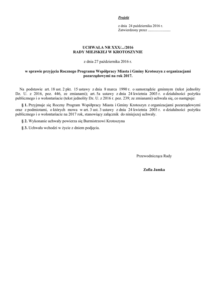 Projekt z dnia 24 października 2016 r. Zatwierdzony przez ......................... UCHWAŁA NR XXX/.../2016 RADY MIEJSKIEJ W KROTOSZYNIE z dnia 27 października 2016 r. w sprawie przyjęcia Rocznego Programu Współpracy Miasta i Gminy Krotoszyn z organizacjami pozarządowymi na rok 2017. Na podstawie art. 18 ust. 2 pkt. 15 ustawy z dnia 8 marca 1990 r. o samorządzie gminnym (tekst jednolity Dz. U. z 2016, poz. 446, ze zmianami); art. 5a ustawy z dnia 24 kwietnia 2003 r. o działalności pożytku publicznego i o wolontariacie (tekst jednolity Dz. U. z 2016 r. poz. 239; ze zmianami) uchwala się, co następuje: § 1. Przyjmuje się Roczny Program Współpracy Miasta i Gminy Krotoszyn z organizacjami pozarządowymi oraz z podmiotami, o których mowa w art. 3 ust. 3 ustawy z dnia 24 kwietnia 2003 r. o działalności pożytku publicznego i o wolontariacie na 2017 rok, stanowiący załącznik do niniejszej uchwały. § 2. Wykonanie uchwały powierza się Burmistrzowi Krotoszyna § 3. Uchwała wchodzi w życie z dniem podjęcia. Przewodnicząca Rady Zofia Jamka Załącznik do Uchwały Nr XXX/.../2016 Rady Miejskiej w Krotoszynie z dnia 27 października 2016 r. ROCZNY PROGRAM WSPÓŁPRACY MIASTA I GMINY KROTOSZYN Z ORGANIZACJAMI POZARZADOWYMI ORAZ INNYMI PODMIOTAMI PROWADZĄCYMI DZIAŁALNOŚĆ POŻYTKU PUBLICZNEGO NA ROK 2017 WPROWADZENIE DZIAŁ I POSTANOWIENIA OGÓLNE DZIAŁ II CELE PROGRAMU DZIAŁ III ZASADY WSPÓŁPRACY DZIAŁ IV ZAKRES PRZEDMIOTOWY DZIAŁ V FORMY WSPÓŁPRACY DZIAŁ VI PRIORYTETOWE ZADANIA PUBLICZNE DZIAŁ VII OKRES REALIZACJI PROGRAMU DZIAŁ VIII SPOSÓB REALIZACJI PROGRAMU DZIAŁ IX SPOSÓB OCENY REALIZACJI PROGRAMU DZIAŁ X SPOSÓB TWORZENIA PROGRAMU ORAZ PRZEBIEG KONSULTACJI DZIAŁ XI TRYB POWOŁYWANIA I ZASADY DZIAŁANIA KOMISJI KONKURSOWYCH DO OPINIOWANIA OFERT W OTWARTYM KONKURSIE OFERT DZIAŁ XII POSTANOWIENIA KOŃCOWE WPROWADZENIE „Roczny Program Współpracy Miastai Gminy Krotoszynz organizacjami pozarządowymi oraz innymi podmiotami prowadzącymi działalność pożytku publicznego na rok 2017” to dokument określający wzajemne zasady działań dwóch suwerennych stron: samorządowej i pozarządowej. Program jest efektem dążenia władz Miasta i Gminy Krotoszyn do rozwoju społeczności lokalnej, budowania aktywności obywatelskiej, budowania wzajemnych relacji wewnątrz i międzysektorowych. Rozległość i zakres działań, w jakie angażują się organizacje pozarządowe, społeczny charakter tych działań oraz wzrastający poziom realizowanych usług powodują, że organizacje są postrzegane jako cenny partner dla jednostek samorządu terytorialnego. Rozszerzają one bowiem możliwości wyboru sposobu zaspakajania potrzeb społecznych, co pozwala na sięganie do ofert tańszych i efektywniejszych. Dla ich bieżącej pracy istotne znaczenie ma zarówno wymiana doświadczeń między organizacjami, jak i współpraca sektora pozarządowego z sektorem publicznym, w szczególności z organami samorządu terytorialnego. Program ma charakter otwarty i zakłada możliwości uwzględniania nowych form pozafinansowego współdziałania, jak również doskonalenia dotychczasowych form współpracy. DZIAŁ I. POSTANOWIENIA OGÓLNE § 1. Podstawą Rocznego Programu Współpracy Miasta i Gminy Krotoszyn z Organizacjami Pozarządowymi na rok 2017, jest art. 5a ust. 1 ustawy z dnia 24 kwietnia 2003 r. o działalności pożytku publicznego i o wolontariacie (tekst jednolity Dz. U. z 2016 r. poz. 239; ze zmianami). § 2. Ilekroć w Programie jest mowa o: 1.Ustawie – rozumie się przez to ustawę z dnia 24 kwietnia 2003 r. o działalności pożytku publicznego i o wolontariacie (tekst jednolity Dz. U. z 2016 r. poz. 239; ze zmianami), 2.Gminie – rozumie się przez to Miasto i Gminę Krotoszyn, 3.Podmiotach programu – rozumie się przez to organizacje pozarządowe oraz inne podmioty prowadzące działalność pożytku publicznego, o których mowa w art. 3 ust. 3 ustawy, 4.Dotacji – rozumie się przez to dotację w rozumieniu art. 127 ust. 1 pkt 1 lit. e oraz art. 221 ustawy z dnia 27 sierpnia 2009 r. o finansach publicznych (tekst jednolity Dz. U. z 2013 r. poz. 885; ze zmianami), 5.Konkursie – rozumie się przez to otwarte konkursy ofert, o których mowa w art. 11,ust. 2 oraz art. 13 ustawy, 6.Programie – rozumie się przez to Roczny Program Współpracy Miasta i Gminy Krotoszyn z organizacjami pozarządowymi na rok 2017, 7.Strona internetowa Miasta – rozumie się przez to adres internetowy www.krotoszyn.pl , 8.Strona internetowa Współdziałamy internetowy www.wspoldzialamy.krotoszyn.pl . – rozumie się przez to adres DZIAŁ II. CELE PROGRAMU § 3. Celem głównym Programu jest rozwój współpracy Miasta i Gminy Krotoszyn z organizacjami pozarządowymi oraz określenie jej ram na rzecz budowania społeczeństwa obywatelskiego. § 4. Celami szczegółowymi programu są: 1)podniesie skuteczności i efektywności działań podejmowanych w sferze zadań publicznych, 2)wsparcie Podmiotów programu w rozwoju i lepszym przygotowaniu do współpracy z Gminą w zakresie realizacji zadań publicznych oraz osiągnięciu ważnych celów społecznych Gminy, 3)umacnianie w świadomości społecznej poczucia odpowiedzialności za siebie, swoje otoczenie, wspólnotę lokalną oraz jej tradycje, 4)promowanie i rozwój wolontariatu wśród lokalnej społeczności, 5)rozwijanie i podejmowanie wspólnych inicjatyw na rzecz zwiększenia aktywności mieszkańców Gminy, 6)prowadzenie nowatorskich i efektywnych działań na rzecz mieszkańców, 7)zwiększenie udziału mieszkańców w rozwiązywaniu lokalnych problemów, 8)poprawa jakości życia poprzez pełniejsze zaspokojenie potrzeb społecznych. DZIAŁ III. ZASADY WSPÓŁPRACY § 5. Współpraca Gminy z Podmiotami programu odbywa się na zasadach: 1) pomocniczości – gmina udziela pomocy organizacjom pozarządowym w niezbędnym zakresie, uzasadnionej potrzebami wspólnoty samorządowej, a organizacje zapewniają ic