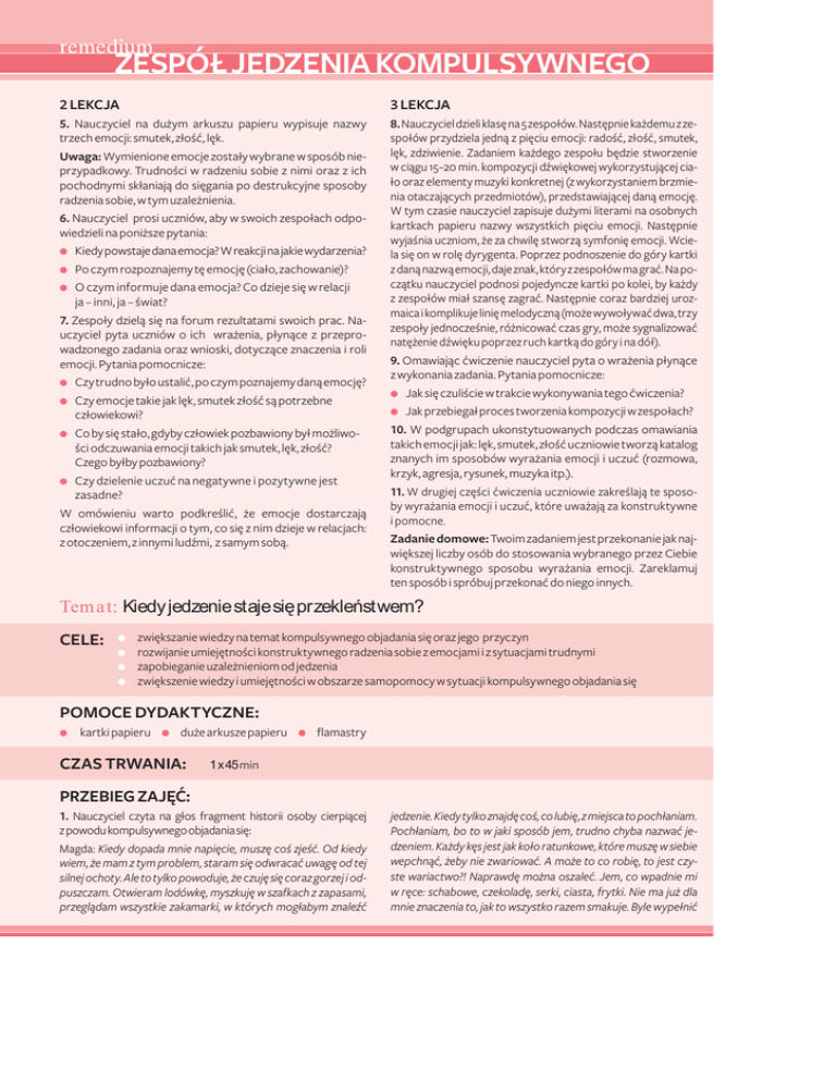 ZESPÓŁ JEDZENIA KOMPULSYWNEGO 2 LEKCJA 3 LEKCJA 5. Nauczyciel na dużym arkuszu papieru wypisuje nazwy trzech emocji: smutek, złość, lęk. Uwaga: Wymienione emocje zostały wybrane w sposób nieprzypadkowy. Trudności w radzeniu sobie z nimi oraz z ich pochodnymi skłaniają do sięgania po destrukcyjne sposoby radzenia sobie, w tym uzależnienia. 6. Nauczyciel prosi uczniów, aby w swoich zespołach odpowiedzieli na poniższe pytania: ● Kiedy powstaje dana emocja? W reakcji na jakie wydarzenia? ● Po czym rozpoznajemy tę emocję (ciało, zachowanie)? ● O czym informuje dana emocja? Co dzieje się w relacji ja – inni, ja – świat? 7. Zespoły dzielą się na forum rezultatami swoich prac. Nauczyciel pyta uczniów o ich wrażenia, płynące z przeprowadzonego zadania oraz wnioski, dotyczące znaczenia i roli emocji. Pytania pomocnicze: ● Czy trudno było ustalić, po czym poznajemy daną emocję? ● Czy emocje takie jak lęk, smutek złość są potrzebne człowiekowi? ● Co by się stało, gdyby człowiek pozbawiony był możliwości odczuwania emocji takich jak smutek, lęk, złość? Czego byłby pozbawiony? 8. Nauczyciel dzieli klasę na 5 zespołów. Następnie każdemu z zespołów przydziela jedną z pięciu emocji: radość, złość, smutek, lęk, zdziwienie. Zadaniem każdego zespołu będzie stworzenie w ciągu 15–20 min. kompozycji dźwiękowej wykorzystującej ciało oraz elementy muzyki konkretnej (z wykorzystaniem brzmienia otaczających przedmiotów), przedstawiającej daną emocję. W tym czasie nauczyciel zapisuje dużymi literami na osobnych kartkach papieru nazwy wszystkich pięciu emocji. Następnie wyjaśnia uczniom, że za chwilę stworzą symfonię emocji. Wciela się on w rolę dyrygenta. Poprzez podnoszenie do góry kartki z daną nazwą emocji, daje znak, który z zespołów ma grać. Na początku nauczyciel podnosi pojedyncze kartki po kolei, by każdy z zespołów miał szansę zagrać. Następnie coraz bardziej urozmaica i komplikuje linię melodyczną (może wywoływać dwa, trzy zespoły jednocześnie, różnicować czas gry, może sygnalizować natężenie dźwięku poprzez ruch kartką do góry i na dół). 9. Omawiając ćwiczenie nauczyciel pyta o wrażenia płynące z wykonania zadania. Pytania pomocnicze: ● Jak się czuliście w trakcie wykonywania tego ćwiczenia? ● Jak przebiegał proces tworzenia kompozycji w zespołach? Czy dzielenie uczuć na negatywne i pozytywne jest zasadne? W omówieniu warto podkreślić, że emocje dostarczają człowiekowi informacji o tym, co się z nim dzieje w relacjach: z otoczeniem, z innymi ludźmi, z samym sobą. ● 10. W podgrupach ukonstytuowanych podczas omawiania takich emocji jak: lęk, smutek, złość uczniowie tworzą katalog znanych im sposobów wyrażania emocji i uczuć (rozmowa, krzyk, agresja, rysunek, muzyka itp.). 11. W drugiej części ćwiczenia uczniowie zakreślają te sposoby wyrażania emocji i uczuć, które uważają za konstruktywne i pomocne. Zadanie domowe: Twoim zadaniem jest przekonanie jak największej liczby osób do stosowania wybranego przez Ciebie konstruktywnego sposobu wyrażania emocji. Zareklamuj ten sposób i spróbuj przekonać do niego innych. Tem at: Kiedy jedzenie staje się przekleństwem? CELE: ● ● ● ● zwiększanie wiedzy na temat kompulsywnego objadania się oraz jego przyczyn rozwijanie umiejętności konstruktywnego radzenia sobie z emocjami i z sytuacjami trudnymi zapobieganie uzależnieniom od jedzenia zwiększenie wiedzy i umiejętności w obszarze samopomocy w sytuacji kompulsywnego objadania się POMOCE DYDAKTYCZNE: ● kartki papieru ● duże arkusze papieru CZAS TRWANIA: ● flamastry 1 x 45 min PRZEBIEG ZAJĘĆ: 1. Nauczyciel czyta na głos fragment historii osoby cierpiącej z powodu kompulsywnego objadania się: Magda: Kiedy dopada mnie napięcie, muszę coś zjeść. Od kiedy wiem, że mam z tym problem, staram się odwracać uwagę od tej silnej ochoty. Ale to tylko powoduje, że czuję się coraz gorzej i odpuszczam. Otwieram lodówkę, myszkuję w szafkach z zapasami, przeglądam wszystkie zakamarki, w których mogłabym znaleźć jedzenie. Kiedy tylko znajdę coś, co lubię, z miejsca to pochłaniam. Pochłaniam, bo to w jaki sposób jem, trudno chyba nazwać jedzeniem. Każdy kęs jest jak koło ratunkowe, które muszę w siebie wepchnąć, żeby nie zwariować. A może to co robię, to jest czyste wariactwo?! Naprawdę można oszaleć. Jem, co wpadnie mi w ręce: schabowe, czekoladę, serki, ciasta, frytki. Nie ma już dla mnie znaczenia to, jak to wszystko razem smakuje. Byle wypełnić pustkę w sobie. Jeżeli w domu zabraknie mi jedzenia, idę do pobliskiego sklepu. Kupuję chipsy, czekoladę i produkty, które wymagają większego zachodu. Podczas gdy w rondlu podgrzewam sobie zupę, fasolkę po bretońsku, zajadam się chipsami i czekoladą. Po takich napadach nie dość, że źle czuję się fizycznie, mdli mnie, to mam jeszcze strasznego doła. Czuję się okropnie z tym, że robię coś takiego. Ale nie mogę tego powstrzymać. Mimo tego, że wiem, że potem będę czuła się strasznie, miała poczucie winy, to i tak to robię. To jakiś koszmar…. 2. Nauczyciel wprowadza uczniów do tematu lekcji: W trakcie dzisiejszej lekcji zajmiemy się tematyką kompulsywnego jedzenia. Prosi uczniów, aby podzieli się wrażeniami z wysłuchanego fragmentu opisu przeżyć „jedzenioholiczki”. Pytania pomocnicze: ● Kiedy Magda sięga po jedzenie? Jakie pojawiły się myśli, odczucia, kiedy słuchaliście tego, co i w jakiej ilości zjada Magda? ● Co Magdzie ma dać jedzenie? Czy chodzi tylko o zaspokojenie głodu fizycznego? 3. Po wysłuchaniu odpowiedzi uczniów nauczyciel podsumowuje rozmowę na temat problemu Magdy i wspólnie z uczniami i odpowiadają sobie na pytanie – czym jest kompulsywne objadanie się? ● 4. Nauczyciel dzieli klasę na trzy lub sześć zespołów, których zadaniem będzie stworzenie 