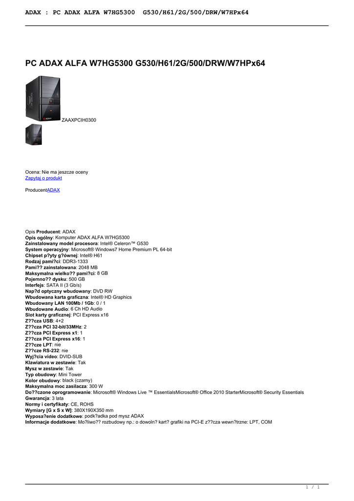 ADAX : PC ADAX ALFA W7HG5300 G530/H61/2G/500/DRW/W7HPx64 PC ADAX ALFA W7HG5300 G530/H61/2G/500/DRW/W7HPx64 ZAAXPCIH0300 Ocena: Nie ma jeszcze oceny Zapytaj o produkt ProducentADAX Opis Producent: ADAX Opis ogólny: Komputer ADAX ALFA W7HG5300 Zainstalowany model procesora: Intel® Celeron™ G530 System operacyjny: Microsoft® Windows7 Home Premium PL 64-bit Chipset p?yty g?ównej: Intel® H61 Rodzaj pami?ci: DDR3-1333 Pami?? zainstalowana: 2048 MB Maksymalna wielko?? pami?ci: 8 GB Pojemno?? dysku: 500 GB Interfejs: SATA II (3 Gb/s) Nap?d optyczny wbudowany: DVD RW Wbudowana karta graficzna: Intel® HD Graphics Wbudowany LAN 100Mb / 1Gb: 0 / 1 Wbudowane Audio: 6 Ch HD Audio Slot karty graficznej: PCI Express x16 Z??cza USB: 4+2 Z??cza PCI 32-bit/33MHz: 2 Z??cza PCI Express x1: 1 Z??cza PCI Express x16: 1 Z??cze LPT: nie Z??cze RS-232: nie Wyj?cia video: DVID-SUB Klawiatura w zestawie: Tak Mysz w zestawie: Tak Typ obudowy: Mini Tower Kolor obudowy: black (czarny) Maksymalna moc zasilacza: 300 W Do??czone oprogramowanie: Microsoft® Windows Live ™ EssentialsMicrosoft® Office 2010 StarterMicrosoft® Security Essentials Gwarancja: 3 lata Normy i certyfikaty: CE, ROHS Wymiary [G x S x W]: 380X190X350 mm Wyposa?enie dodatkowe: podk?adka pod mysz ADAX Informacje dodatkowe: Mo?liwo?? rozbudowy np.: o dowoln? kart? grafiki na PCI-E z??cza wewn?trzne: LPT, COM 1 / 1 Powered by TCPDF (www.tcpdf.org)