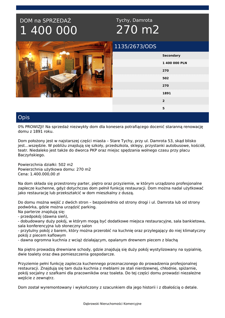 Tychy, Damrota DOM na SPRZEDAŻ 270 m2 1 400 000 1135/2673/ODS Secondary 1 400 000 PLN 270 502 270 1891 2 5 Opis 0% PROWIZJI! Na sprzedaż niezwykły dom dla konesera potrafiącego docenić staranną renowację domu z 1891 roku. Dom położony jest w najstarszej części miasta – Stare Tychy, przy ul. Damrota 53, skąd blisko jest…wszędzie. W pobliżu znajdują się szkoły, przedszkola, sklepy, przystanki autobusowe, kościół, teatr. Niedaleko jest także do dworca PKP oraz miejsc spędzania wolnego czasu przy placu Baczyńskiego. Powierzchnia działki: 502 m2 Powierzchnia użytkowa domu: 270 m2 Cena: 1.400.000,00 zł Na dom składa się przestronny parter, piętro oraz przyziemie, w którym urządzono profesjonalne zaplecze kuchenne, gdyż dotychczas dom pełnił funkcję restauracji. Dom można nadal użytkować jako restaurację lub przekształcić w dom mieszkalny z duszą. Do domu można wejść z dwóch stron – bezpośrednio od strony drogi i ul. Damrota lub od strony podwórka, gdzie można urządzić parking. Na parterze znajdują się: - przedpokój (dawna sień), - dobudowany duży pokój, w którym mogą być dodatkowe miejsca restauracyjne, sala bankietowa, sala konferencyjna lub słoneczny salon - przytulny pokój z barem, który można przerobić na kuchnię oraz przylegający do niej klimatyczny pokój z piecem kaflowym - dawna ogromna kuchnia z wciąż działającym, opalanym drewnem piecem z blachą Na piętro prowadzą drewniane schody, gdzie znajdują się duży pokój wystylizowany na sypialnię, dwie toalety oraz dwa pomieszczenia gospodarcze. Przyziemie pełni funkcję zaplecza kuchennego przeznaczonego do prowadzenia profesjonalnej restauracji. Znajdują się tam duża kuchnia z meblami ze stali nierdzewnej, chłodnie, spiżarnie, pokój socjalny z szafkami dla pracowników oraz toaleta. Do tej części domu prowadzi niezależne wejście z zewnątrz. Dom został wyremontowany i wykończony z szacunkiem dla jego historii i z dbałością o detale. Dąbrowski Nieruchomości Komercyjne Został również unowocześniony poprzez rozprowadzenie systemu klimatyzacji, rozprowadzenie ciepła w czasie użytkowania pieca kuchennego opalanego drewnem, kolektory słoneczne wspomagają natomiast ogrzewanie ciepłej wody. Na wyposażeniu domu pozostają tylko elementy trwale z nim związane, ale jest możliwość pozostawienia mebli i innego wyposażenia za dopłatą. Serdecznie zapraszam do kontaktu i umówienie się na prezentację domu. Zostaną Państwo oczarowani jego historyczną atmosferą, przytulnością i wrażeniem wizyty u babci na wsi. Agent nieruchomości zainteresowany tą ofertą dla swojego klienta proszony jest o kontakt. Chętnie uzgodnimy warunki współpracy z RE/MAX przy sprzedaży. Oferujemy dogodne warunki kredytowe przy zakupie nieruchomości i pomagamy w załatwieniu formalności związanych z uzyskaniem kredytu hipotecznego. CAŁOŚĆ KOSZTÓW POŚREDNICTWA POKRYWA WŁAŚCICIEL NIERUCHOMOŚCI – KUPUJĄCY NIE PŁACI WYNAGRODZENIA AGENCJI. Paweł Dąbrowski (nr.licencji: 9855) Dąbrowski Nieruchomości Komercyjne lokale użytkowe i biurowe, inwestycje komercyjne Biuro: 00-867, Warszawa ul.Al.J.Pawła II 27 Tel. 534 199 999 [email protected] www.biuro-dnk.pl Paweł Dąbrowski ( Nr. licencji: 9855 ) tel. tel. 534-199-999, www.biuro-dnk.pl tel. 889-838-491 email: [email protected] Dąbrowski Nieruchomości Komercyjne Powered by TCPDF (www.tcpdf.org)
