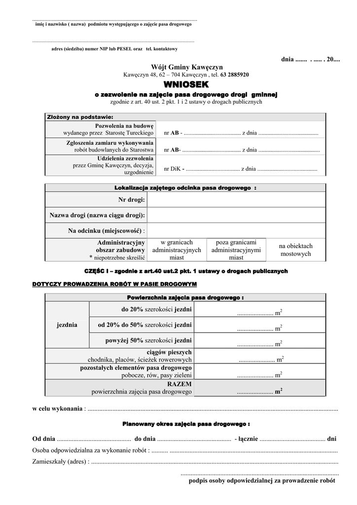 .............................................................................................................. imię i nazwisko ( nazwa) podmiotu występującego o zajęcie pasa drogowego ....................................................................................................................................... adres (siedziba) numer NIP lub PESEL oraz tel. kontaktowy dnia ....... . ..... . 20.... Wójt Gminy Kawęczyn Kawęczyn 48, 62 – 704 Kawęczyn , tel. 63 2885920 WNIOSEK o zezwolenie na zajęcie pasa drogowego drogi gminnej zgodnie z art. 40 ust. 2 pkt. 1 i 2 ustawy o drogach publicznych ZłoŜony na podstawie: Pozwolenia na budowę wydanego przez Starostę Tureckiego Zgłoszenia zamiaru wykonywania robót budowlanych do Starostwa Udzielenia zezwolenia przez Gminę Kawęczyn, decyzja, uzgodnienie nr AB - ...................................... z dnia ........................................ nr AB- ....................................... z dnia ......................................... nr DiK - .................................... z dnia ........................................ Lokalizacja zajętego odcinka odcinka pasa drogowego : Nr drogi: Nazwa drogi (nazwa ciągu drogi): Na odcinku (miejscowość) : Administracyjny obszar zabudowy * niepotrzebne skreślić w granicach administracyjnych miast poza granicami administracyjnymi miast na obiektach mostowych CZĘŚC I – zgodnie z art.40 ust.2 pkt. 1 ustawy o drogach publicznych DOTYCZY PROWADZENIA ROBÓT W PASIE DROGOWYM Powierzchnia zajęcia pasa drogowego : jezdnia do 20% szerokości jezdni ...................... m2 od 20% do 50% szerokości jezdni ...................... m2 powyŜej 50% szerokości jezdni ...................... m2 ciągów pieszych chodnika, placów, ścieŜek rowerowych pozostałych elementów pasa drogowego pobocze, rów, pasy zieleni RAZEM powierzchnia zajęcia pasa drogowego ...................... m2 ...................... m2 ...................... m2 w celu wykonania : ........................................................................................................................................................ Planowany okres okres zajęcia pasa drogowego : Od dnia ............................................. do dnia ............................................. - łącznie ........................................ dni Osoba odpowiedzialna za wykonanie robót : .......... ...................................................................................................... Zamieszkały (adres) : ...................................................................................................................................................... ................................................................................................ podpis osoby odpowiedzialnej za prowadzenie robót CZĘŚC II – zgodnie z art.40 ust.2 pkt. 2 ustawy o drogach publicznych DOTYCZY UMIESZCZANIA W PASIE DROGOWYM URZĄDZEŃ INFRASTRUKTURY TECHNICZNEJ Rodzaj urządzeń infrastruktury technicznej umieszczonych w pasie drogowym: 1 2 3 4 Powierzchnia infrastruktury infrastruktury technicznej urządzeń umieszczonych w pasie drogowym: 1 ...................................................................................... m2 2 ...................................................................................... m2 3 ...................................................................................... m2 4 ...................................................................................... m2 RAZEM powierzchnia urządzeń ...................................................................................... m2 Planowany okres umieszczenia urządzeń infrastruktury technicznej w pasie drogowym: Na czas nie określony od dnia ..... . .......... 200.... roku Oświadczenie: Oświadczam, Ŝe jestem właścicielem w/w urządzeń infrastruktury technicznej zgodnie z art. 40 ust. 2 pkt.2 ustawy o drogach publicznych. ............................................................................................................... podpis właściciela urządzenia umieszczanego w pasie drogowym adres (siedziba) oraz tel. kontaktowy Załączniki do wniosku stanowią : 1. szczegółowy plan sytuacyjny w skali 1:1000 lub 1:500 z zaznaczeniem granic i podaniem wymiarów planowanej powierzchni zajęcia pasa drogowego 2. zatwierdzony projekt organizacji ruchu, jeŜeli zajęcie pasa drogowego wpływa na ruch drogowy lub ogranicza widoczność na drodze lub powoduje wprowadzenie zmian w istniejącej organizacji ruchu pojazdów lub pieszych, jeŜeli nie jest wymagany projekt organizacji ruchu to informacja o sposobie zabezpieczenia robót. 3. oświadczenie o posiadaniu waŜnego pozwolenia na budowę obiektu umieszczanego w pasie drogowym lub zgłoszeniu budowy lub prowadzonych robót właściwemu organowi administracji architektoniczo – budowlanej (kserokopia tych dokumentów) 4. stosowne upowaŜnienia ........................................................... podpis wnioskodawcy