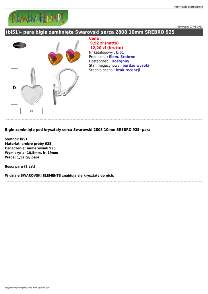 Informacje o produkcie Utworzono 07-03-2017 (bi51)- para bigle zamknięte Swarovski serca 2808 10mm SREBRO 925 Cena : 9,92 zł (netto) 12,20 zł (brutto) Nr katalogowy : bi51 Producent : Elem. Srebrne Dostępność : Dostępny Stan magazynowy : bardzo wysoki Średnia ocena : brak recenzji Bigle zamknięte pod kryształy serca Swarovski 2808 10mm SREBRO 925- para Symbol: bi51 Materiał: srebro próby 925 Oznaczenie: numerownik 925 Wymiary: a- 10,5mm, b- 19mm Waga: 1,52 gr/ para Ilość: para (2 szt) W dziale SWAROVSKI ELEMENTS znajdują się kryształy do nich. Wygenerowano w programie www.oscGold.com