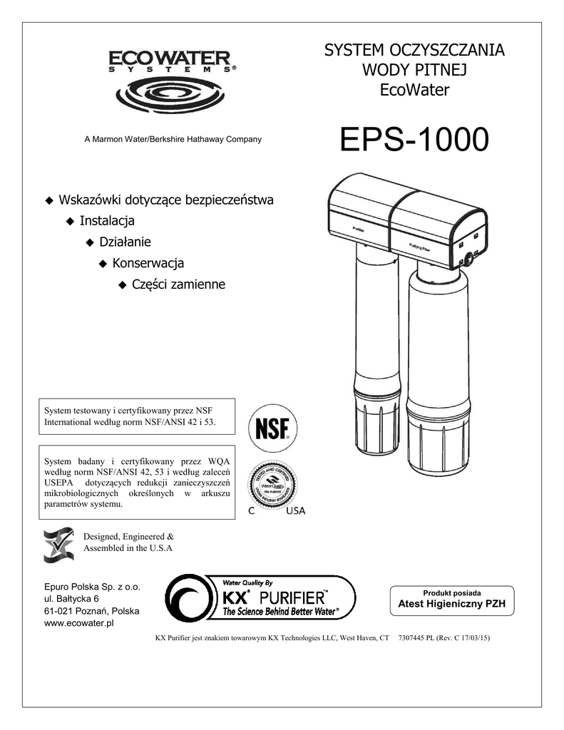 SYSTEM OCZYSZCZANIA WODY PITNEJ EcoWater A Marmon Water/Berkshire Hathaway Company EPS-1000 Wskazówki dotyczące bezpieczeństwa Instalacja Działanie Konserwacja Części zamienne System testowany i certyfikowany przez NSF International według norm NSF/ANSI 42 i 53. System badany i certyfikowany przez WQA według norm NSF/ANSI 42, 53 i według zaleceń USEPA dotyczących redukcji zanieczyszczeń mikrobiologicznych określonych w arkuszu parametrów systemu. Designed, Engineered & Assembled in the U.S.A Epuro Polska Sp. z o.o. ul. Bałtycka 6 61-021 Poznań, Polska www.ecowater.pl Produkt posiada Atest Higieniczny PZH KX Purifier jest znakiem towarowym KX Technologies LLC, West Haven, CT 7307445 PL (Rev. C 17/03/15) SPIS TREŚCI PRZEZNACZENIE SYSTEMU OCZYSZCZANIA WODY PITNEJ ............................................... 2 WSKAZÓWKI DOTYCZĄCE BEZPIECZEŃSTWA ...................................................................... 3 DANE TECHNICZNE I WYMIARY............................................................................................... 4 ELEMENTY SYSTEMU ............................................................................................................... 4 POTRZEBNE MATERIAŁY I NARZĘDZIA .................................................................................. 4 TYPOWA INSTALACJA PODZLEWOZMYWAKOWA ................................................................. 5 KOLEJNOŚĆ MONTAŻU ........................................................................................................... 5 Etap I – Wykonanie przyłącza wody zasilającej. ...................................................................... 5 Etap II - Nawiercanie otworu na kranik czerpalny wody przefiltrowanej ................................... 6 Etap III - Instalowanie kranika czerpalnego (dostarczany osobno) ........................................... 6 Etap IV - Wykonywanie połączeń ............................................................................................. 7 Łączenie rur: ............................................................................................................................ 8 Etap V - Instalowanie wkładów filtracyjnych ............................................................................. 9 Etap VI – Napełnianie systemu wodą, sprawdzenie szczelności i płukanie. ............................. 9 WKŁADY FILTRACYJNE ............................................................................................................ 9 Trwałość filtrów ........................................................................................................................ 9 Wymiana wkładów filtracyjnych ................................................................................................ 9 ROZWIĄZYWANIE PROBLEMÓW W SYSTEMIE .................................................................... 10 ELEMENTY SYSTEMU ............................................................................................................. 11 LISTA CZĘŚCI ZAMIENNYCH .................................................................................................. 12 GWARANCJA Firma ECOWATER Systems LLC (Gwarant) udziela pierwotnemu nabywcy gwarancji na zakupione urządzenie na okres pięciu (5) lat od daty jego zakupu. Zakresem gwarancji są objęte wady materiałowe i wykonawcze. Gwarancja niniejsza nie obejmuje materiałów zużywających się podczas normalnej eksploatacji takich jak wstępne i końcowe wymienne wkłady filtracyjne. Niniejsza gwarancja nie obejmuje opłat za przesyłkę, instalację i serwis. Uszkodzone części, z wyłączeniem elementów nie objętych niniejszą gwarancją, w okresie gwarancyjnym zostaną naprawione lub wymienione po dostarczeniu produktu do dystrybutora firmy ECOWATER. Jedynym zobowiązaniem ECOWATER Systems LLC, w ramach niniejszej gwarancji, jest dokonanie wymiany lub naprawy komponentu lub części, która okaże się wadliwa, w określonym czasie. ECOWATER nie ponosi odpowiedzialności za pośrednie lub przypadkowe szkody powstałe wskutek niewłaściwego użytkowania, modyfikacji, zaniedbania, wynikające z dokonywania samodzielnych napraw lub powstałe w wyniku działania sił natury. Gwarant nie ponosi odpowiedzialności za szkody lub utracone korzyści wynikające z nieprawidłowego działania produktów. Warunki niniejszej gwarancji mają zastosowanie w zakresie w jakim prawo krajowe bezwzględnie wiążące (którego nie można zmienić) właściwe dla pierwotnego klienta końcowego nie stanowi inaczej. W przypadku pojawienia się problemu należy skontaktować się bezpośrednio ze sprzedającym. Do zgłoszenia reklamacji należy dołączyć fakturę lub inny dowód zakupu. 2 PRZEZNACZENIE SYSTEMU OCZYSZCZANIA WODY PITNEJ EPS-1000 jest systemem przeznaczonym do oczyszczania wody. System wykorzystuje podwójny układ filtrów do usuwania z wody niepożądanych składników nadających wodzie smak i zapach chloru, a także usuwa zanieczyszczenia mechaniczne, związki ołowiu, wirusy, bakterie, cysty i wiele innych związków organicznych. Jednocześnie, układ pozostawia w wodzie występujące w niej minerały. EPS-1000 wykorzystuje opatentowaną technologię KX® Purifier™, która zapewnia bezpieczne i skuteczne oczyszczanie wody. Filtry należy wymieniać po 6 miesiącach użytkowania lub po uzdatnieniu 1325 litrów wody (350 galonów). Technologia Purifier™ powoduje zatrzymanie przepływu, gdy zdolność układu do ochrony użytkownika została utracona. Ta bezpieczna i jedyna w swoim rodzaju technologia sprawia, że użytkownik nie będzie narażony na konsumpcję zanieczyszczonej wody. UWAGA: Karta techniczna, dołączona do urządzenia, zawiera dane dotyczące oczyszczania wody wodociągowej w tym systemie. Należy zapoznać się z kartą techniczną, która zawiera dane odnośnie poszczególnych zanieczyszczeń i wydajności redukcji zanieczyszczeń mikrobiologicznych. 