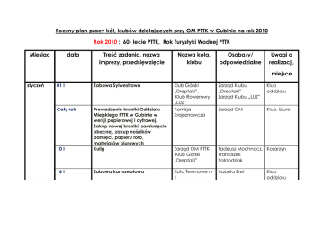Roczny plan pracy kół, klubów działających przy OM PTTK w Gubinie na rok 2010 Rok 2010 : 60- lecie PTTK, Rok Turystyki Wodnej PTTK Miesiąc data Treść zadania, nazwa imprezy, przedsięwzięcie Nazwa koła, klubu Osoba/y/ odpowiedzialne Uwagi o realizacji, miejsce styczeń 01 I Zabawa Sylwestrowa Cały rok 10 I Prowadzenie kroniki Oddziału Miejskiego PTTK w Gubinie w wersji papierowej i cyfrowej. Zakup nowej kroniki, zamknięcie obecnej, zakup nośników pamięci, papieru foto, materiałów biurowych Kulig 16 I Zabawa karnawałowa Klub Górski „Dreptaki”, Klub Rowerowy „LUZ” Komisja Krajoznawcza Zarząd Klubu „Dreptaki” Zarząd Klubu „LUZ” Klub oddziału Zarząd OM Klub, biuro Zarząd OM PTTK , Klub Górski „Dreptaki” Tadeusz Mochnacz, Kosarzyn Franciszek Sałandziak Koło Terenowe nr 1 Izabela Eret Klub oddziału luty 16 I Wycieczka autokarowa dla dzieci i młodzieŜy do Zielonej Góry i Krosna Odrz. - zwiedzanie miast, zabytków Zarząd OM SOSW Gubin Koło Młodego Turysty /SP nr3/ SKTK Starosiedle GraŜyna Bartkowiak Iwona Kolińska GraŜyna Dymarczyk Dorota Ździebło ElŜbieta Tomczak Zielona Góra Krosno Odrz 23 I Bal przebierańców, impreza karnawałowa Klub Rowerowy „Luz” Klub Górski „Dreptaki” Koło Terenowe nr 2 Iwona Kolińska, Ewa Brewerska, Jadwiga Kowalska, Klub oddziału 6 II „Wieczór chiński” Klub Górski „ Dreptaki” Klub oddziału Wyjazd do Burgu na basen „Dbamy o swoją kondycję” Naturfreunde, Rola PTTK w organizacjach międzynarodowych, rozwijanie regionalizmu w Europie, znaczenie produktów lokalnych w promocji regionu. Popularyzacja idei regionalizmu, wieczornica z elementami produktów lokalnych Klub Rowerowy „LUZ” Komisja Krajoznawcza Zarząd Klubu, Ryszard Pruchniewicz Olga Ficnerowska, Jan Ficnerowski Komisja Krajoznawcza 12 II Termy w Burgu Klub oddziału 18 II 20 II Spacer z przewodnikiem po Gubinie Wycieczka do Izby Muzealnej w Gubinie Koło Młodego Turysty /SP nr3/ SKKT PTTK Starosiedle GraŜyna Dymarczyk Dorota Ździebło Izba muzealna, Gubin 19 II Klub Rowerowy „LUZ” Krzysztof Szmigielski Klub oddziału 20 II Jak dbać o rower – wskazówki, obsługa techniczna (praktyczna wymiana dędki, pompowanie, wymiana Ŝarówek itp., - kurs obsługi roweru) Atrakcje turystyczne Turcji Koło Terenowe nr 1 Klub oddziału 20 II Spotkanie przy ognisku Koło Terenowe nr 2 Ewa Dąbek, Anita Majer, Beata Kutrowska J, Z Spalle 21 II Wieczór Keniński W uzgodnieniu z władzą PTTK Działalność Organów Statutowych PTTK. Udział w wybranym posiedzeniu Organu Statutowego PTTK szczebla centralnego Klub Górski „Dreptaki” Komisja Krajoznawcza Eugenia Mochnacz Zenon Pilarczyk Stadion miejski /mały/ Klub oddziału marzec 4 III KAZIUKI – udział w imprezie Muzeum etnograficznego w Ochli. Jarmark wyrobów Rękodzielniczych. Palmy wileńskie, pisanki, ceramika, rzeźba, kompozycje ze sznurka i wosku pszczelego, kołduny litewskie, cepeliny itp. Wycieczka oddziału „Na ostatni śnieg” Komisja Krajoznawcza Komisja Krajoznawcza Muzeum w Ochli Zarząd OM Kotlina Kłodzka 5 III Posiedzenie Zarządu Koła 13 III Prace społeczne na stanicy wodnej w Kosarzynie, spotkanie klubowe Wycieczka samochodowa do Świeradowa Rozpoczęcie sezonu rowerowego 2010, Otwarcie Sezonu Turystycznego Koło Terenowe nr 1 Klub Dreptaki, Klub Rowerowy „LUZ” Koło Terenowe nr 1 Klub Rowerowy „LUZ” Klub Górski „Dreptaki” Ryszard Pruchniewicz, Danuta Mazur, Andrzej Konieczka, GraŜyna Bartkowiak, Iwona Kolińska Zarząd Koła Zarząd Klubów Kosarzyn Prezes Koła Świeradów i okolice Kosarzyn 5-7 III 13-14 III 20 III 21 III Wycieczka na basen z wodami termalnymi Koło Terenowe nr 2 Iwona Kolińska, Romuald Skrzypczak, Zarząd Klubu „Dreptaki” J. Pańko Grabice Burg /Niemcy/ 25 III Szukamy śladów wiosny ( jeśli pogoda dopisze – wycieczka rowerowa do Lasek) Wycieczka po Wzgórzach Gubińskich „Szukamy wiosny” SKKT PTTK Starosiedle Dorota Ździebło Koło Młodego Turysty /SP nr3/ GraŜyna Dymarczyk 27 III 28 III Wycieczka rowerowa „Szlakiem KrzyŜy Pokutnych” Klub Rowerowy „LUZ” GraŜyna Bartkowiak, Romuald Skrzypczak Gubin, Markosice, Koło 10 IV 11 IV Wycieczka rowerowa „Jeziora w okolicach Guben” Klub Rowerowy „LUZ” Olga Ficnerowska, Jan Ficnerowski 10 IV „Święto wiosny” Klub Górski „Dreptaki” 17 IV 18 IV „Ruszaj się, bo zardzewiejesz” – piknik nad Odrą Klub Rowerowy „LUZ” 22 IV Wycieczka do Berlina- Muzeum Historii Naturalnej i ZOO Wycieczka samochodowo – rowerowa Gębice – Jałowice SKKT PTTK Starosiedle Koło Terenowe nr 1 Zarząd Koła, E. Guziewicz, A. Konieczka Ryszard Turowski, Wojciech Kacperski, Aleksander Pieróg Dorota śdziebło Jeziora: Kleinsee, Groβsee Okolice Gubina 27 III Kwiecień 24 IV 24 IV Wycieczka rowerowa „Poznajemy Koło Młodego okolice Gubina” Turysty /SP nr3/ Laski , okolice Starosiedla Okolice Gubina Okolice Łomów Berlin Mieczysław Jasinowski Gębice Jałowice GraŜyna Dymarczyk, Okolice Gubina Maj 25 IV Wycieczka samochodowa „Zabytkowe urządzenia techniczne” Koło Terenowe nr 2 Józef Kuta Powiat krośnieński Powiat świebodziński 1-3 V Wycieczka samochodowa do Wrocławia Wycieczka autokarowa do Narodowego Parku „Ujście Warty” – udział w warsztatach Koło Terenowe nr 1 Zarząd OM Koło Młodego Turysty /SP nr3/ SKKT Starosiedle, SOSW Waldemar Olech Wrocław Ujście Warty 13 V Wycieczka rowerowa – wokół Starosiedla (np. Gębice) SKKT Starosiedle GraŜyna Bartkowiak, Iwona Kolińska, GraŜyna Dymarczyk, Dorota śdziebło Dorota śdziebło 15 V Wędrówki Gubińskie – Park Keniga, rajd dookoła lotniska Klub Górski „Dreptaki” 15V 16 V Wycieczka kajakowo – rowerowa Klub Rowerowy (dojazd do Połęcka rowerami, „LUZ” przesiadka na kajaki, dopłynięcie Zarząd OM kajakami do Kosarzyna) Spływ kajakowy po Odrze 22 V Impreza plenerowa „Majówka” 7V Koło Terenowe nr 2 Okolice Starosiedla Zarząd Klubu, E. Gu